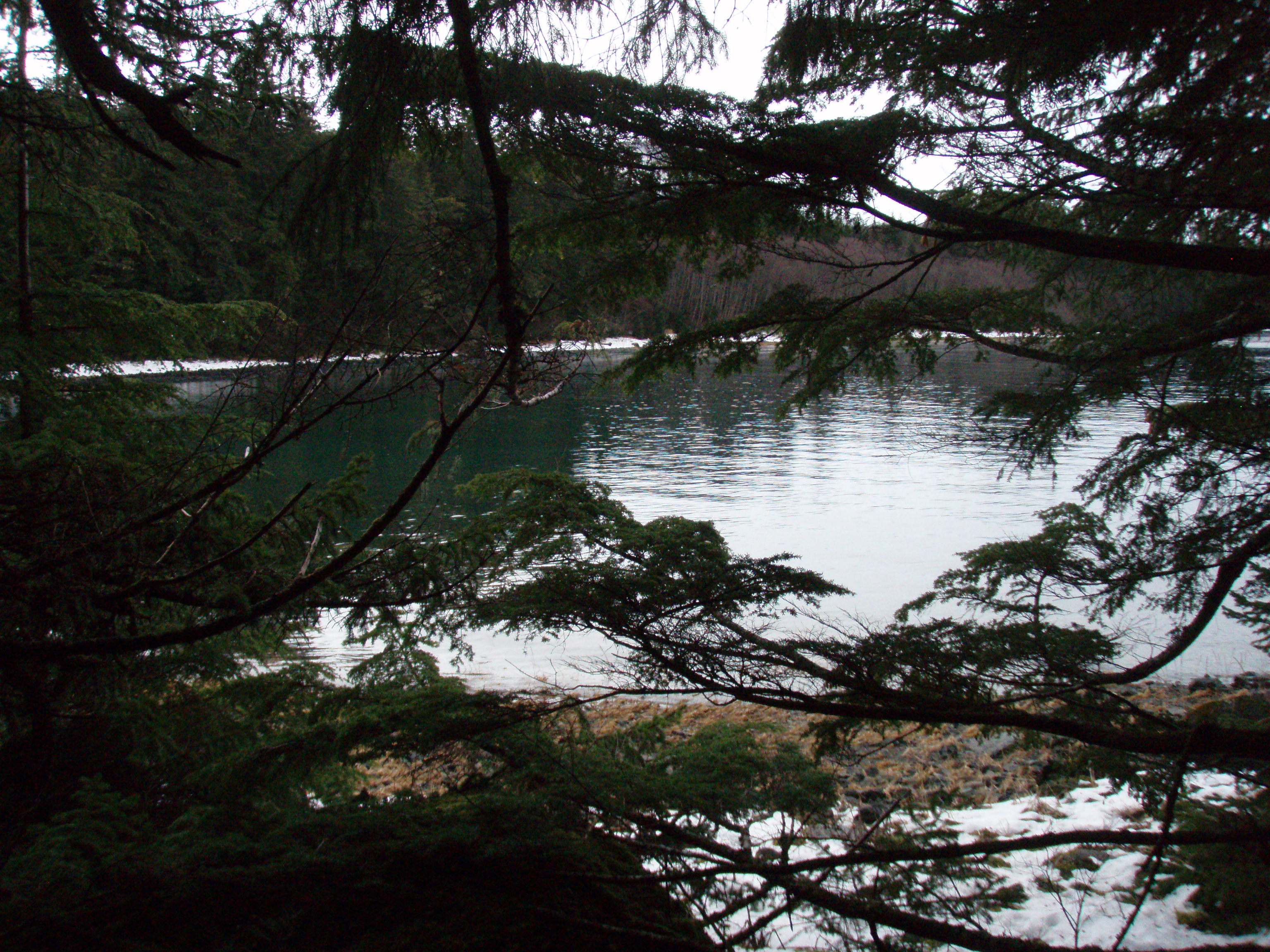 On the way home we pass though a frontier of large alders to the snow covered beach. Each alder trunk bends in an arc toward the water. I’ve misjudged the tide, which continues to flood, pushing us back into the woods. A forty foot granite cliff forces us back to the beach and I have to struggle through the tangle of a downed spruce tree to avoid knee deep water.