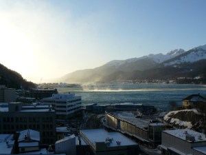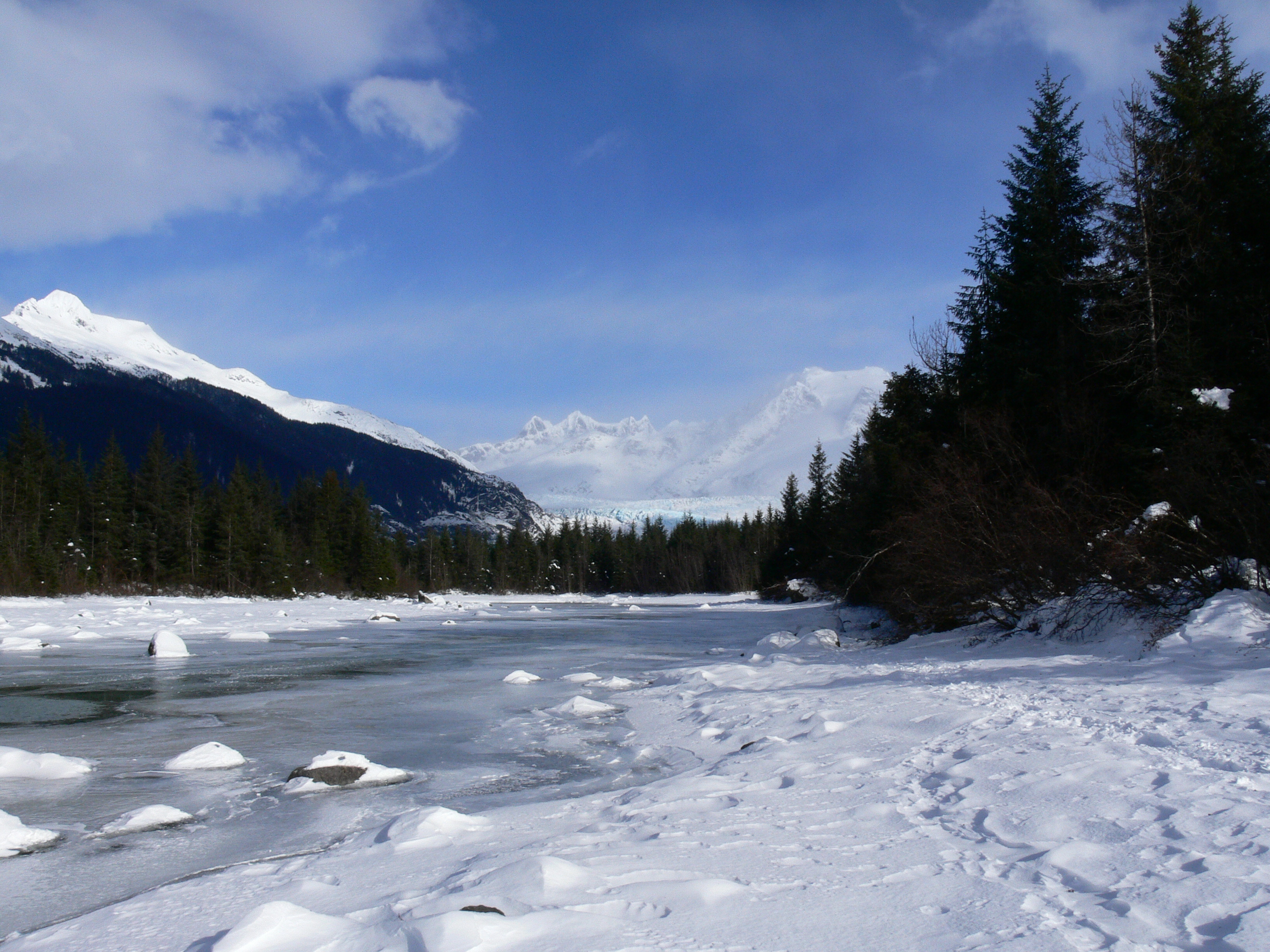 The beaver population is exploding here and their homesteading efforts brought forth floods that limit access to much of the moraine. A recent cold snap followed by a generous snowfall opened the door to exploration of these flooded lands so we leave the set ski track and make our way over them to the Mendenhall River. Snow driven by glacier winds have covered over the boulders lining the river, giving us a rare opportunity to ski along the river to the lake.