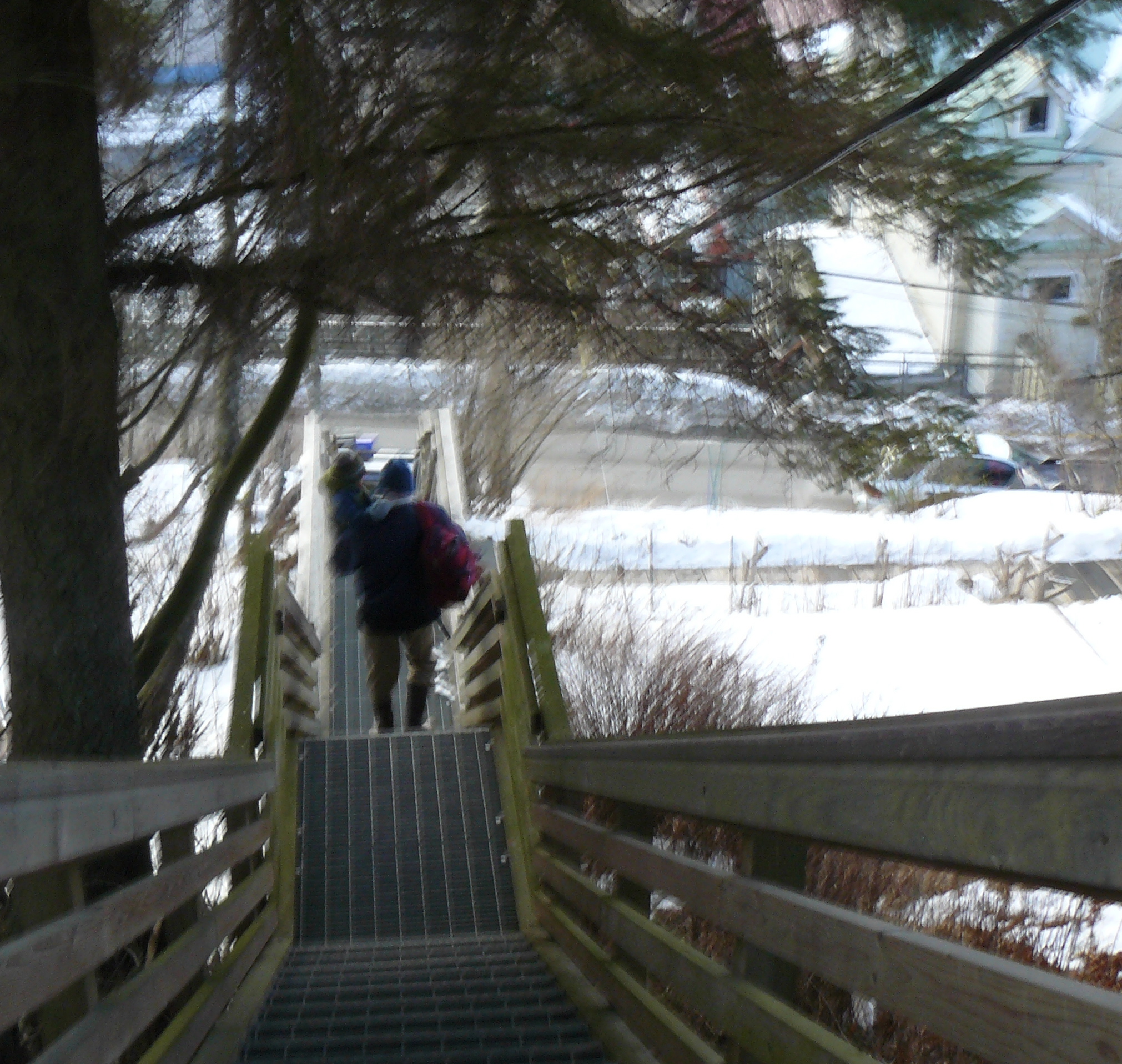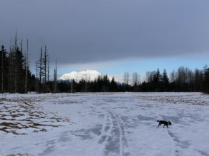 A firm crust covers the pond ice and we move with less effort. I cross animal tracks and Aki quickly follows them to someone’s front door. She answers my call and in a few minute we reach the packed trail.