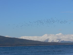 It take half an hour and heavy work to break a trail through blueberry meadows and thin forests to reach a series of beaver ponds that lead back to the ski trail. When I stop to rest Aki paws my leg and shivers. I lift her up and tell her we are almost home.