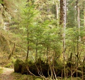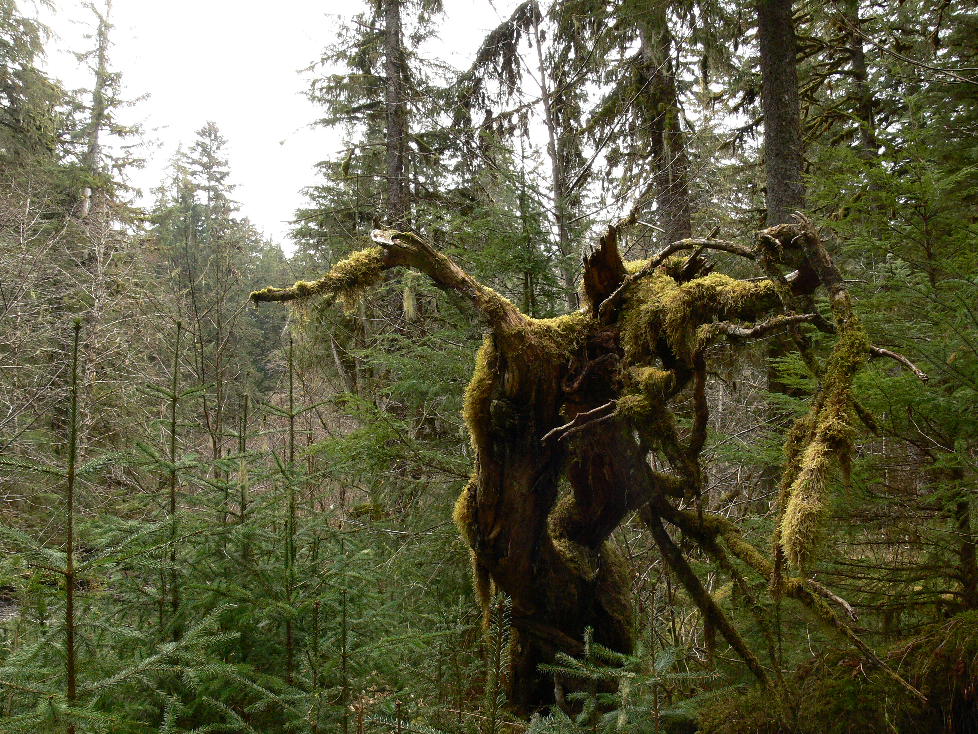 There is freedom of sight for Aki and I in this dormant wood. With the devil’s club restrained she owns the low spaces and runs freely under downed trees. For me, this time without leaves allows appreciation of shapes and running water and, ironically, the force of life. Now I can see unimpeded all the young evergreens sucking life from decaying nursery logs. Nothing is wasted here. I can also see reminders of the salmon of summer that will fill this stream with their dying bodies and these trees with eagles and bears. Eagle feathers are scattered along the trail like bread crumbs. Eagle scat and down cover the ground near the spawning grounds.