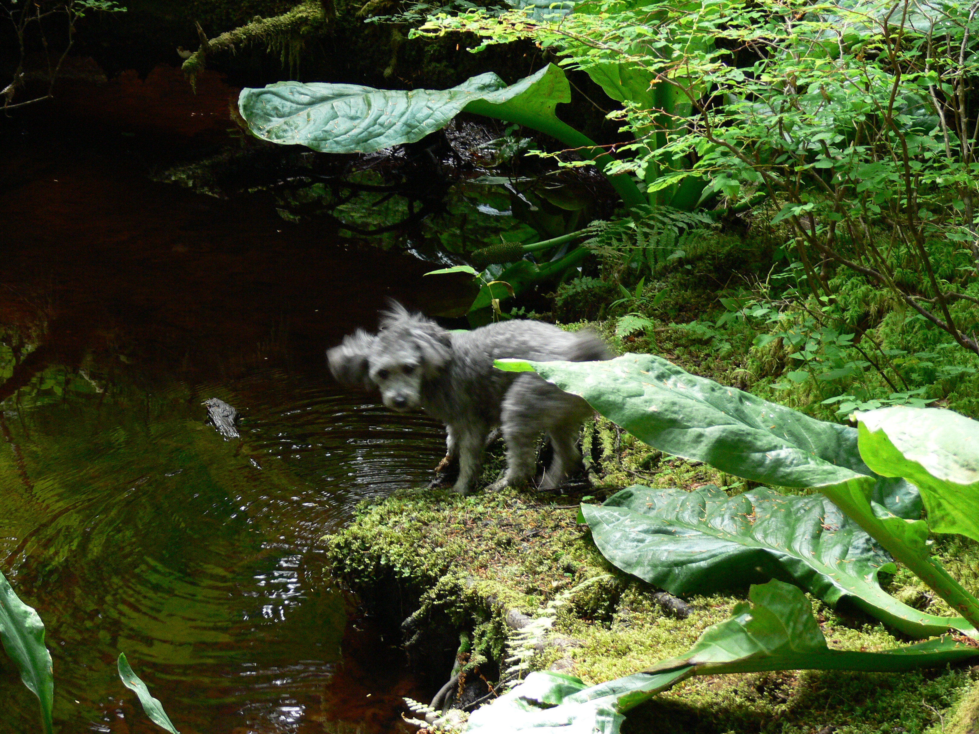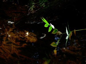 Back in the forest we stop on last time by a small stream cascading over down wood. I listen. Aki drinks of the muskeg brown water while sun light turns a simple green water plant into beauty.