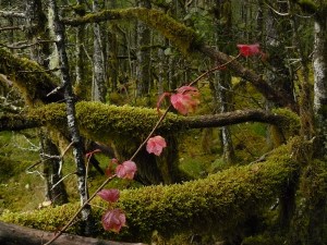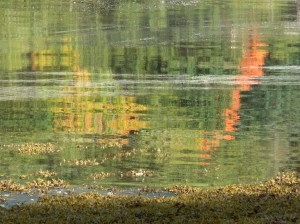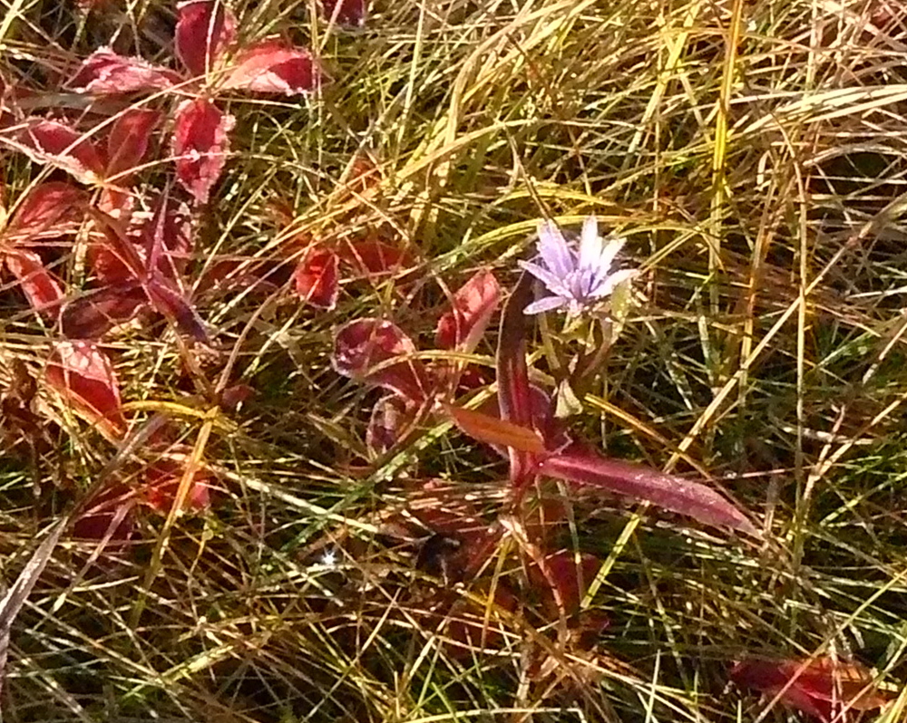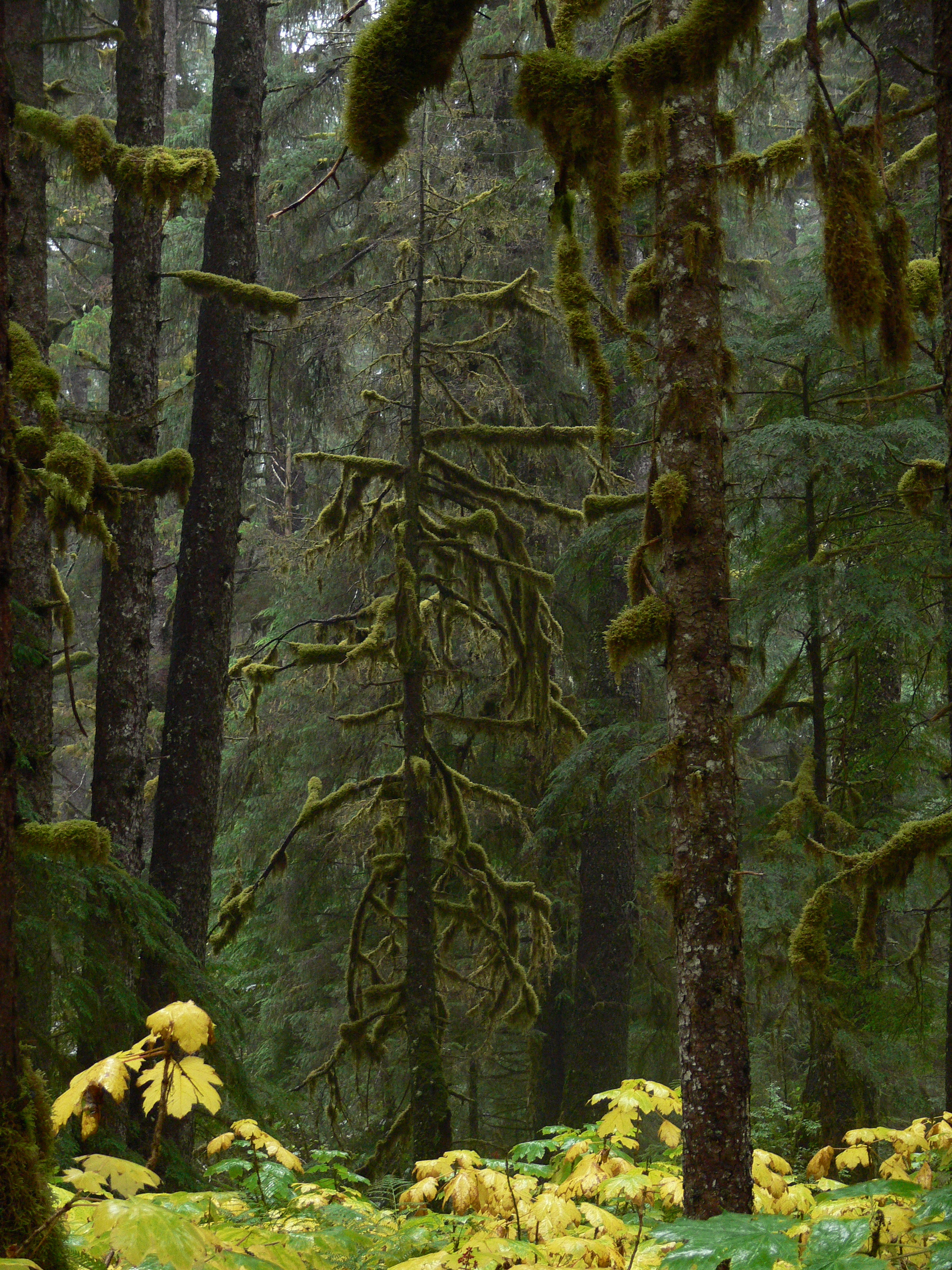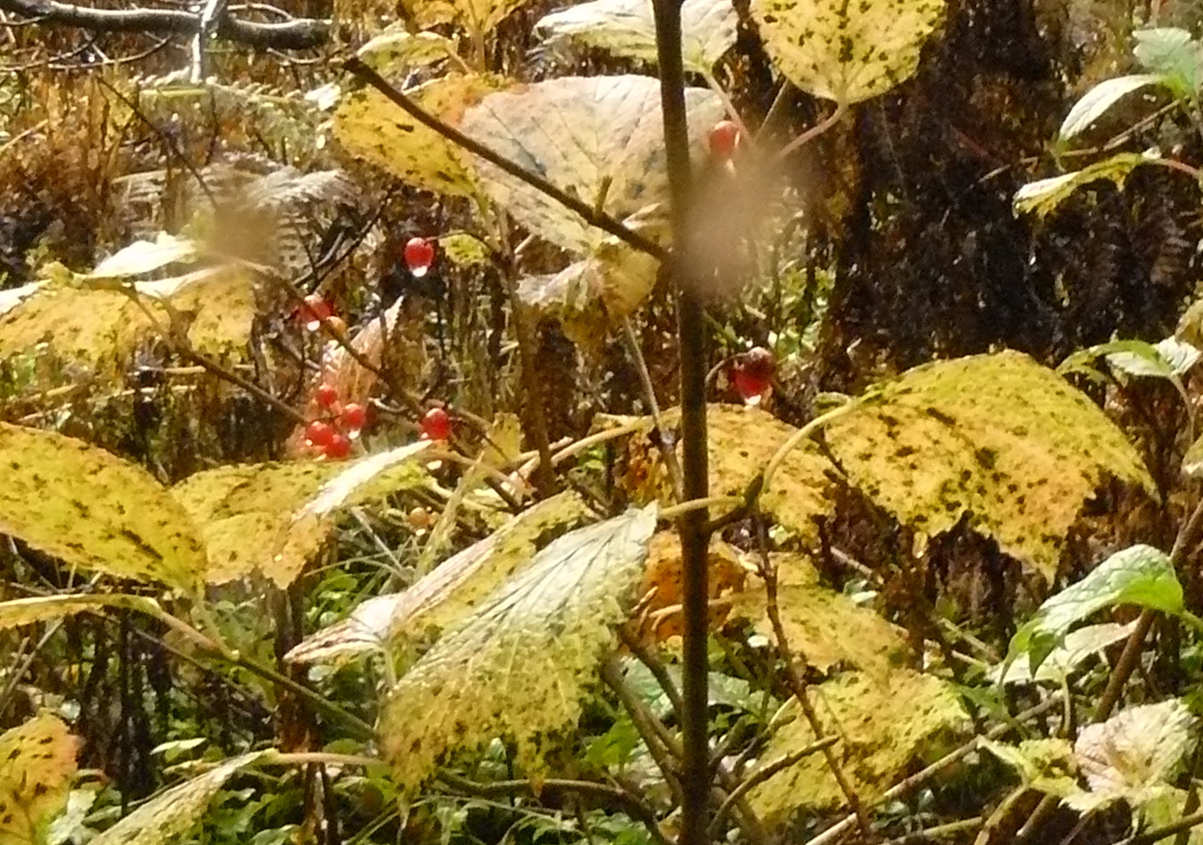 Unexpected horse dung splatters the first portion of the trail but we push on anyway, drawn on by the fading yellow of dying devil’s club leaves and the promise of deep reds and oranges further on. The devil’s clubs have already moved much of their life force to root, leaving rich yellow leaves to brown and fold and drop to ground already covered by browned out ferns. We pass a patch of small plants growing close to the ground, their perfectly formed leaves gone from green to ghost white. Here we start to see horse tracks cutting up the soft trail. The wounds of this domestic are as unwelcome as those of an invader so I take a path less traveled when it forks away the main trail.