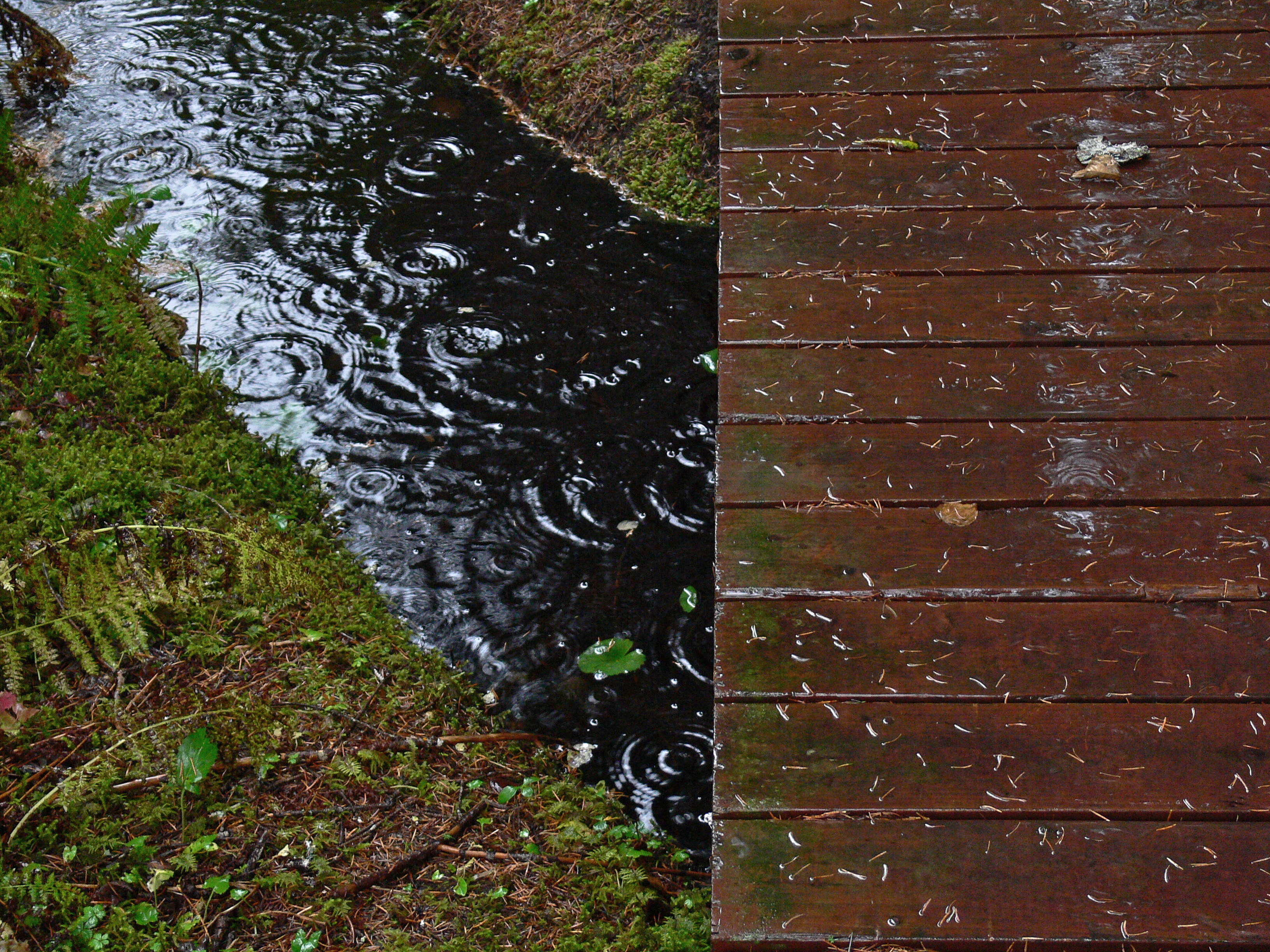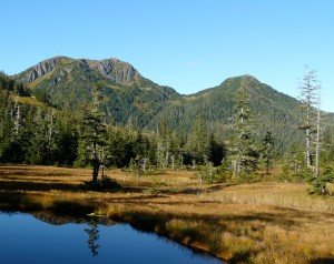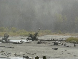 Returning to the main trail where we seldom see bear sign, we find deep reds patches of ground hugging berry plants and bloody leaves on free formed high bush cranberries. On a tidal meadow yellowing grass provides all the color needed to contrast the grey brown river and balance the yellowing cotton wood trees on the other side. The rain still falls as it has done from the start, undaunted by the shafts of sunlight that occasionally power through the cloud cover. By now rain drops spot the camera lens, making themselves a prominent part of each picture —-enhancing the story of how Aki treed the bear as the sun shone and the rain fell and I yelled out my fear.