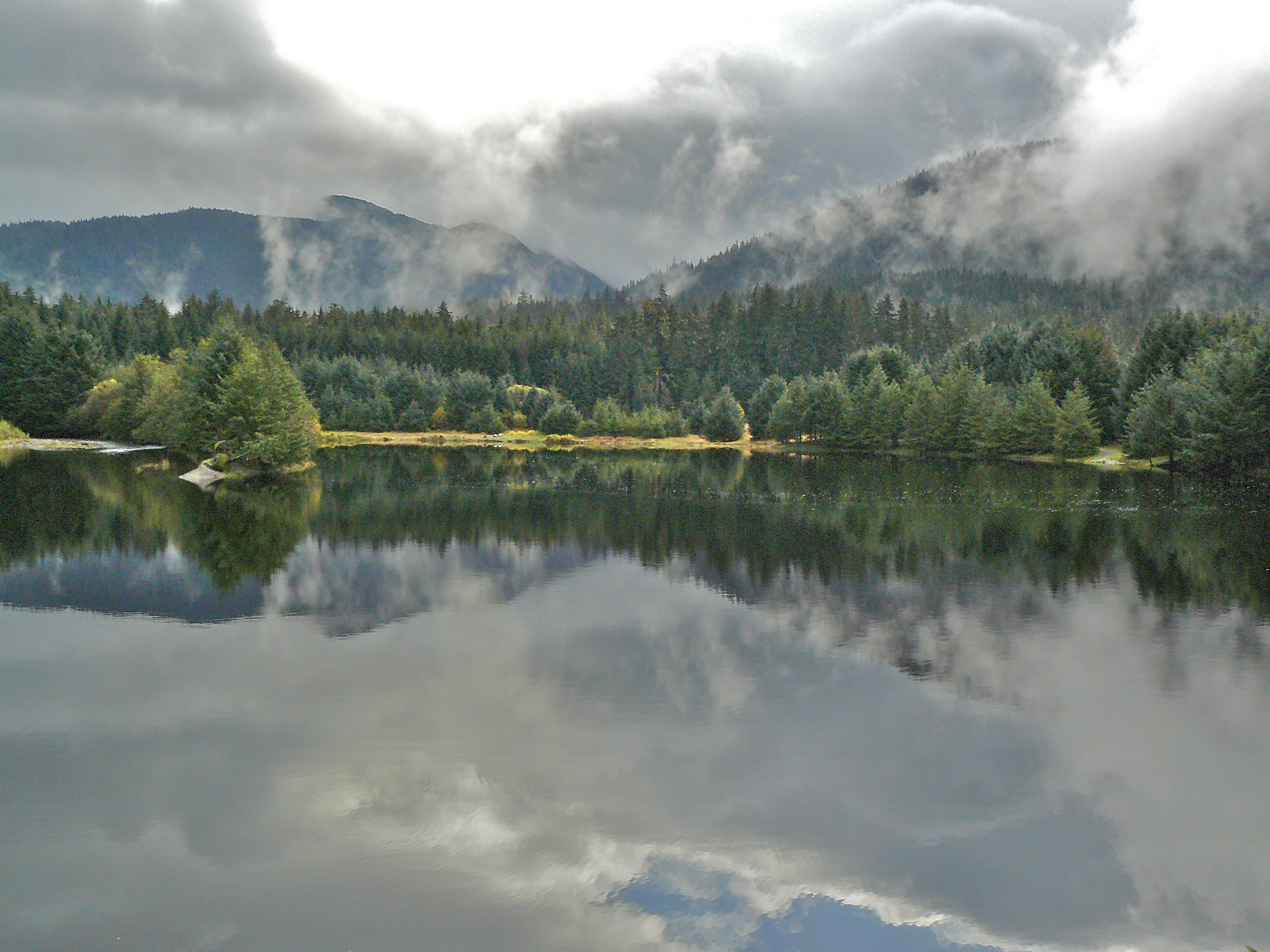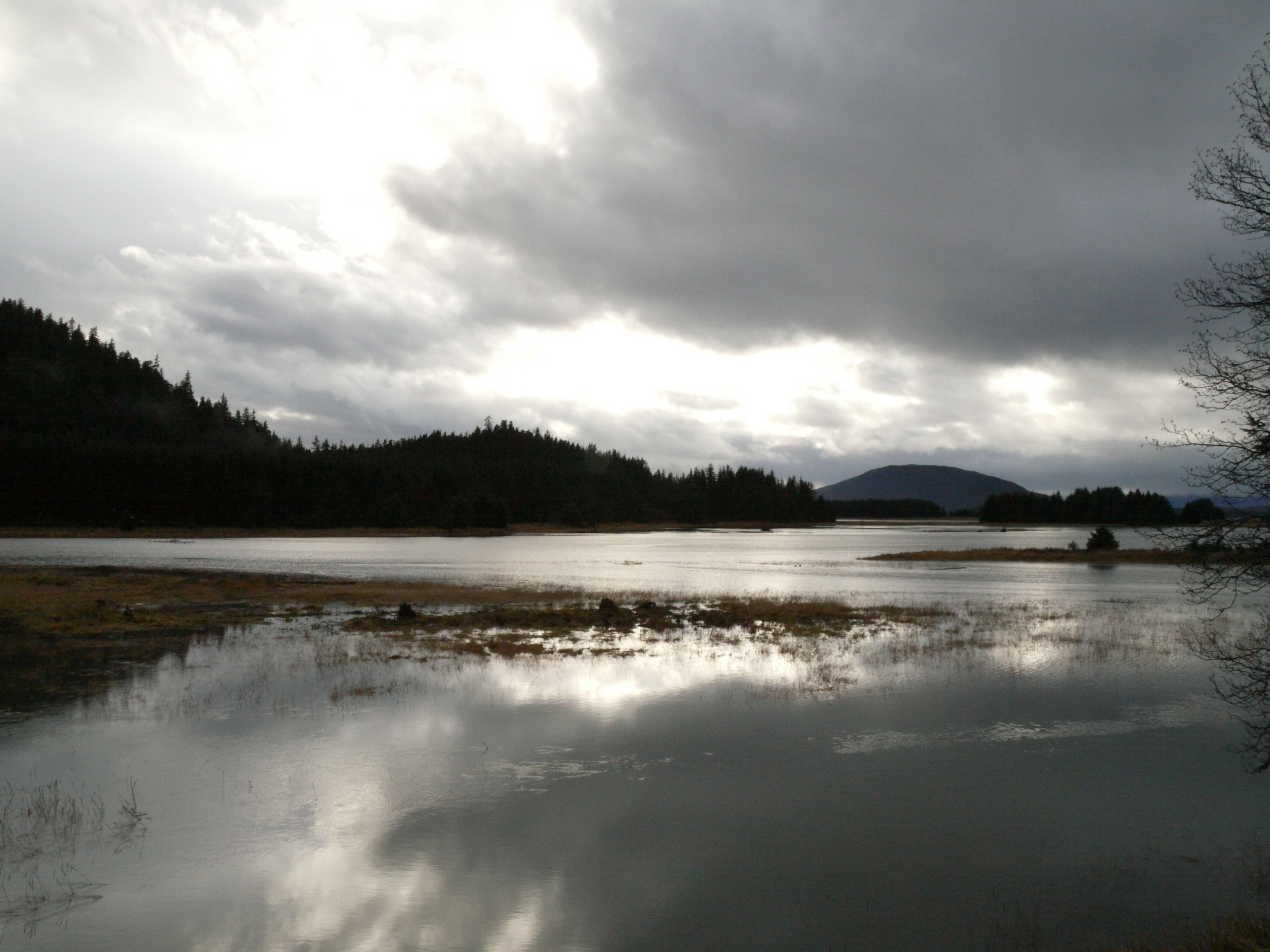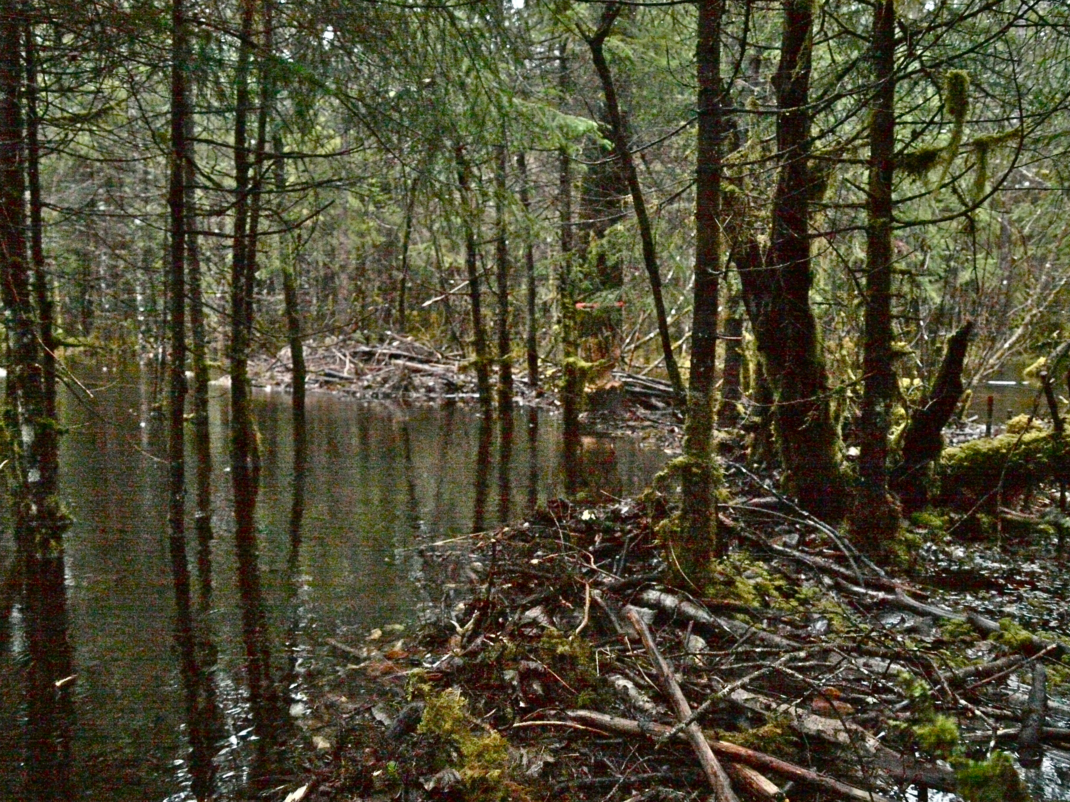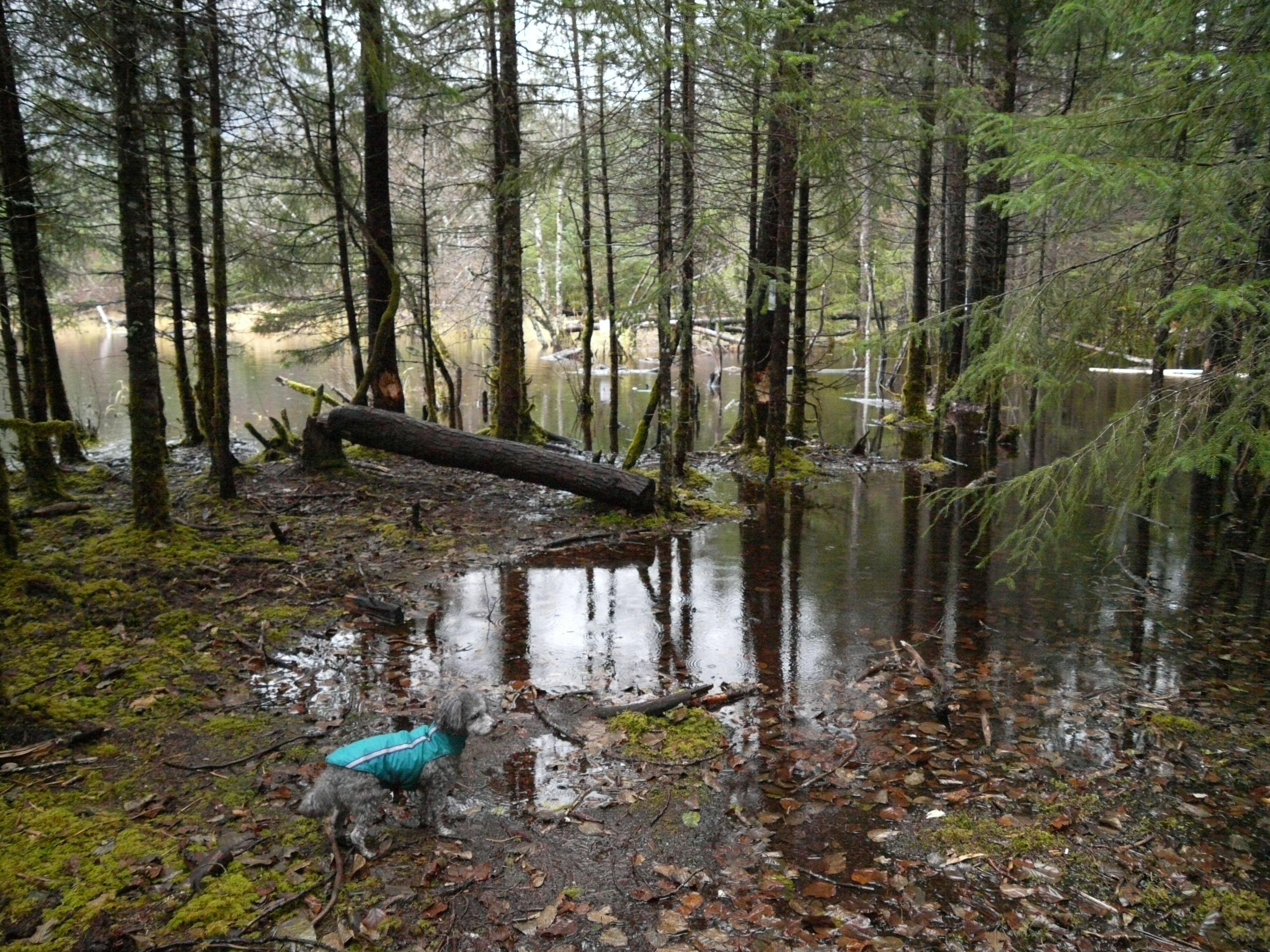 We emerged from the woods onto Crystal Lake. Across the lake a trail runner and his dog forded 100 feet of flooded trail. His trainers sent waist high splashes with steps that submerged his legs to mid-calf. Aki would have to swim it and I am tired of wet boots so we planned another route home. This took us to ground zero of the beaver vs. Forest Service war At the head of Crystal Lake last spring the beavers built a massive dam that turned the area around the lake into a water park. With the Forest Service slow to react, vigilante hikers started dismantling the dam, stick by stick. This concerned the Feds, in part because the dam kept silver salmon out of Crystal Lake where State Fish and Game had just planted a bunch of land locked king salmon. Both sets of biologists warned that the two specifies could not safely share the same water. Last Fall the Forest Service thought they fixed the problem by running a water pipe under the dam designed to reduced the lake water level without allowing a silver salmon invasion.
