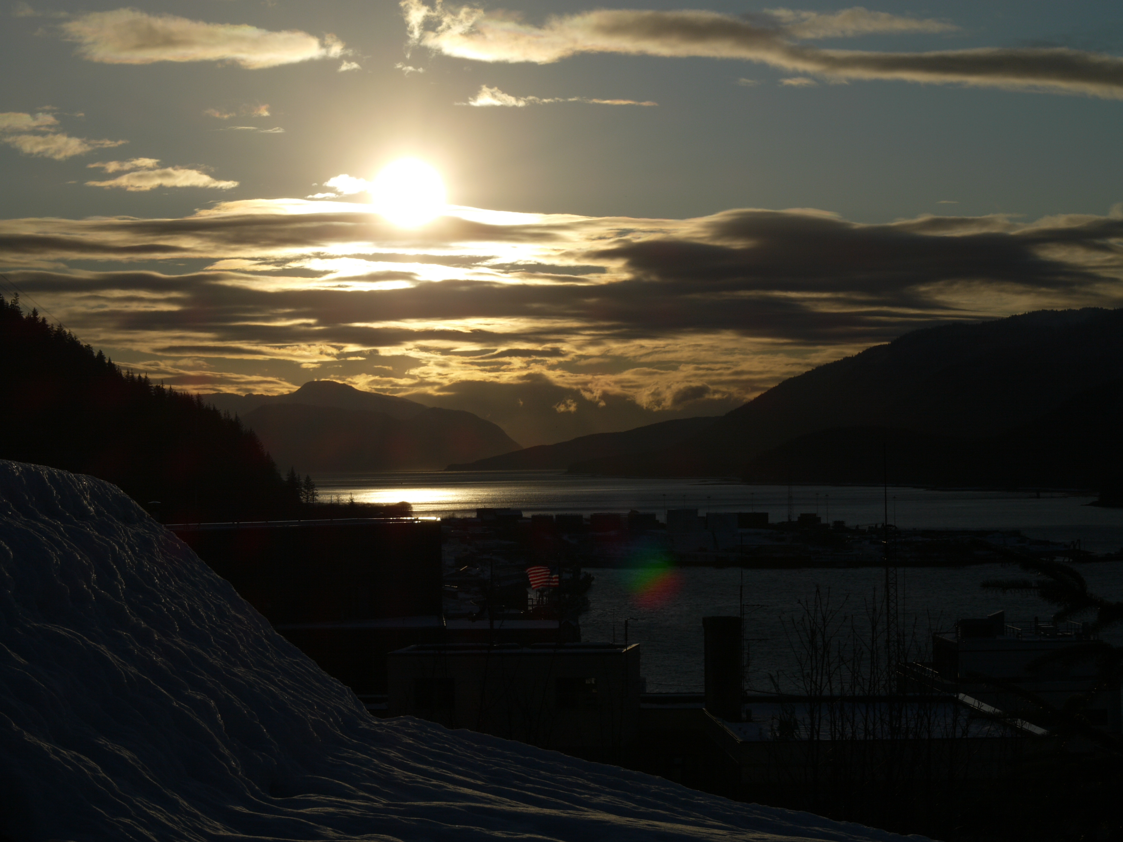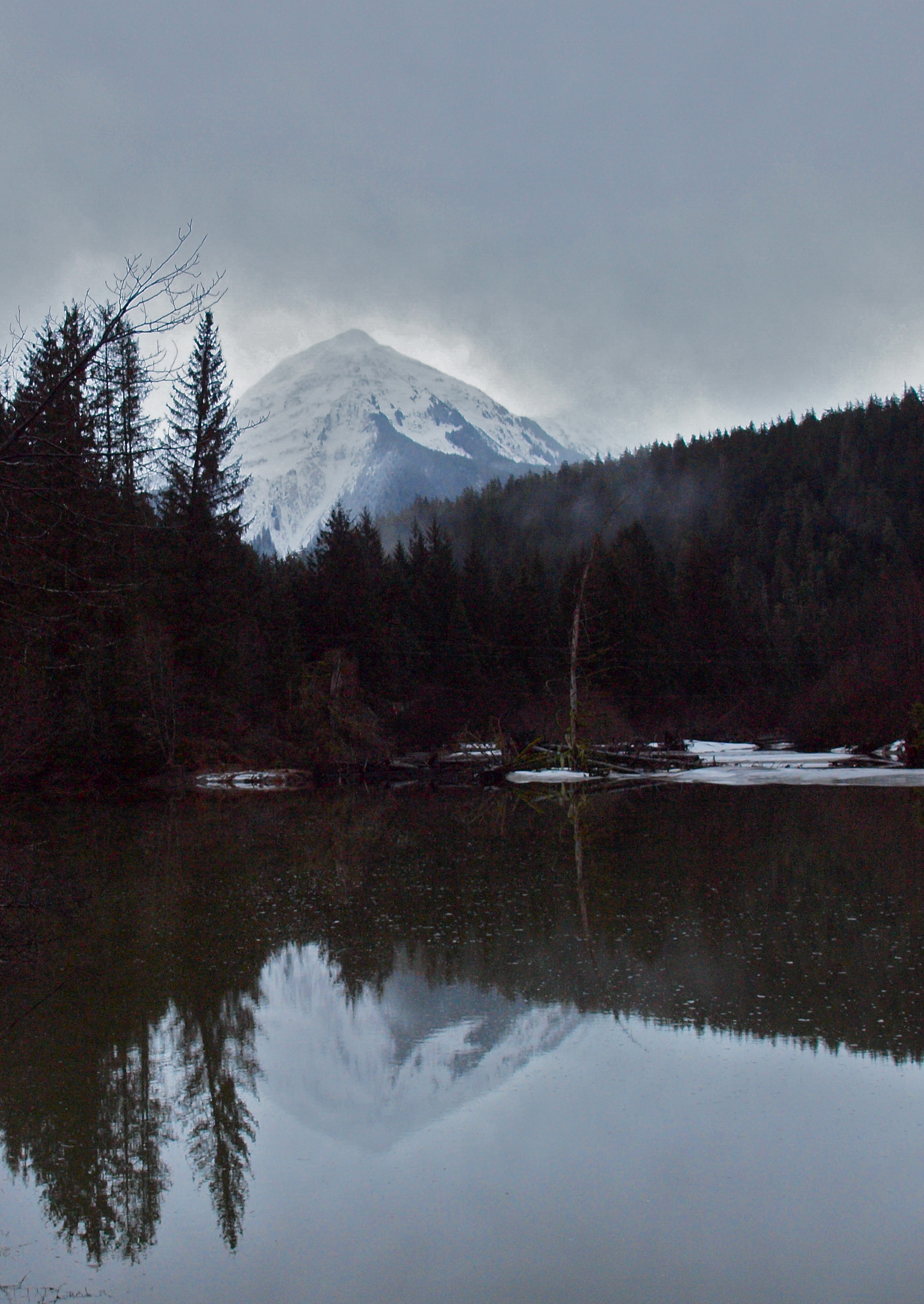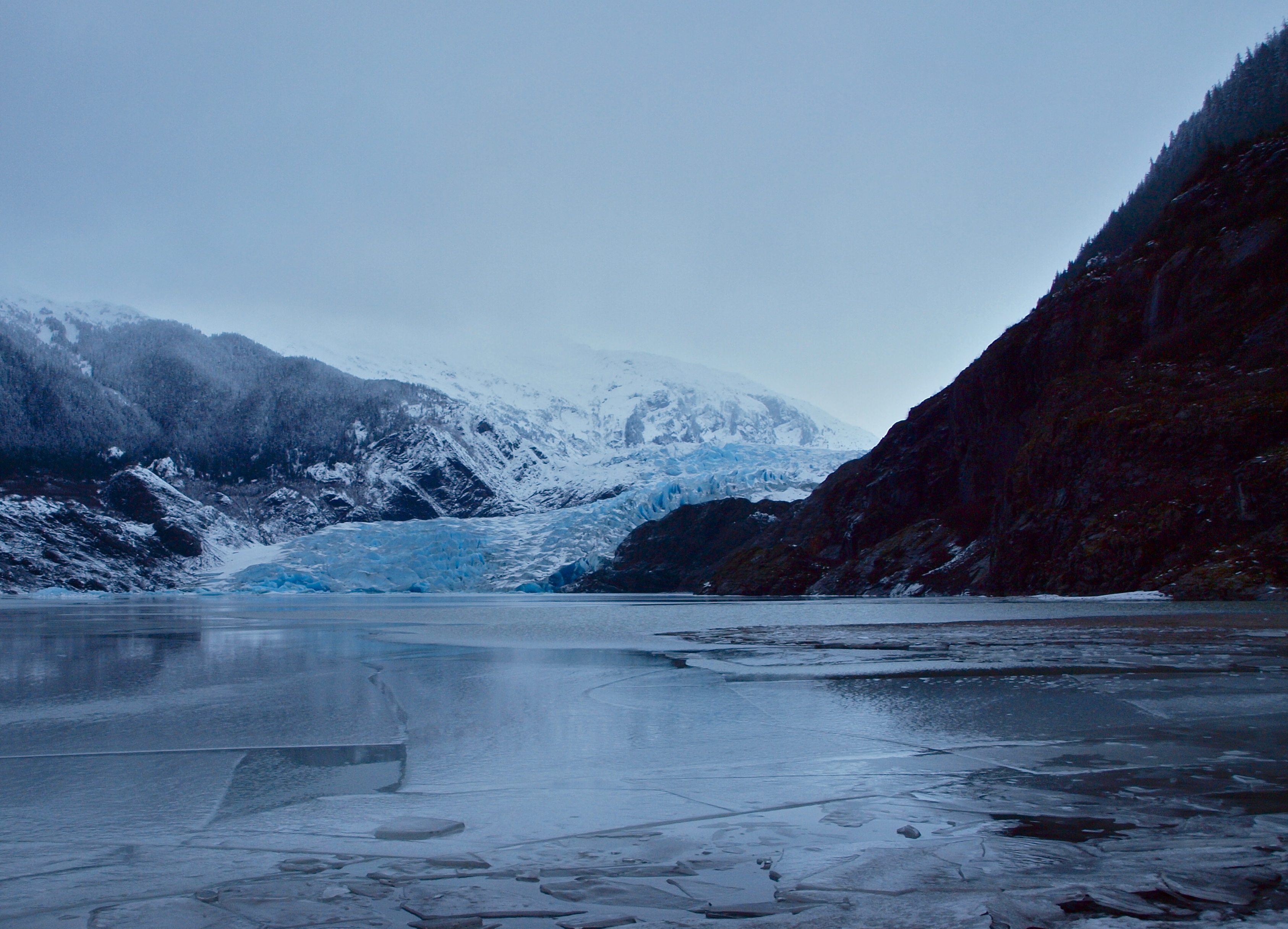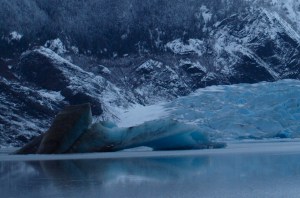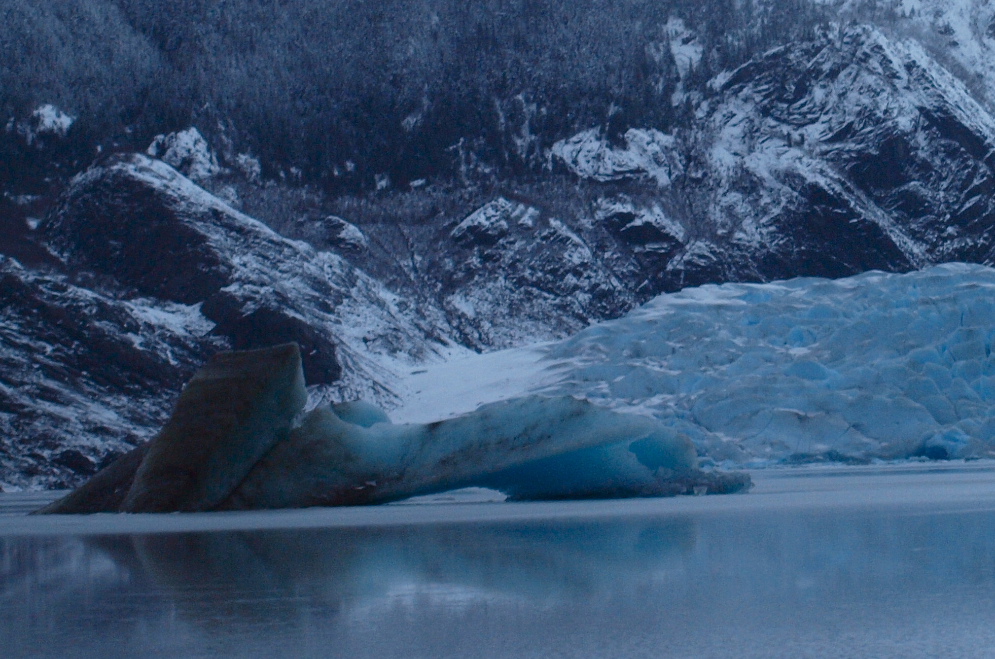 It’s dead calm with high overcast skies when we reach the beach, A scattering of snow flakes float by on the their way to the beach, now expanding with the ebbing tide. The flakes promise a storm as do the pure white clouds quickly obscuring the glacier and its mountain escorts. It hits faster than I thought possible, covering the beach with potato chip sized flakes. We spot a small skiff floating down on the geese on the outgoing tide. “Somebody is going to bag a Christmas Goose,” I tell my self just before as snow shields the birds from the hunter’s view. Their boat passes by without a shot.