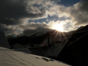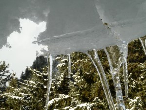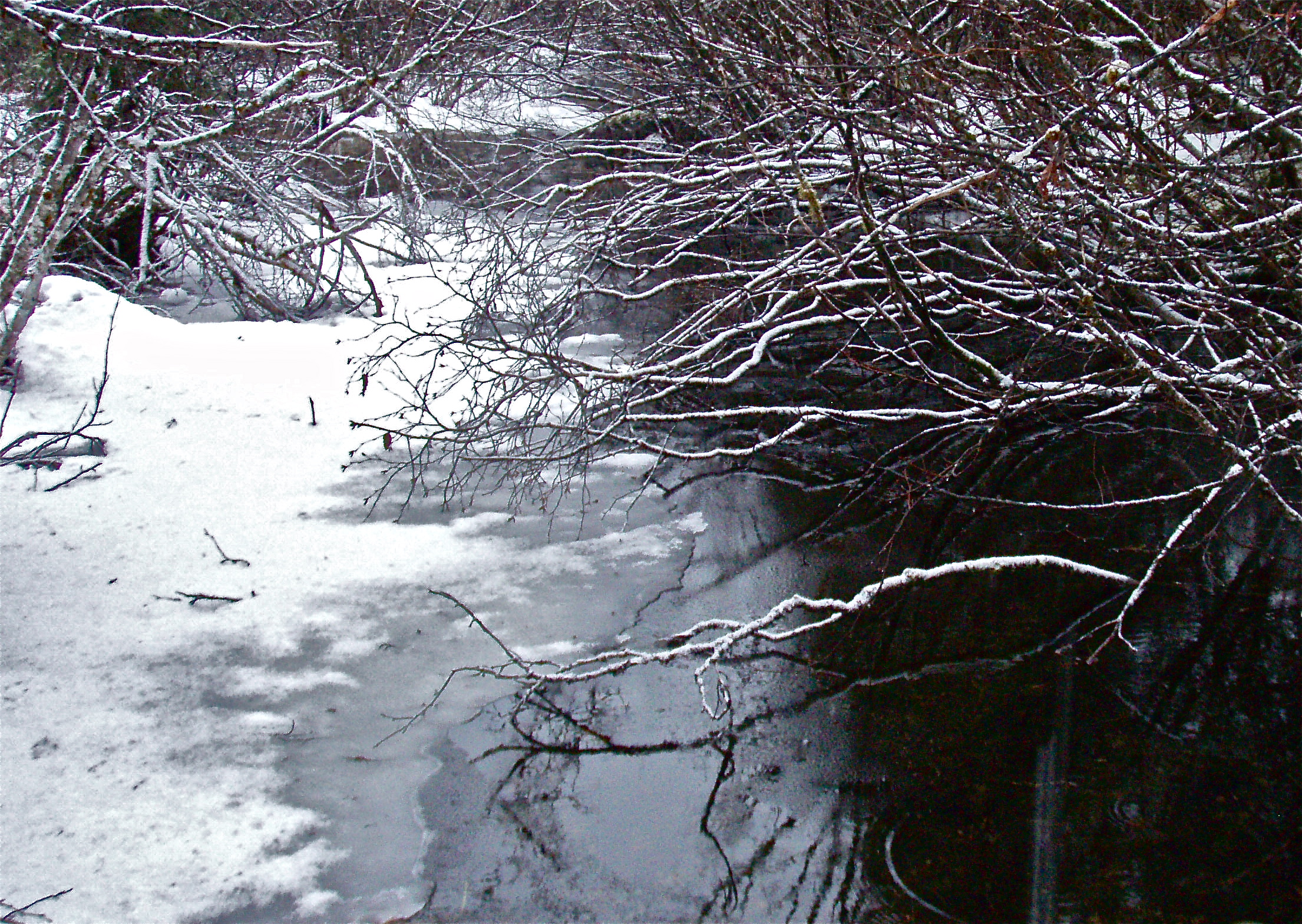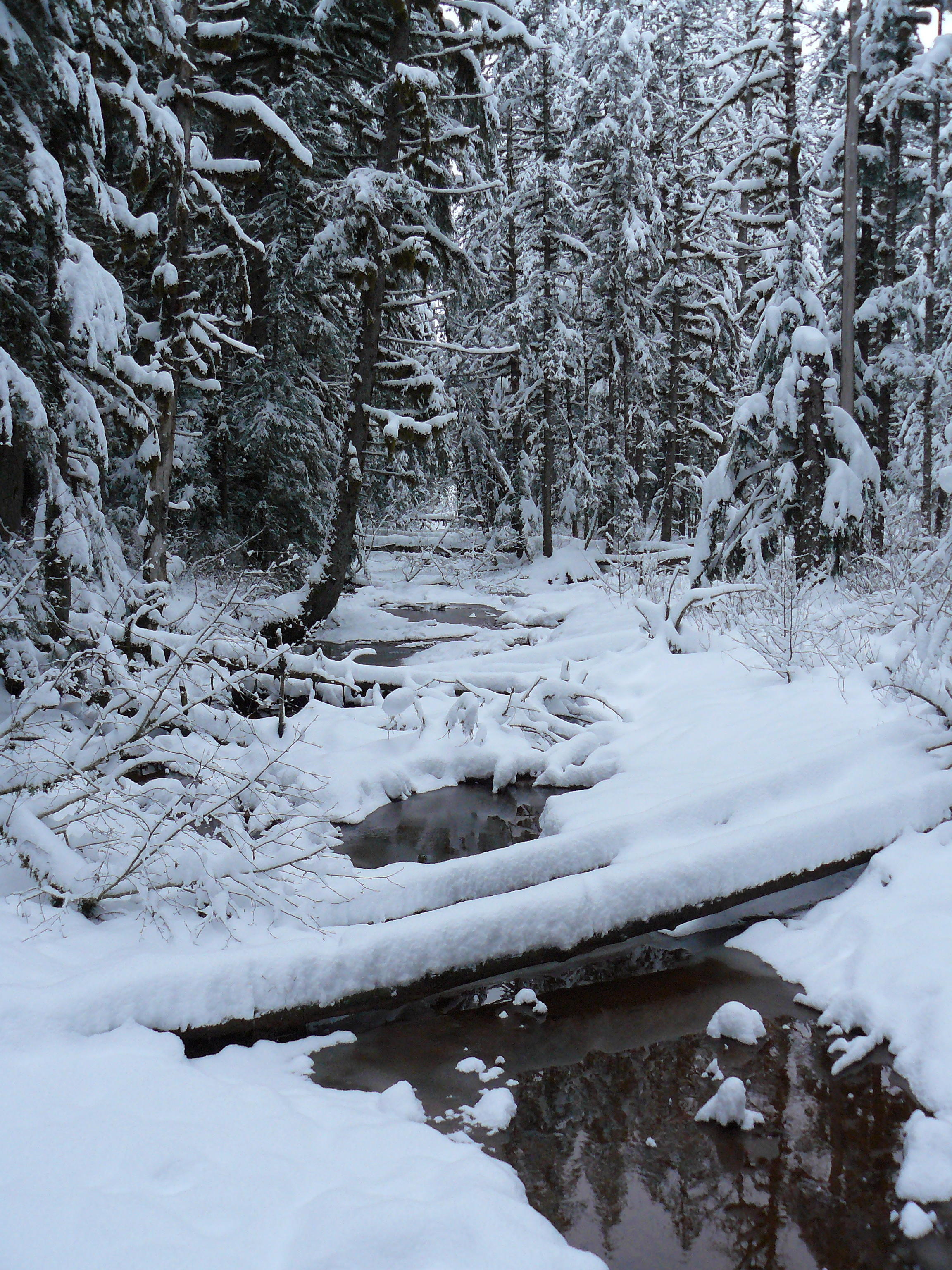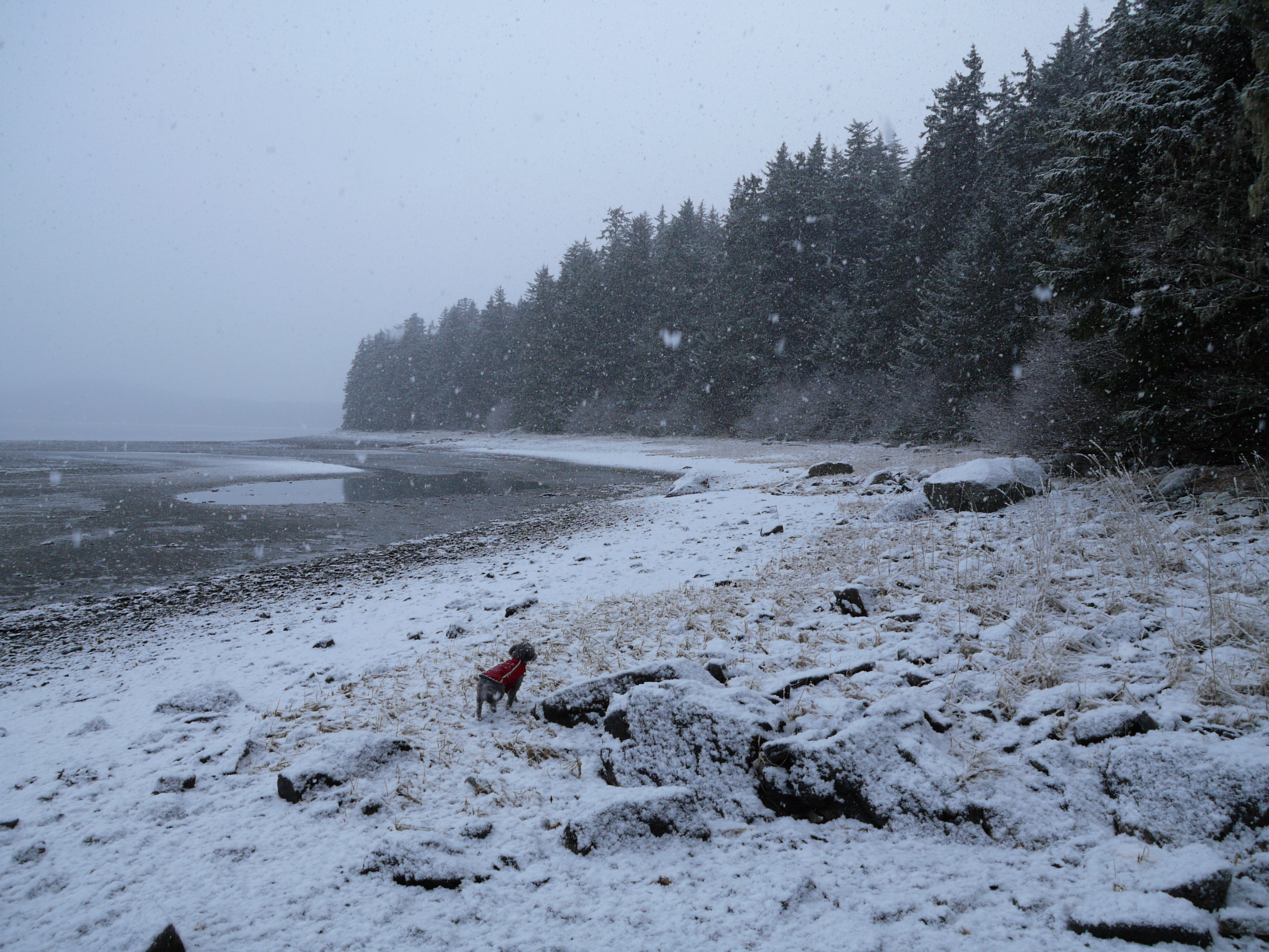 I’m loving the fat flakes of snow and the way they quickly transform familiar beach shapes. This spruce stump, roots facing the sky turns into a frosted Hobbit hole; that plane of sand, a winter stubble field. The snow silences everything but the ocean swell, which produces a surprisingly deep base sound when it hits the beach.