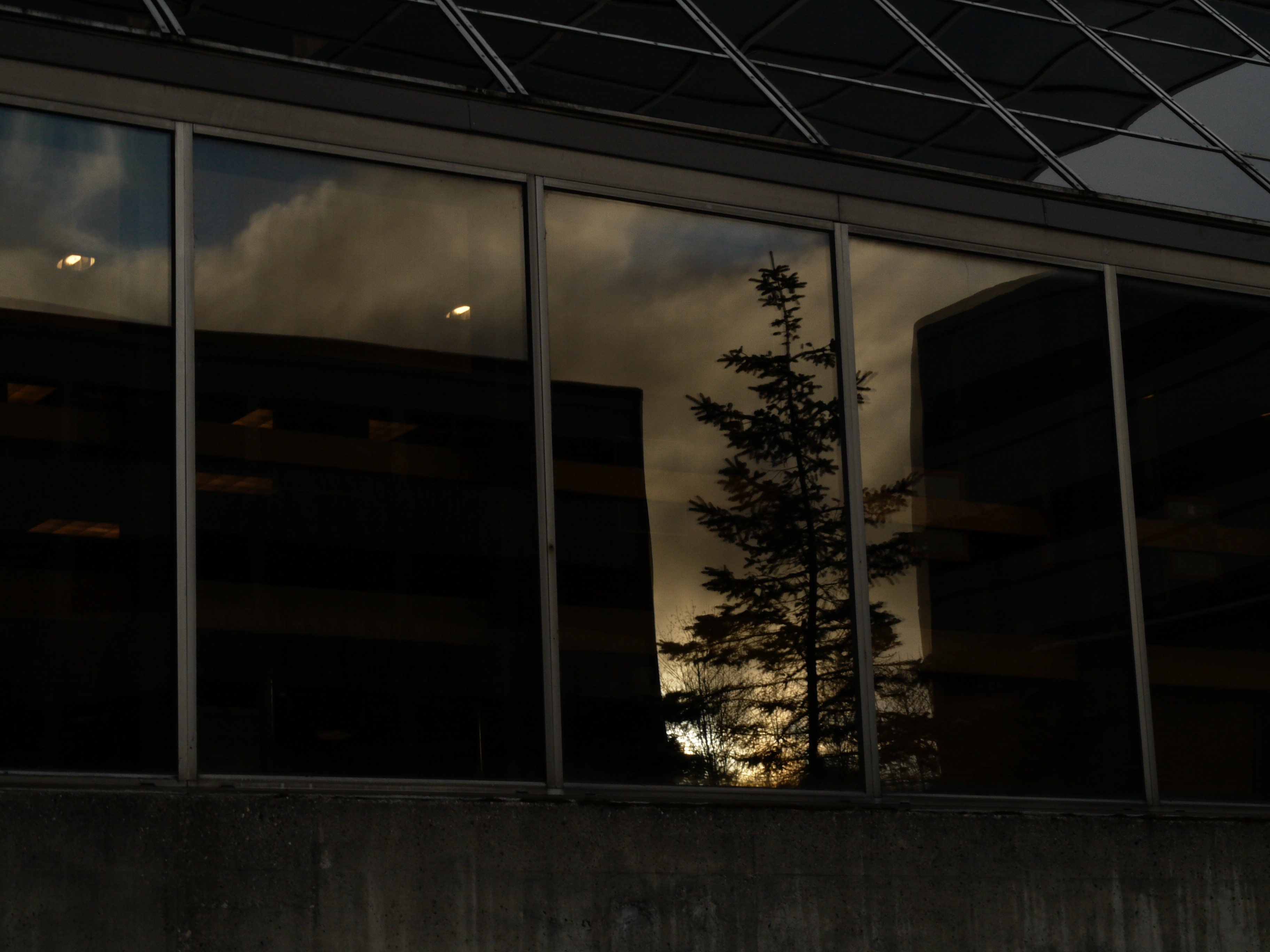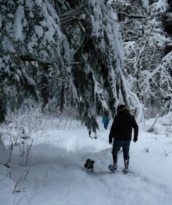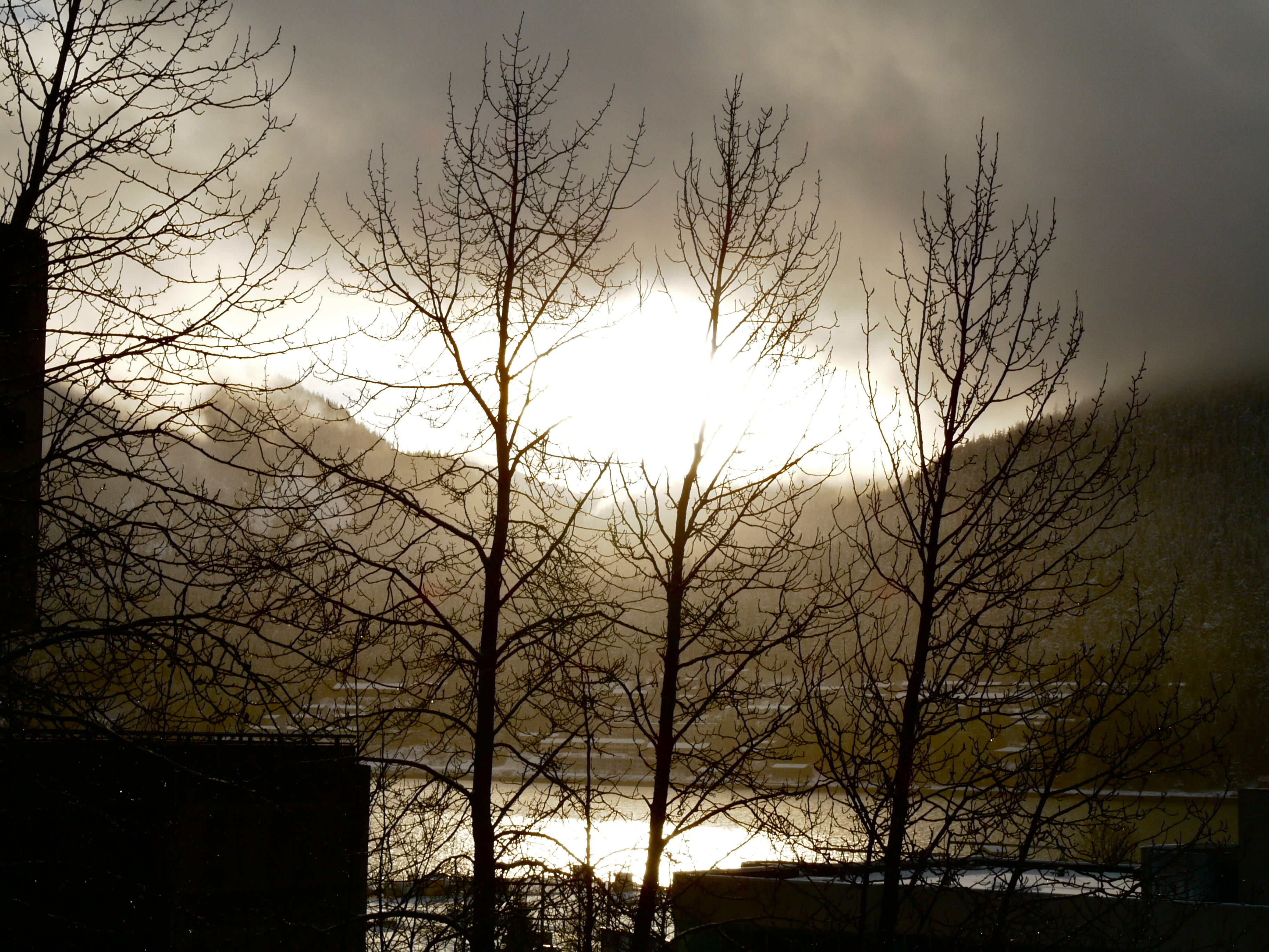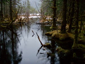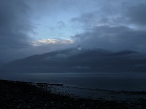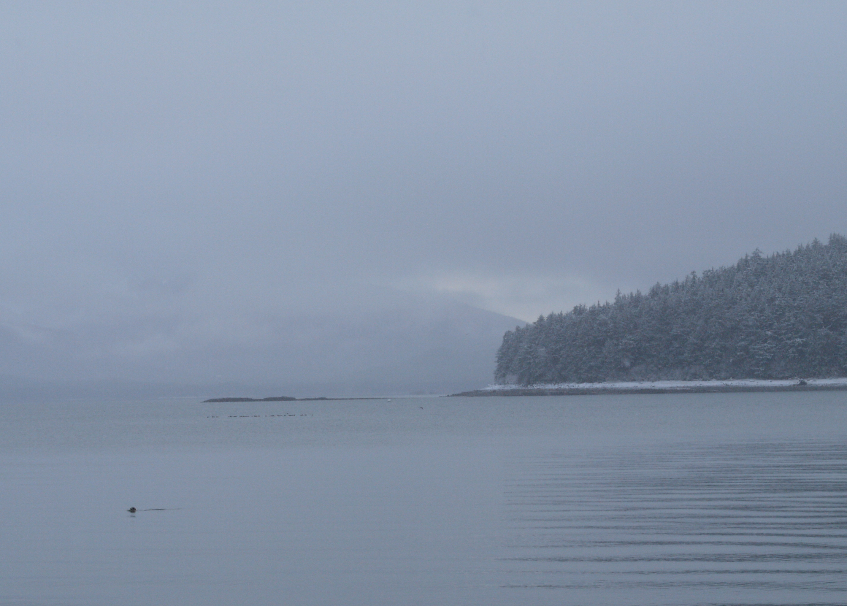 Just offshore a seal moves above the water surface, in this light a body-less head. Closer in a common loon pops to the surface then floats off with the tide. The storm is passing now and the clouds over Douglas Island part enough to reveal a rough patch of pale blue sky. Then, hunters embedded across channel restart their war on birds. This doesn’t bother the geese in their splendid isolation on the mud bar but it does worry Aki. She insists on continuing down the beach, which would mean walking a five mile loop to get back to the car. We reach a compromise that has me carrying her to where the forest trail begins. She looks foolish and I feel the same as 300 geese cackle at our passage.