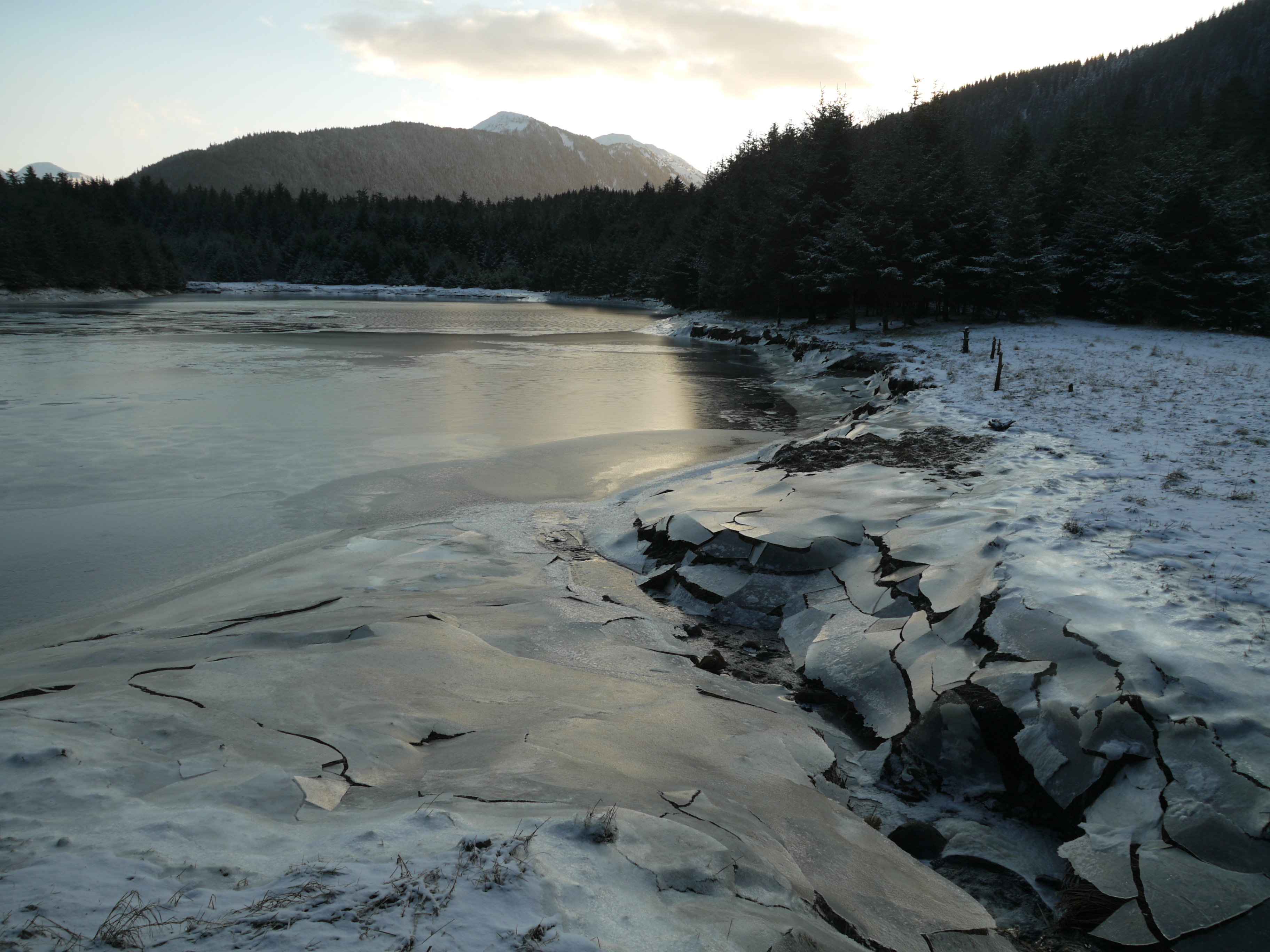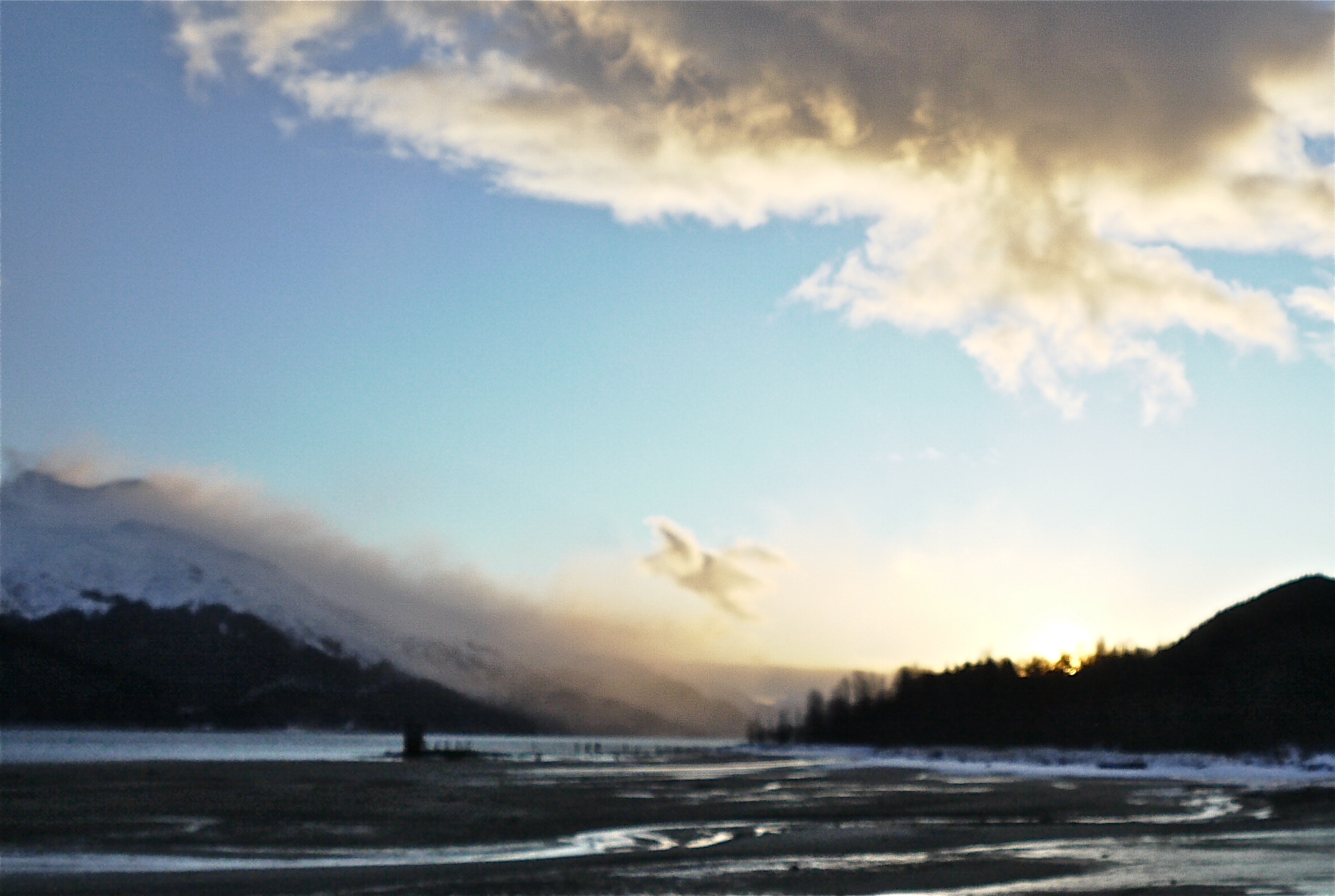 On this rare sunny Juneau day Aki and I walk on the dark side of Douglas Island. We came here for the shelter it provides from the Taku winds now hammering Douglas Town and Southern Gasteneau Channel. The picture above, for which I gave up feeling temporarily in my right hand, provides testament to the power of wind. What looks like fog patches hanging on the mountain sides are actually plumes of snow being blown far over the channel. The winds. borne in the Yukon are strengthened by passage over glaciers.