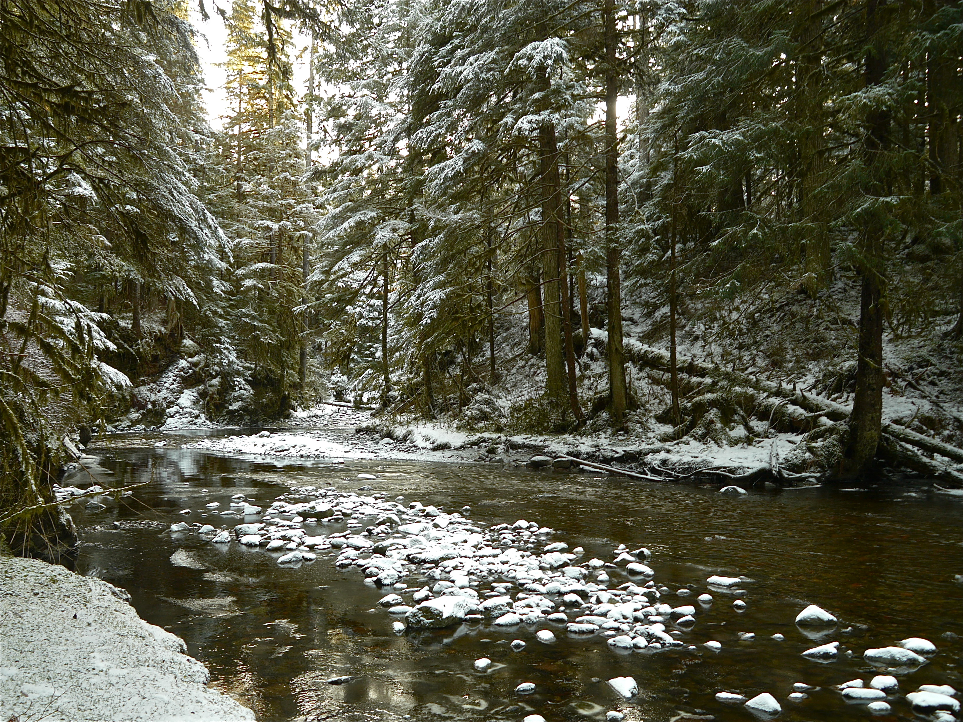 Even without the wind this creek side trail offers a cold passage, which seems to energize Aki. She dashes ahead 20 or 30 feet, snatches a sniff and dashes back to me. The old growth canopy kept out most of yesterday’s snow fall so the walk is dominated by the green, brown, and gray colors of a resting forest and the deep brown of the creek. Snow capping half submerged stream rocks and downed tree snags bring some brightness. Otherwise we have to look to the tree tops for even a hint of sun. There blue mixed with the colors of sunrise bleed through the trees. I find a perfect reflection of this in the stream but is is gone before I can record it with the camera.