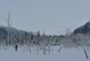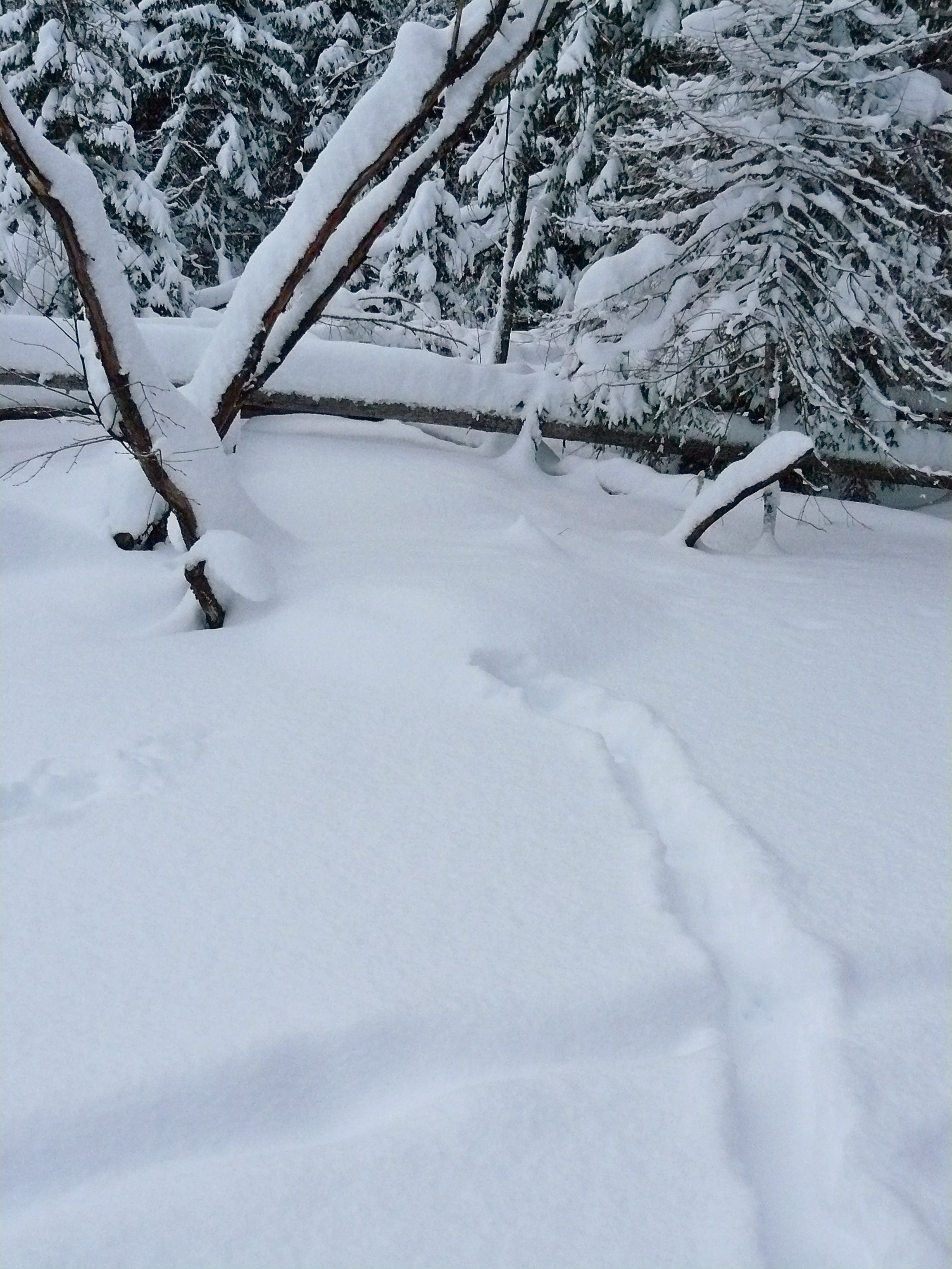 Its been all snow and no rain since the last hard freeze—that one that firmed up the beaver flooded trails through the moraine. Not knowing when a Pacific low might ruin everything with warm temperatures and rain we return, finding more than a foot of unsettled snow covering the trail. Fortunately Aki’s other human skis with us. The dog, no fool she, allows us to break trail so she can trot along behind.  I wouldn’t mind the sun to blink through storm clouds to light up the mountain tops or this abundance of snow. But today the sun leaves us alone in a land of white and gray.