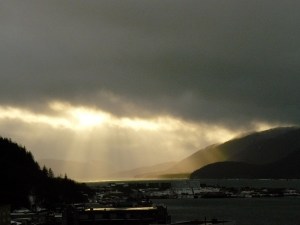 Violence in weather often brings at least one moment of beauty. In Juneau it usually comes just after scheduled sunrise but before the day’s storm winds build to full strength. This morning, after being driven without mercy by 4o knot winds, the clouds over Gasteneau Channel lost cohesion and let in a pyramid of light. It brightened the channel water and the houses of the hardy few living at Lucky Me. Something made precious by the knowledge that it would disappear in minutes.