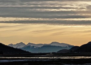 The start of this day of the walk promised spring like weather but delivered gray skies and a chilling wind. We should be in the thick woods by the glacier where the day’s 40 degree temperatures would not have to fight with wind to set the tone. Instead we are crossing a slick patch of ice formed on the Wetlands above the high tide line. Down channel a sunrise streaks the sky with strips of gray and weak orange light.