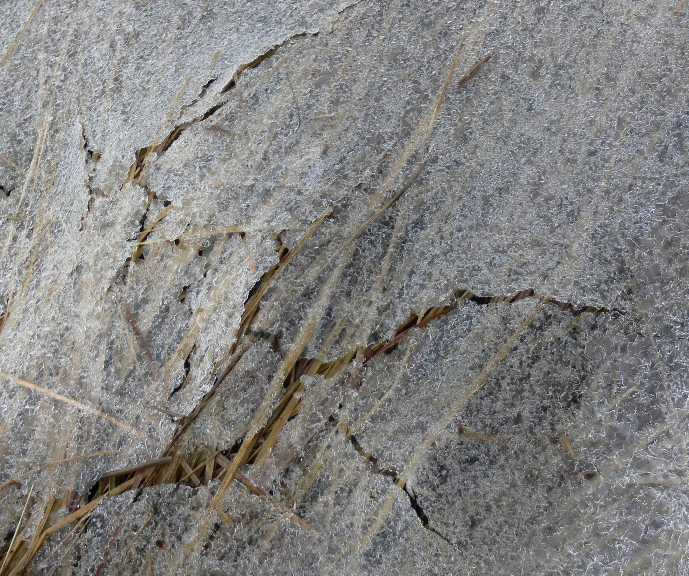 Aki finds a long strip of snow perfect for her diving then rolling game. My boots crunch with each step after I join her there sending seven Canada Geese breaking for the sky. We return to grasslands when the snow strip ends. Here a paper thin layer of ice lays like a sheet over the tussocks of flattened grass. Only frozen salt water has such flexible strength. Several things had to happen at the same time to create this. This fragile sheet of ice would not be here if the last night’s high tide hadn’t manage to cover the grass just as the night’s temperature dropped enough to freeze it into this thin white covering. I wonder at the purpose of covering beaten grass with a beautiful translucent sheet when we hear the nervous cackling of worried ducks huddled 50 feet away. They burst from cover and fly deeper into the wetlands, necks stretched out, willing more speed. Aki looks away as if embarrassed by their cowardliness. If she would understand I would tell her that they are only driven by the will to live.