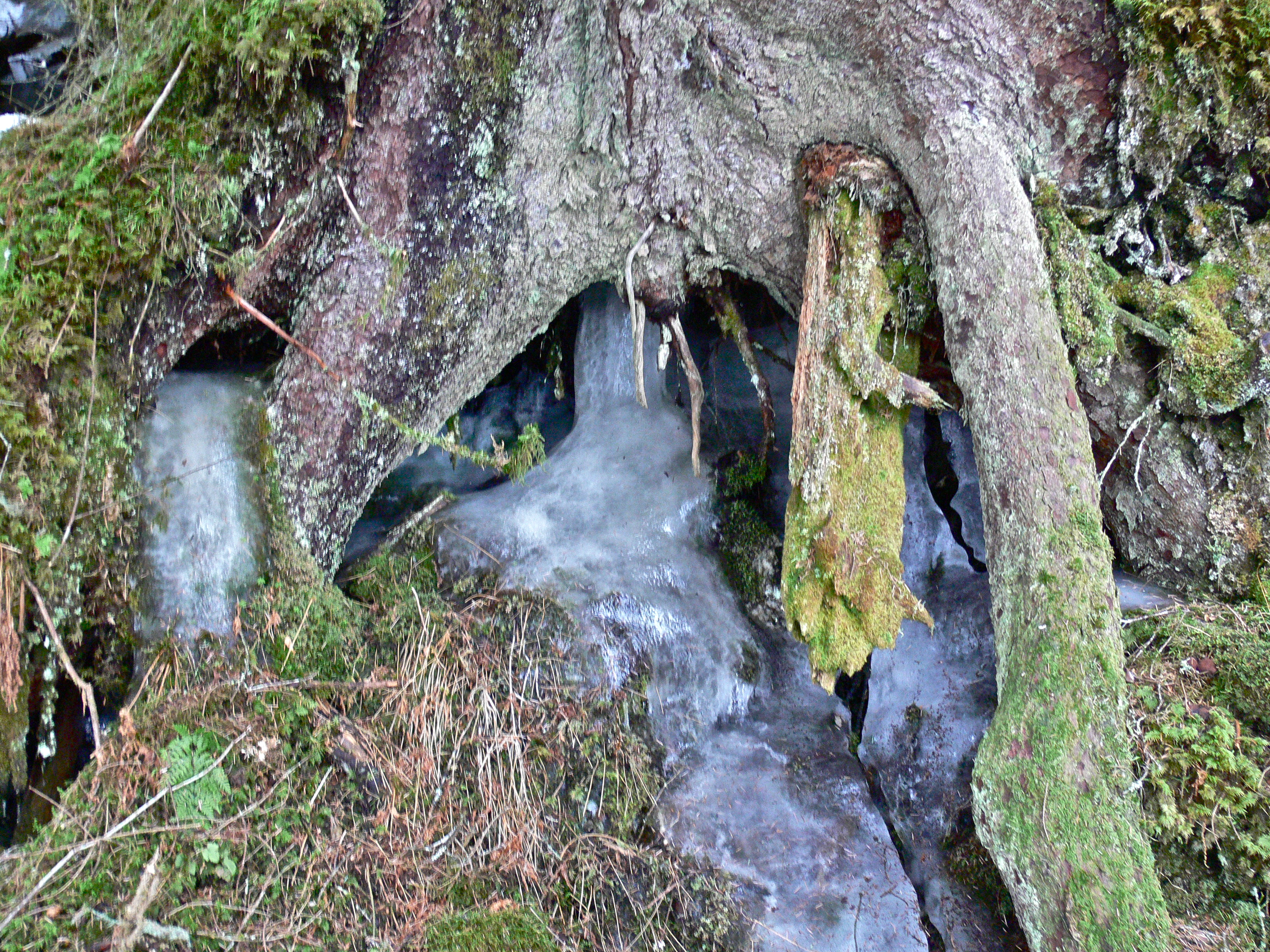 Without boot cleats this trail is impassible. It is worst where it runs along a long shelf cut into a steep hillside. Great gray stalactites of ice cling to the uphill side of the trail. Water seepage flows over them and then onto the trail, making it even slicker. Most of the columns cling to the face of flat granite rocks embedded in the hillside. A squatting spruce appears to be giving birth to an ice column in a cavity left when the soil eroded from between its spreading roots.