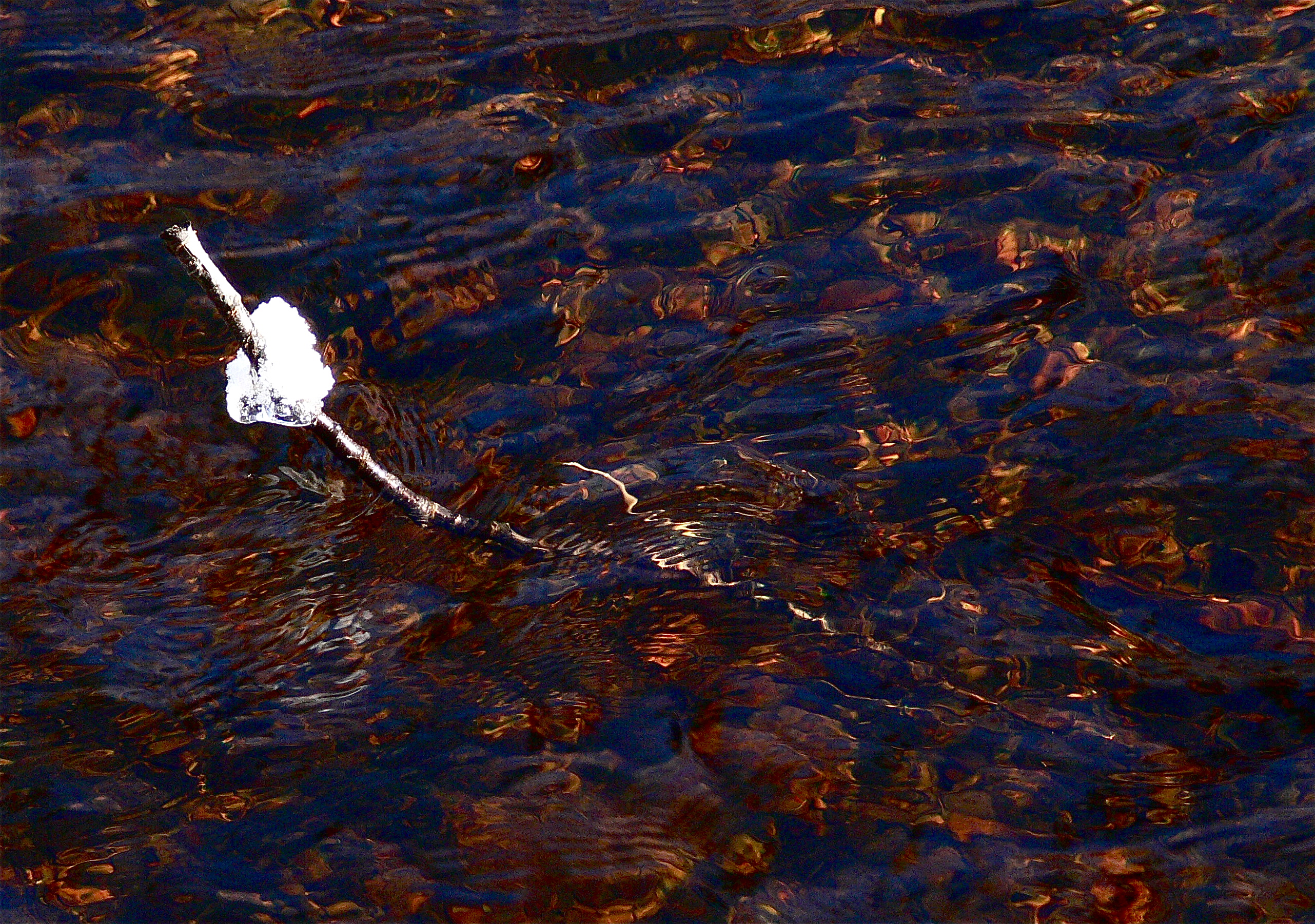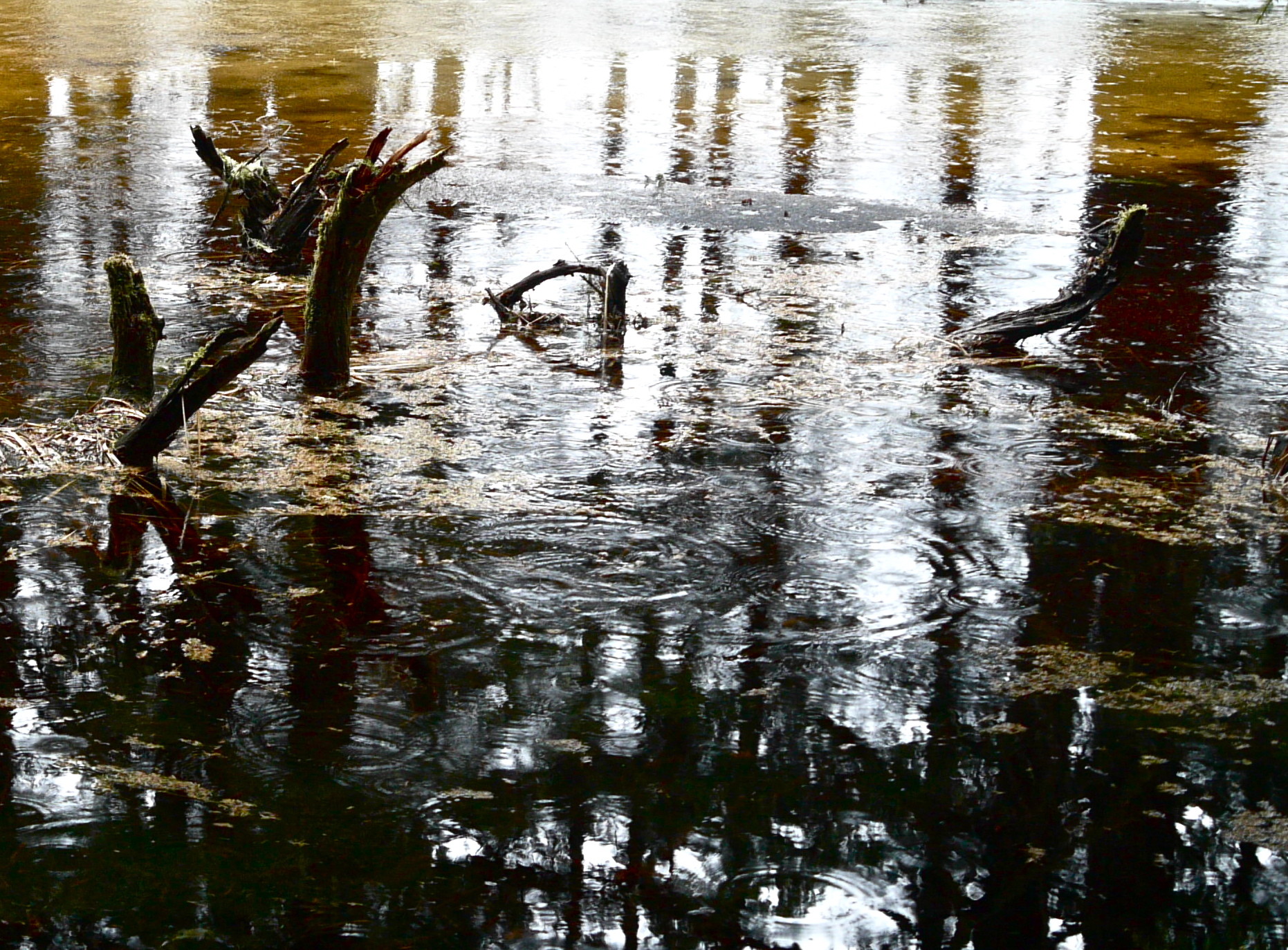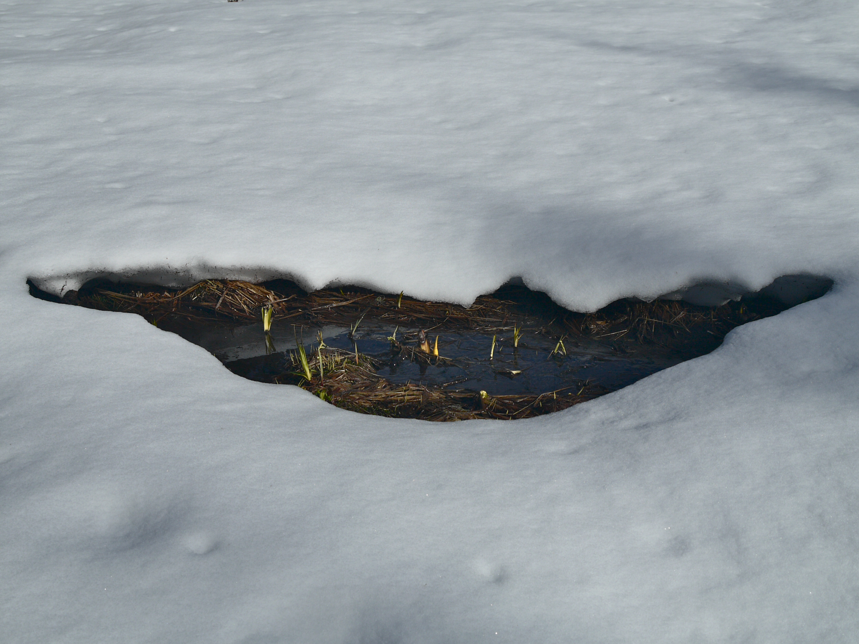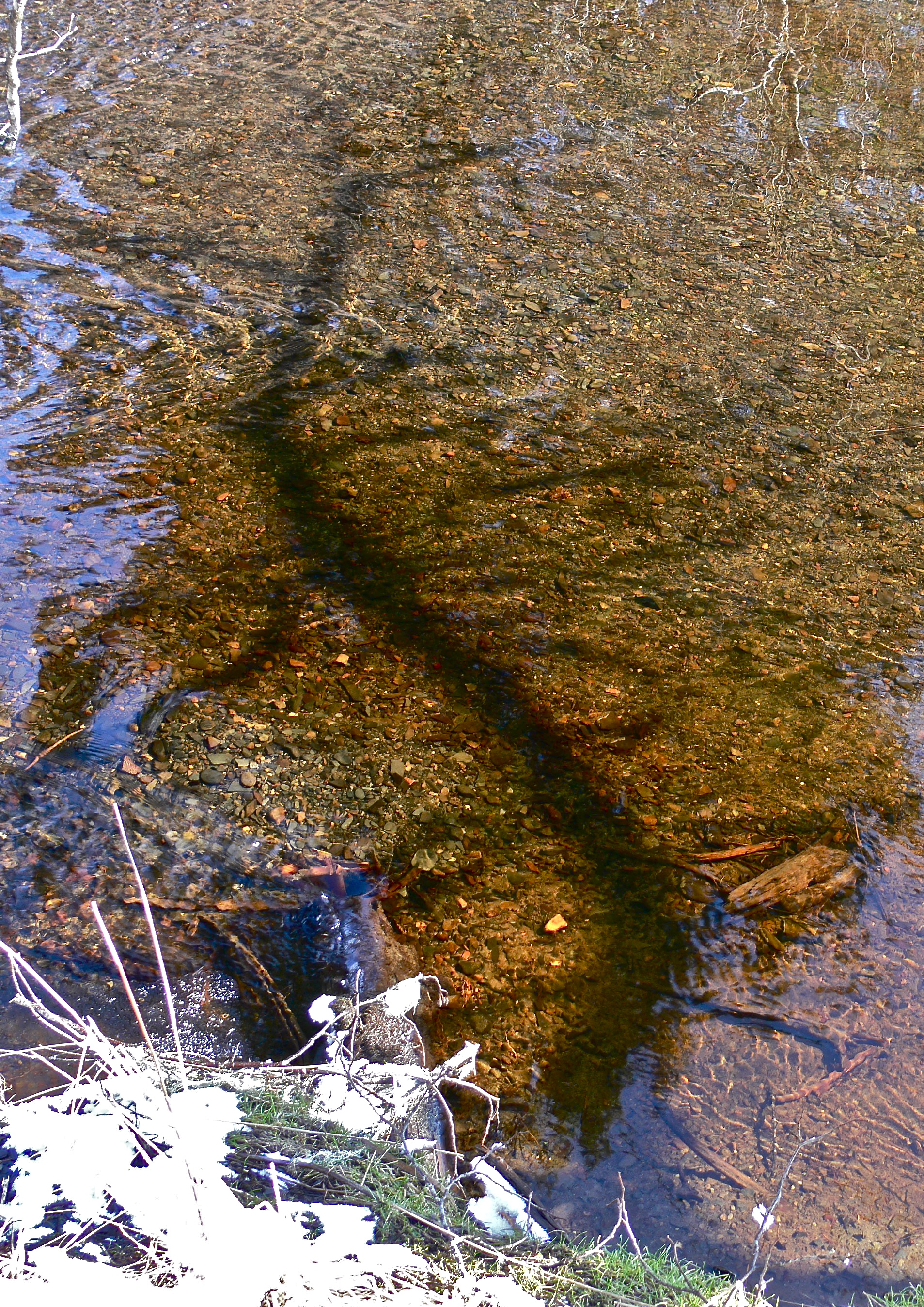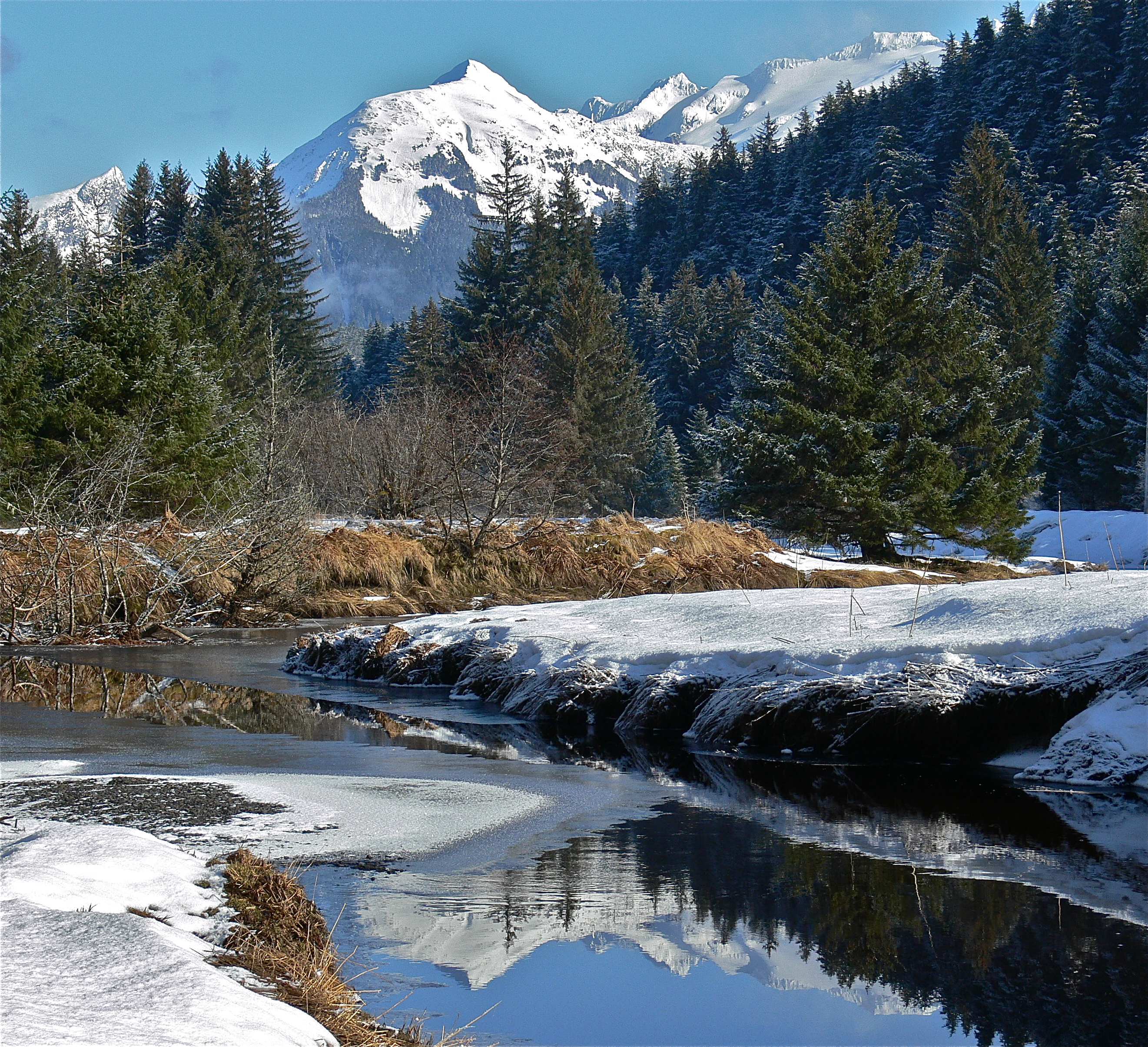 The taste of spring hangs in the air over Amalga Meadows. One big rain storm will push it into spring. Now mud and snow fight it out for the high ground while watercourse ice rots to liquid. Even now a long tongue of open water reaches halfway across the salt chuck. Pushing past the stream of my rude baptism and deeper into the meadow, I find only silence. Expecting the chatter of chickadees I only hear melting snow drops hitting gentling moving water. It pleases rather than disappoints.