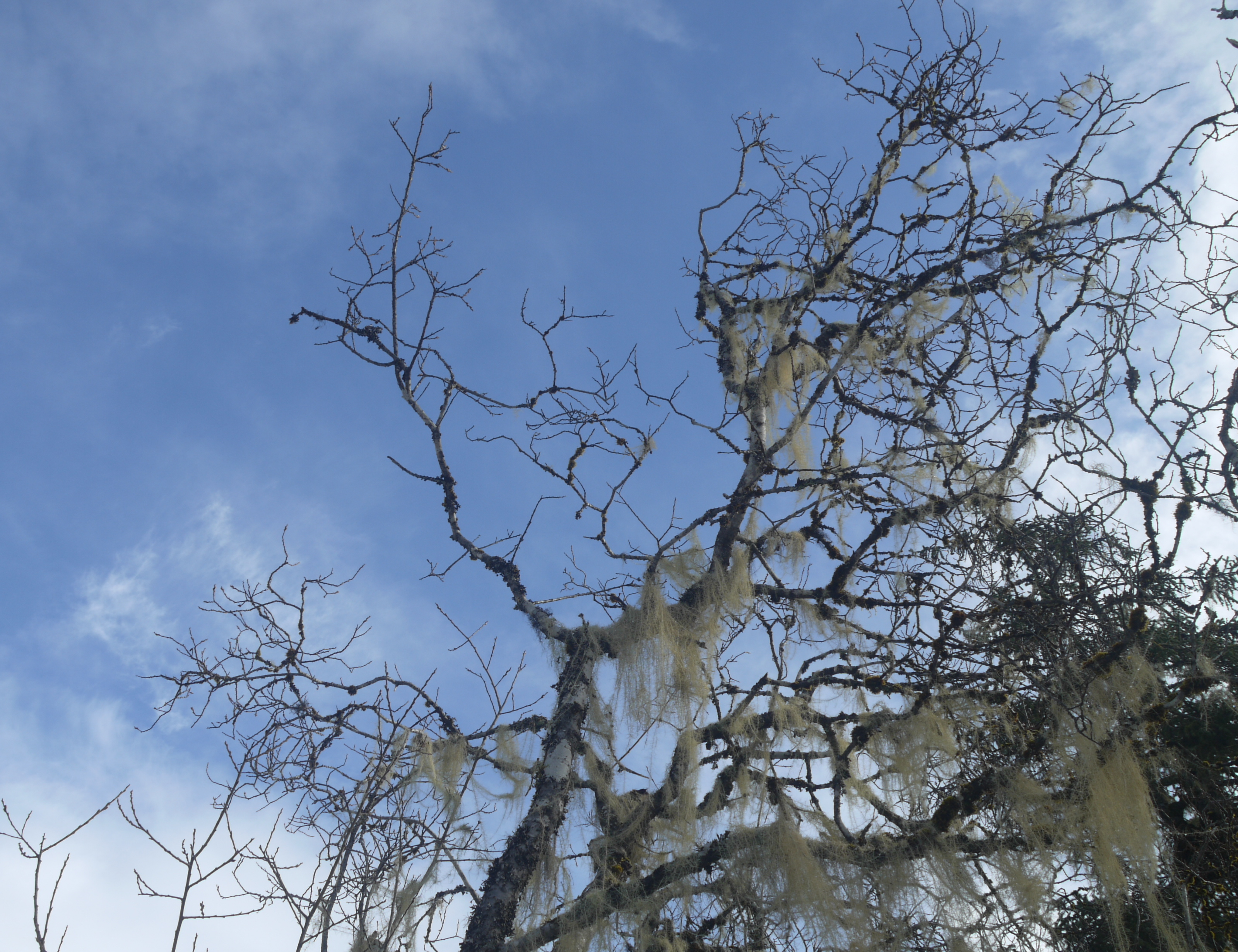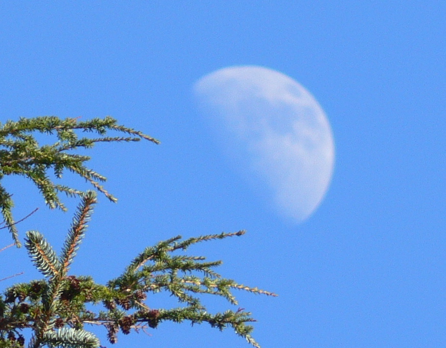 Turning back from the beach I search for the woodpecker and notice a rising half moon emerging from behind a spruce. It wears a toupee of clouds. He is bald before I can snap a picture.