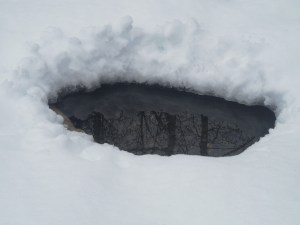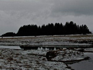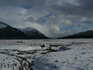 The meadow forms a yellow brown plain bordered on the far end by a scruffy collection of spruce and one bare cottonwood tree. Grey black snow clouds, shredded by wind, fill the sky above the tree line. It could be a fallow Montana wheat field and the line of trees could be the farmer’s windrow for providing a windbreak for the house and barn. Aki and I have cross this meadow often. Sometimes geese or crows or eagles hunt for food here. Even then my eye is drawn to the lone cottonwood tree.