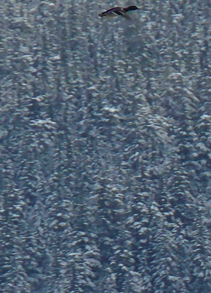 Reaching tidewater we find a big gang of stubborn Canada Geese holding on a shrinking sand bar across the river. Hundreds of gulls share the ground with them. All locals, they intend to feed on the bar until the last second. Hoping we can witness the exodus from the flooded bar I walk toward the beach. Just as we reach it, a cloud of gulls explode off the geese’s sand bar and fly over to our side of the river. Many pass just in front of where we stand. Perhaps better judges of the sea, the geese hold fast as the tide begins to retreat. With no hope to see them fly, Aki and I turn to walk down the beach as the wind drives snow in our faces.