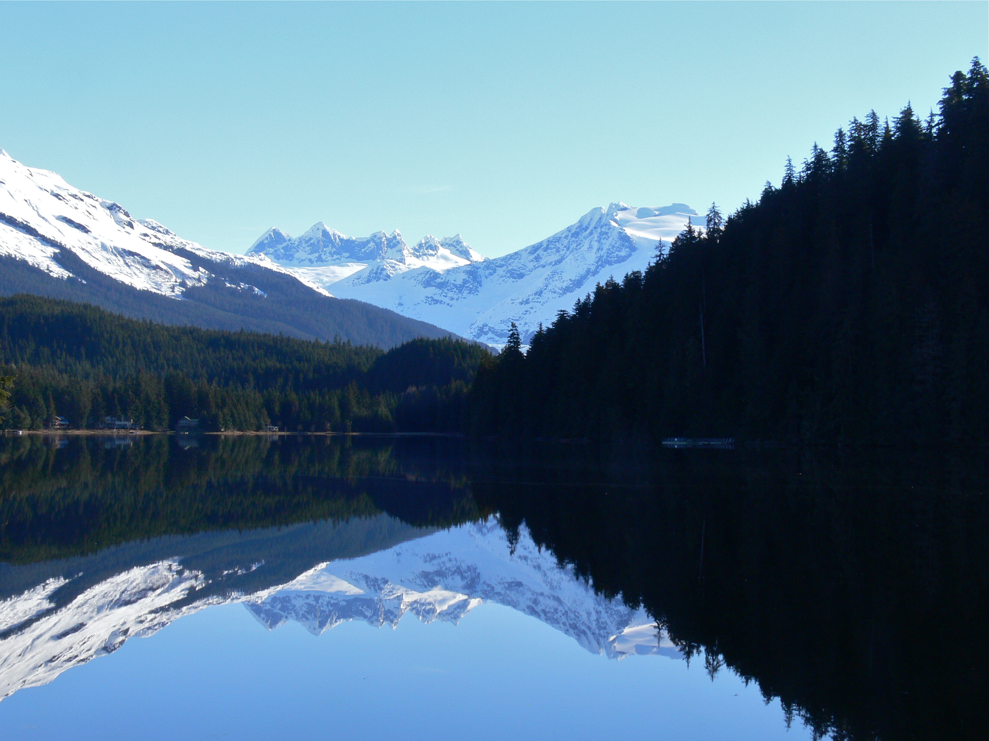 Good thing Wordsworth isn’t with me today. He would be stunned by Gasteneau Channel now animated by strong northern light except where crowded over by feeding scooters. I ride a bicycle out to Sheep Creek at noon and find hundreds of gulls and ducks crowding sand bars diminished by a high tide. One Canada goose paddles between islands of gulls while I eat a sandwich. The wind is up but it is comfortable enough if I take shelter behind a sun warmed boulder. Sunlight reflecting off the gulls’ feather cloaks makes me look away down channel and then up to appreciate the lights and darks on snow colored mountain peaks. Behind me mountain goats feed far down the mountain on the first burst of sweet leafs. When the wind drops I hear robin song.