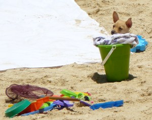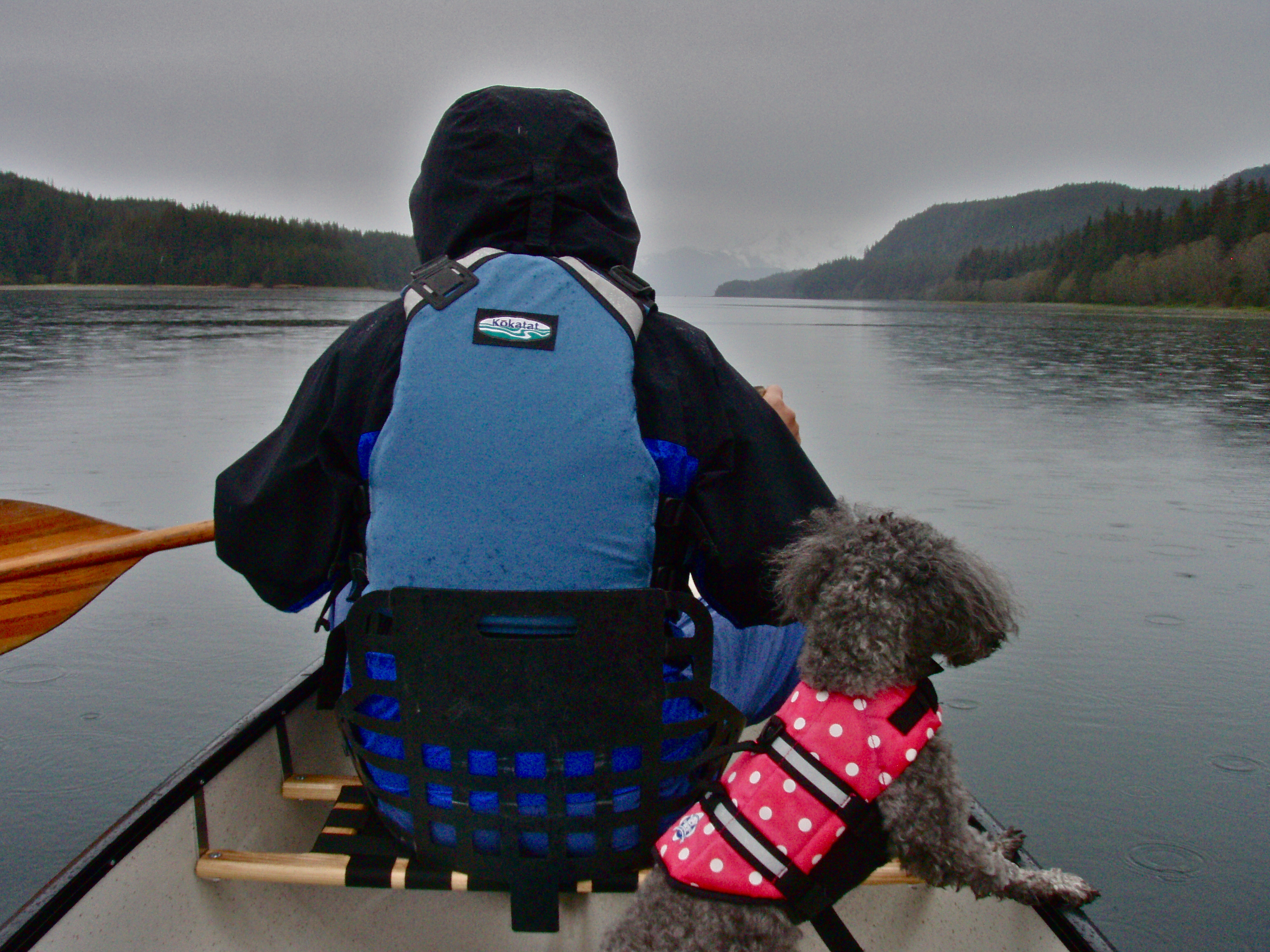 Aki, displaying the posture she reserves for meeting other dogs (tail and rear up/legs straight/ feet slightly forward) is half submerged at the lake’s edge. The beaver takes no notice of either of us and soon Aki is back at my side.