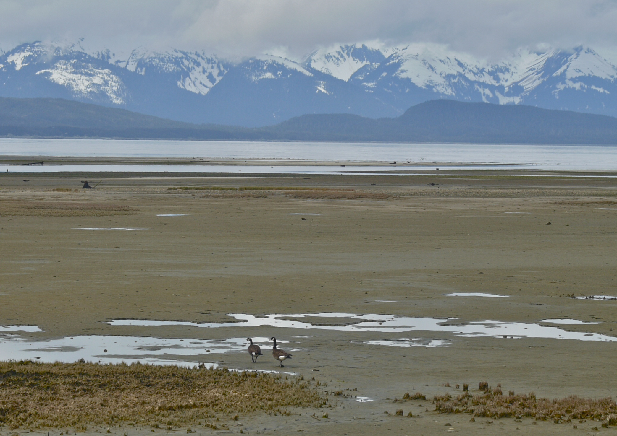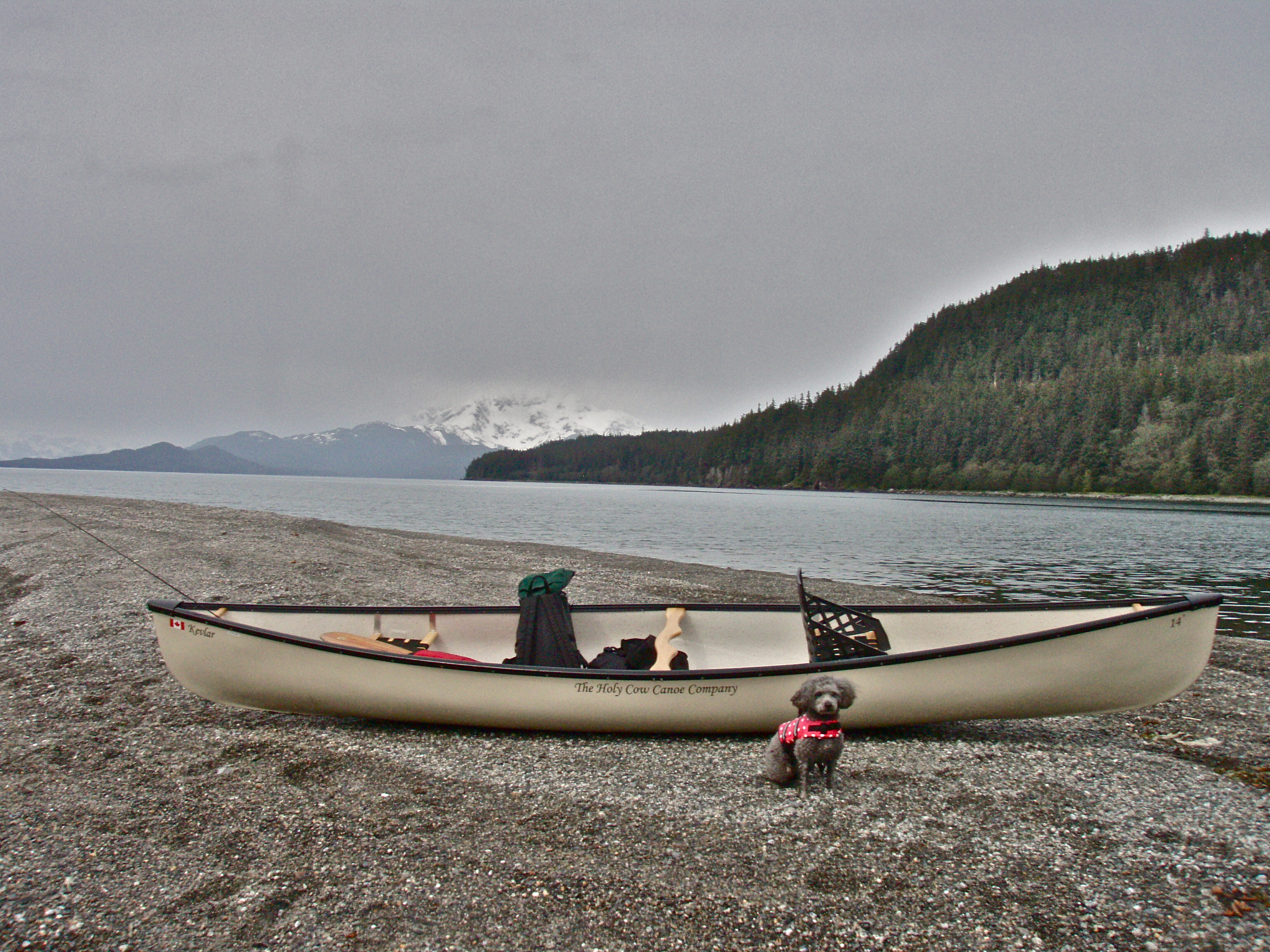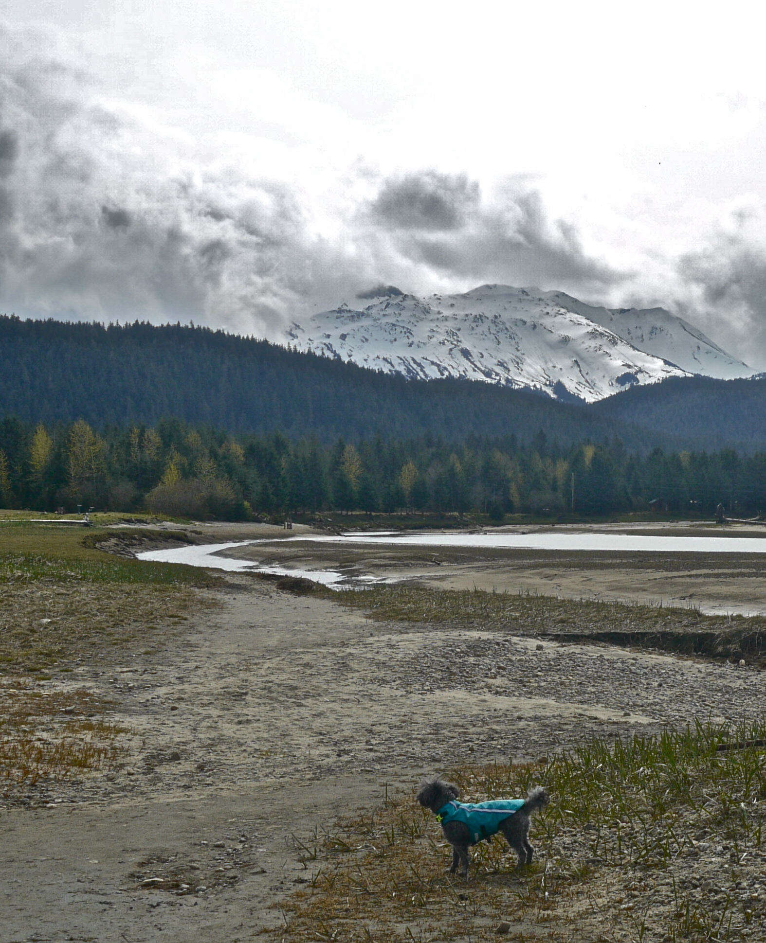 Near the beaver village we spot the tell tale rings of rising fish on the lake that borders it. We also see the swirl of large animal, mammal not bird, break the surface in the middle of the rising salmon. I’m thinking river otter because, as the government who planted the salmon in this lake will tell you, beavers don’t eat fish. Fresh green yellow foliage now hides the main beaver house and provides a rich counterpoint for the line of dark green spruce trees that fill the space between lake and the cloud obscured ridge of Thunder Mountain.