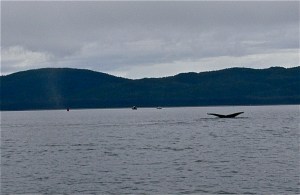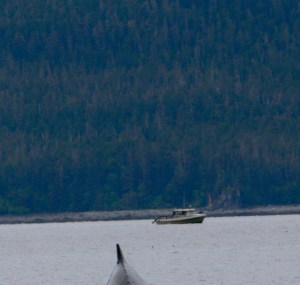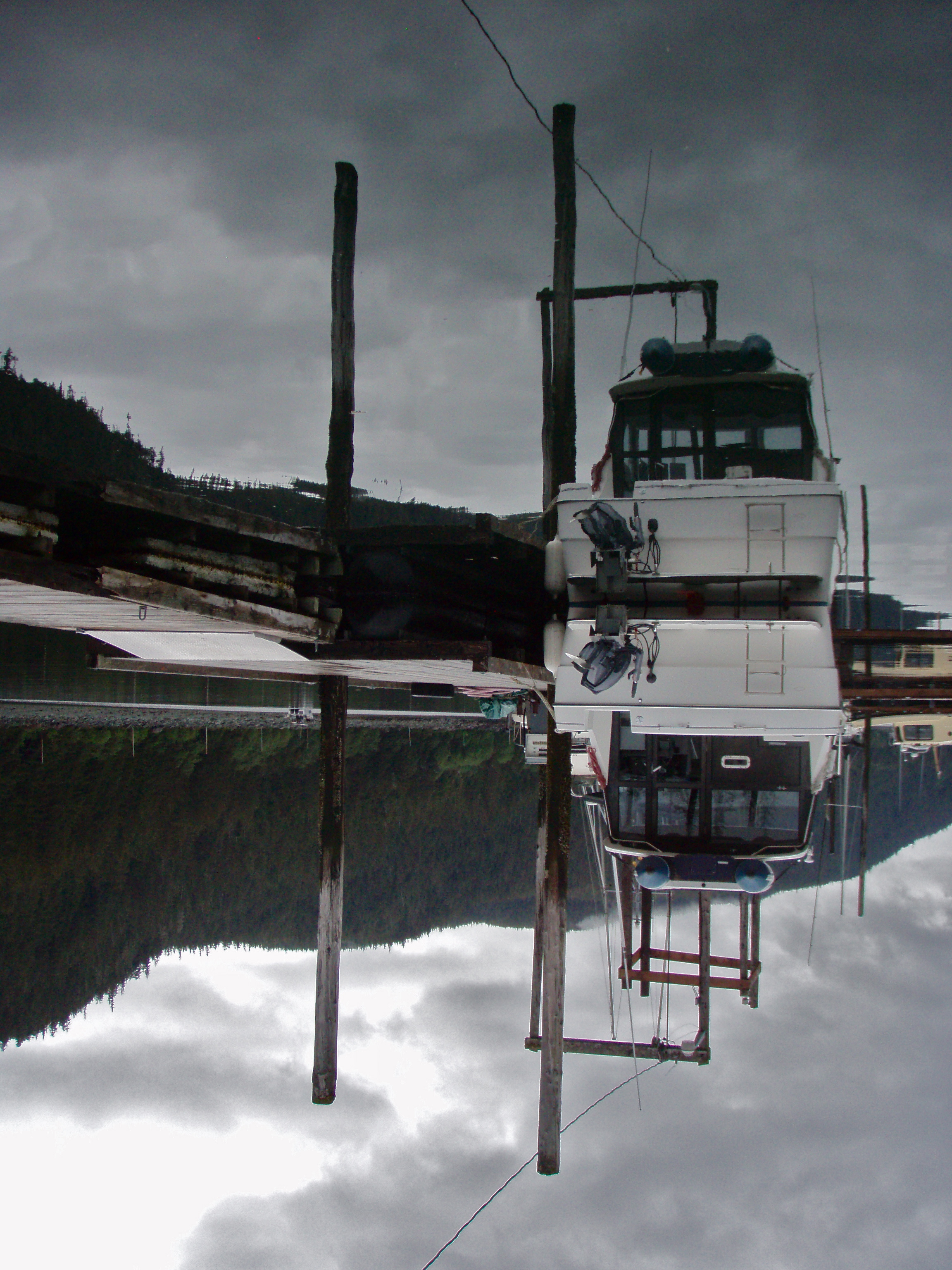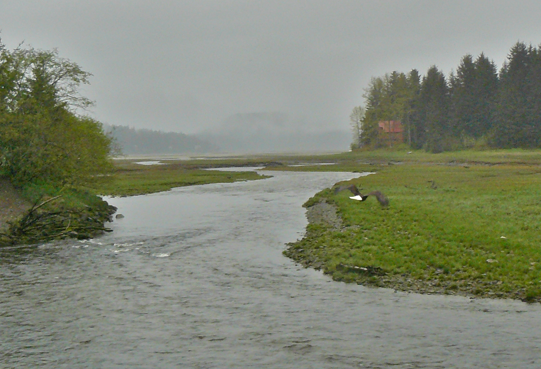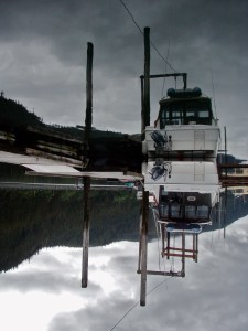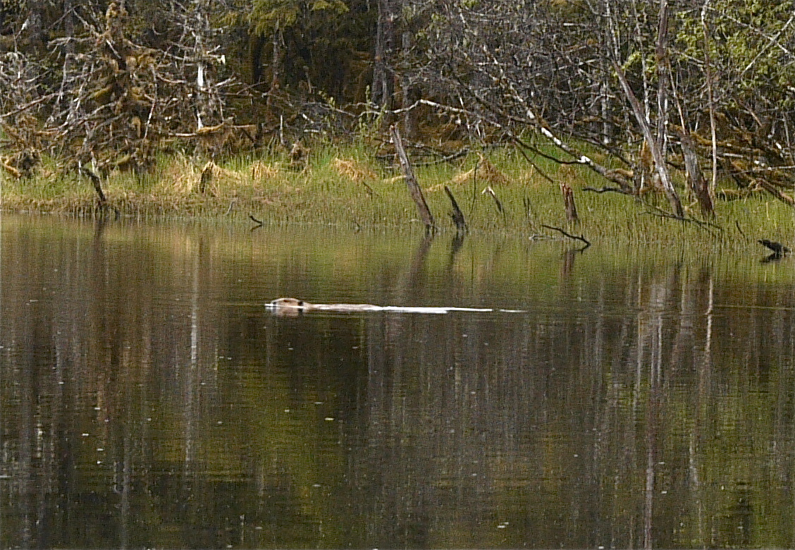 While moving deeper into the woods Aki and I are startled by a small explosive sound like that made by a sizable rock striking deep water. A bear practicing diving? More likely a strong child throwing something in the lake for the resulting splash. Minutes later we reach a lake where a beaver swims back and forth across the surface. Just before reaching the shore it slaps the water with its tail and dives. In seconds it is on the surface heading back to the opposite shore. Beyond small king salmon stir. Some launch themselves a foot or two into the air.