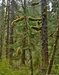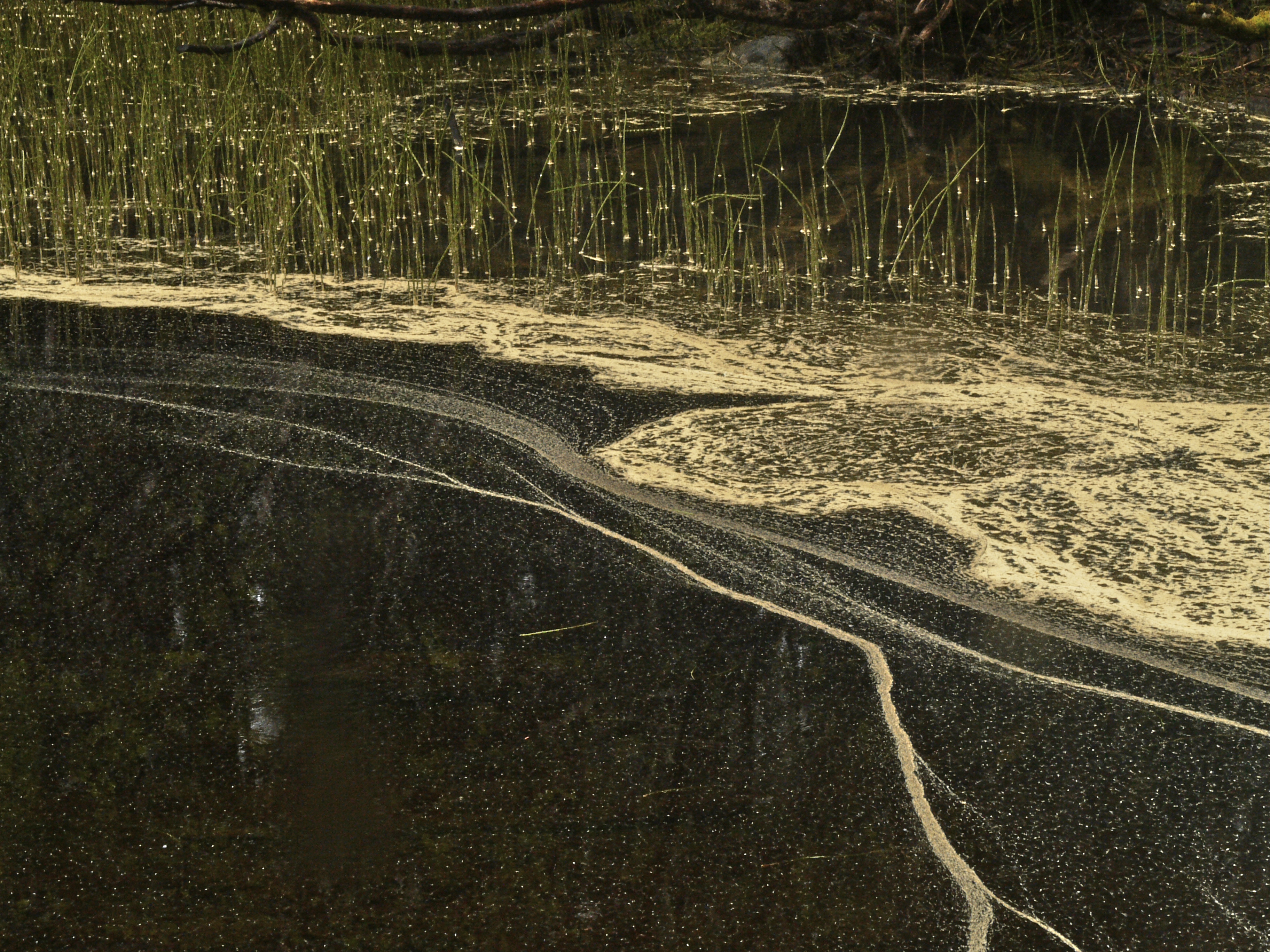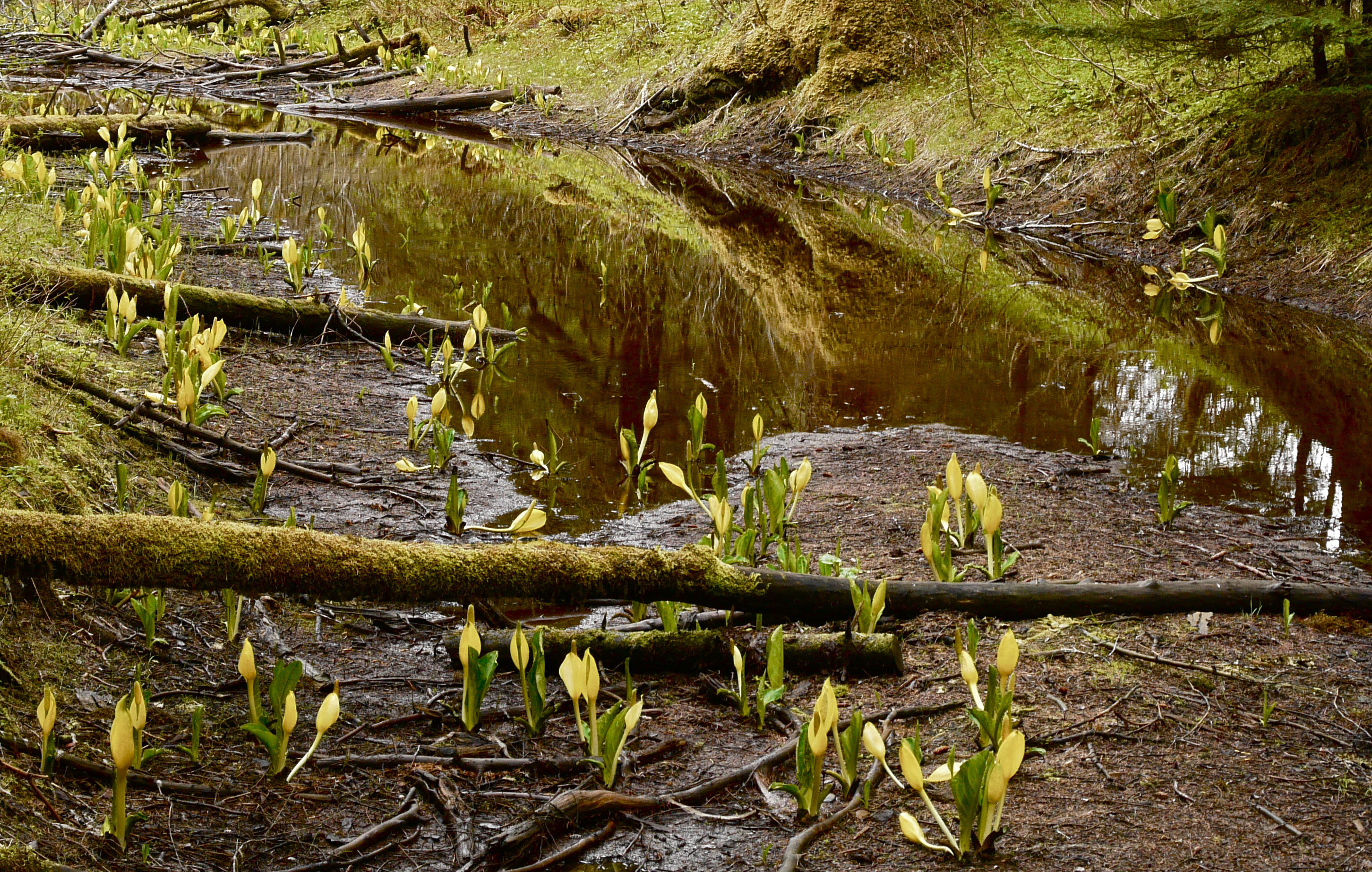From here we follow a trail into the troll woods. We pass a pocket lake where a single Common Merganser, its white body standing out against the dark lake waters glides by. Seeing a lone duck on water this time of year makes you wonder if it is fiercely independent or the victim of tragedy. Did he drive other birds from the lake or come to a place no one else wanted to sulk? Did I mention it is still raining? Along the lake shore recently released spruce pollen forms elongated yellow islands on the water’s surface.