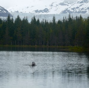 I could see why the beaver would want this lake to himself. It offers a beautiful view of the glacier and surrounding mountains. When he stops disturbing the water’s surface with antics, he can appreciate the serene reflections of mountains and glacier captured on the lake’s surface.