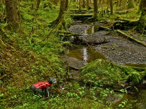 It’s raining again on the glacier moraine and the troll woods it surounds. Aki and I are here to check out the baby king salmon recently released into three little lakes. Raised along side king salmon about to be dropped into ocean waters where they might grow to fish that deserve their name, the 500 fish dumped into these landlocked lakes will live as farm animals until eaten by someone or something.