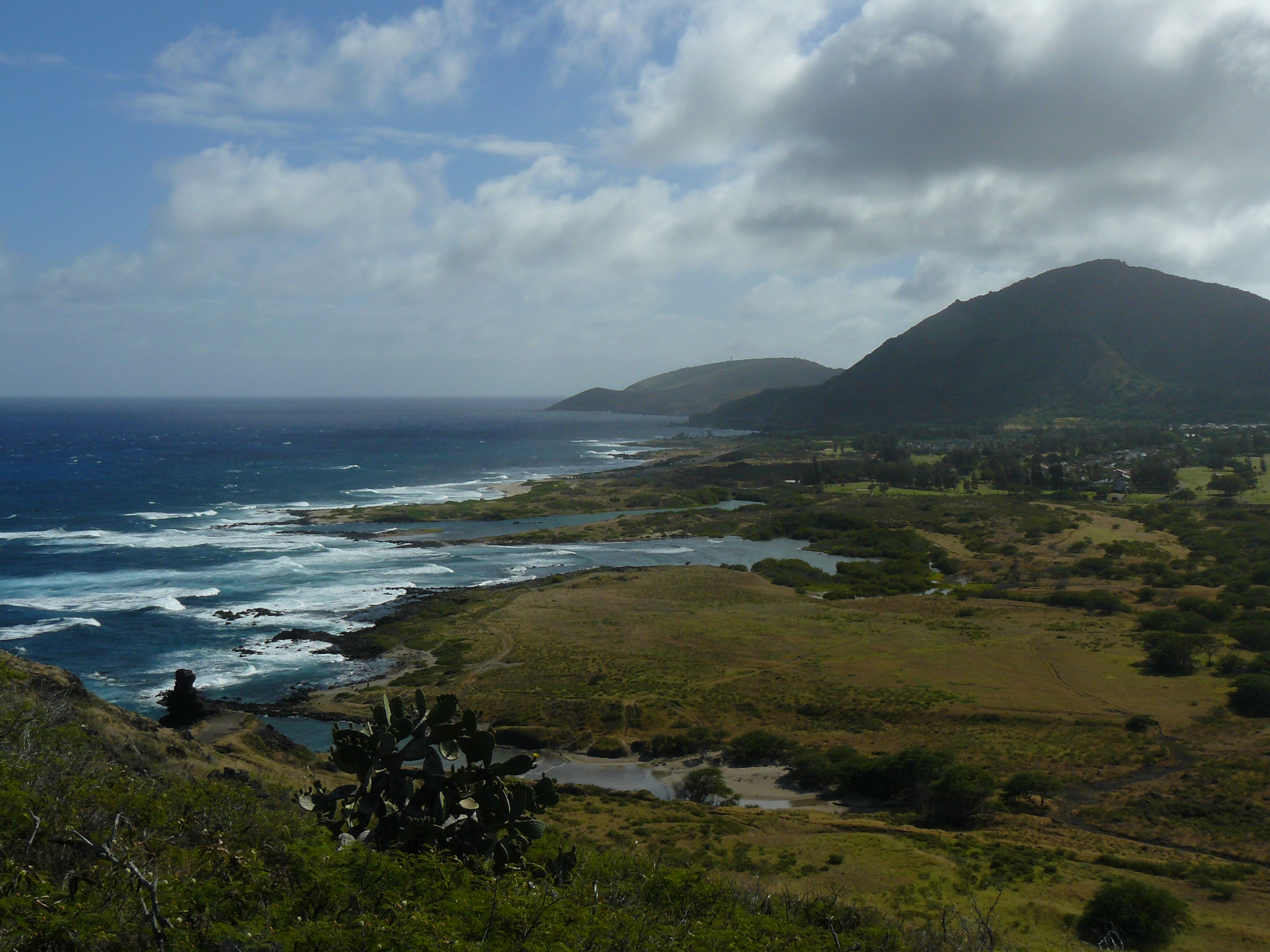 Friends warned us that temperatures inside the crater can reach 90 degrees but today’s trade winds moderate things for us. It carries the scent of flowers up through hibiscus grove (now full of plants setting seeds),and dying out as we reach the Americas cactus forest. There the golden light of late afternoon backlights the fibrous plants.