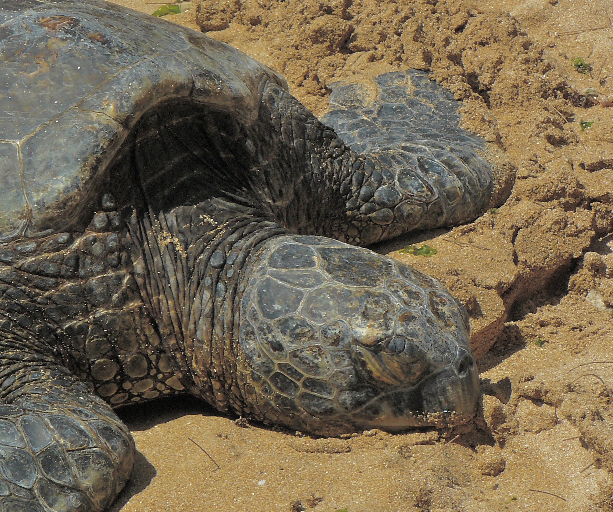 Earlier, while driving past the famous surfing beaches of the North Shore, we stopped at a pocket beach of sand to watch Hawaiian green turtles feeding on the moss that grows on offshore rocks. The rocks lay just offshore where the surf breaks so the turtles must tumble about in it as they eat. When sated they crawl onto the sand to digest dinner while the sand warms their undersides.