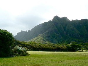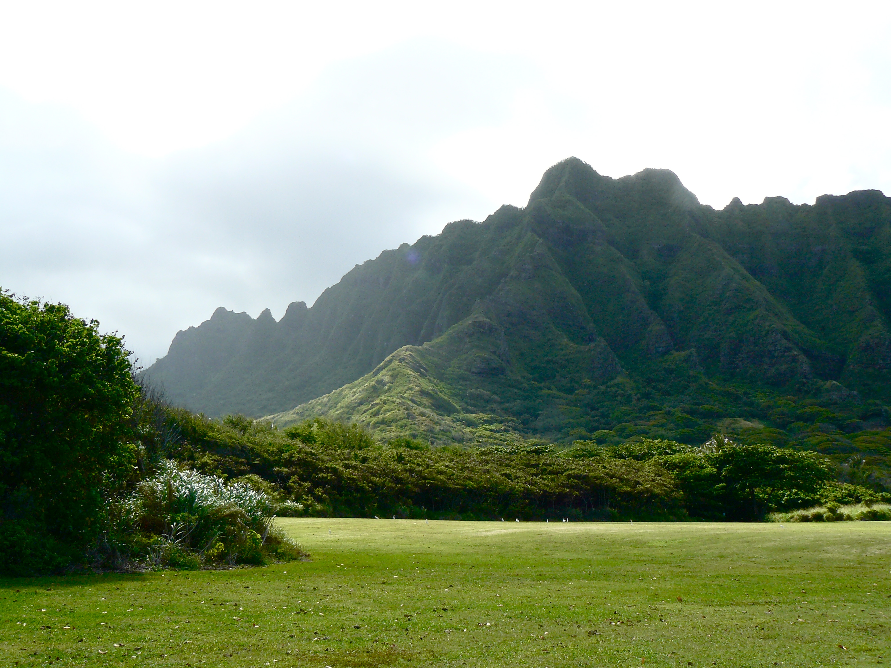 This windward side of Oahu is all lush green. From the beach we watch lines of breakers that start at an off shore reef and end in a crash just below the road. Behind is the grass plain and a Hawaiian family party. After setting up a series of canopies and a large bounce house of inflated plastic for the kids, they have settled in for an afternoon of eating, drinking beer, and telling story. A sign standing feet away from the adults paying horseshoes forbids almost all the activities occupying the family.