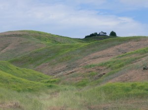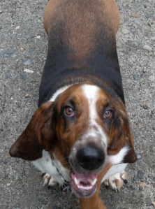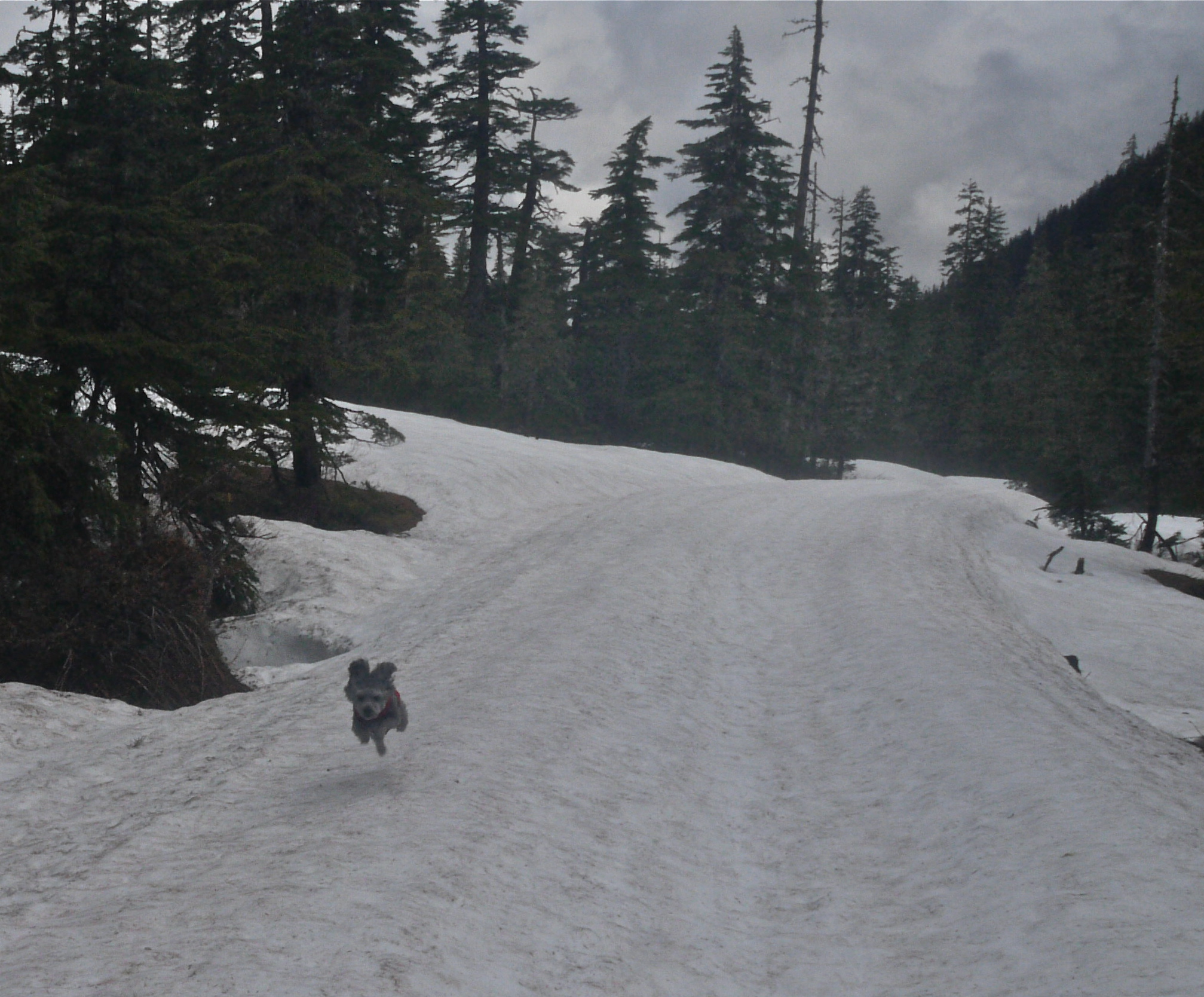 Aki, who didn’t want to join me on the bridge, cringes at my feet. Does she know she would never survive a dunking in the fast moving stream? More likely the stream noise hurts her ears. Either way she needs to move so we turn and start the climb through the rain soaked meadows to home.