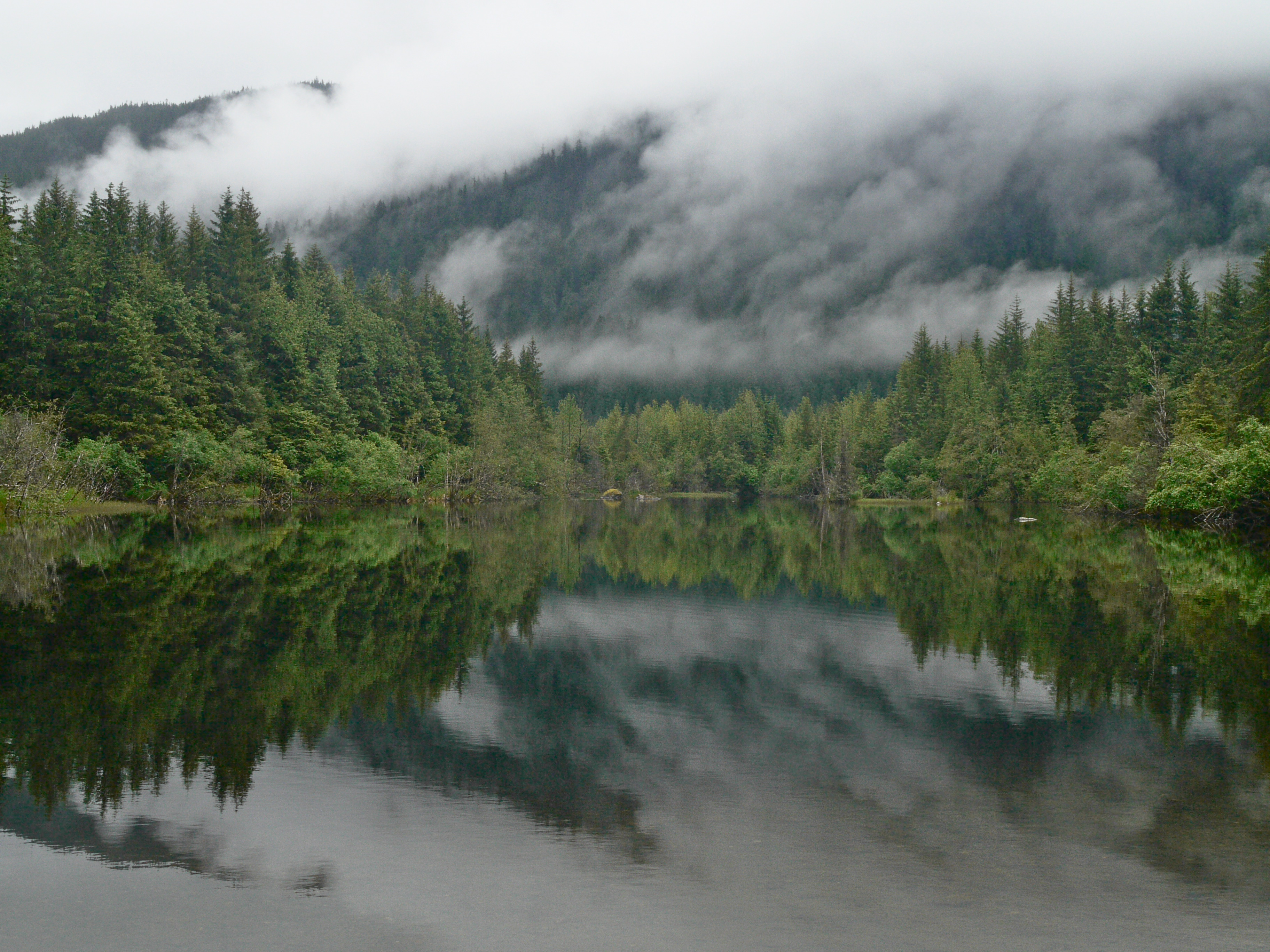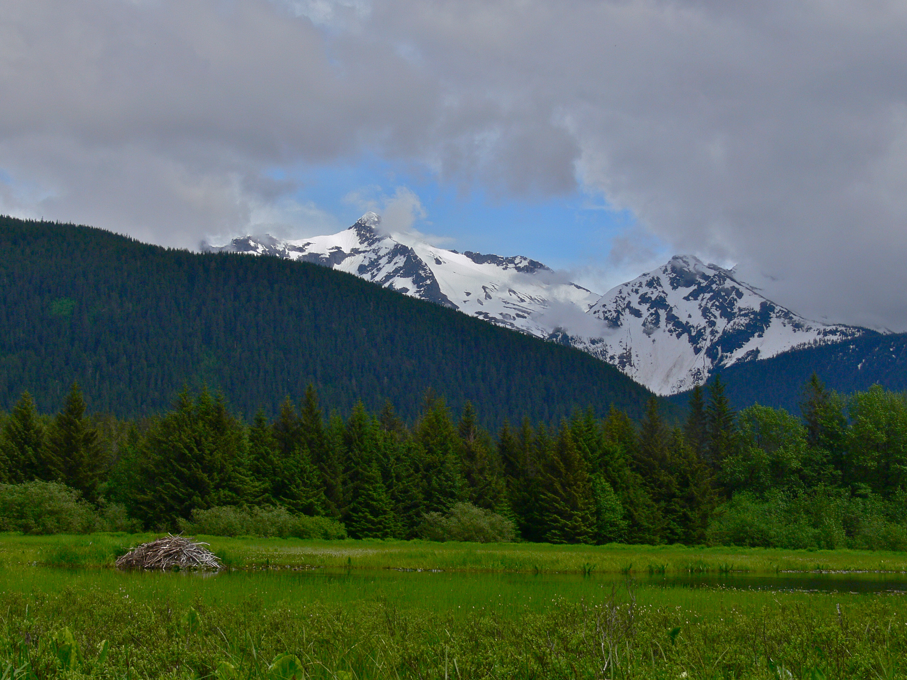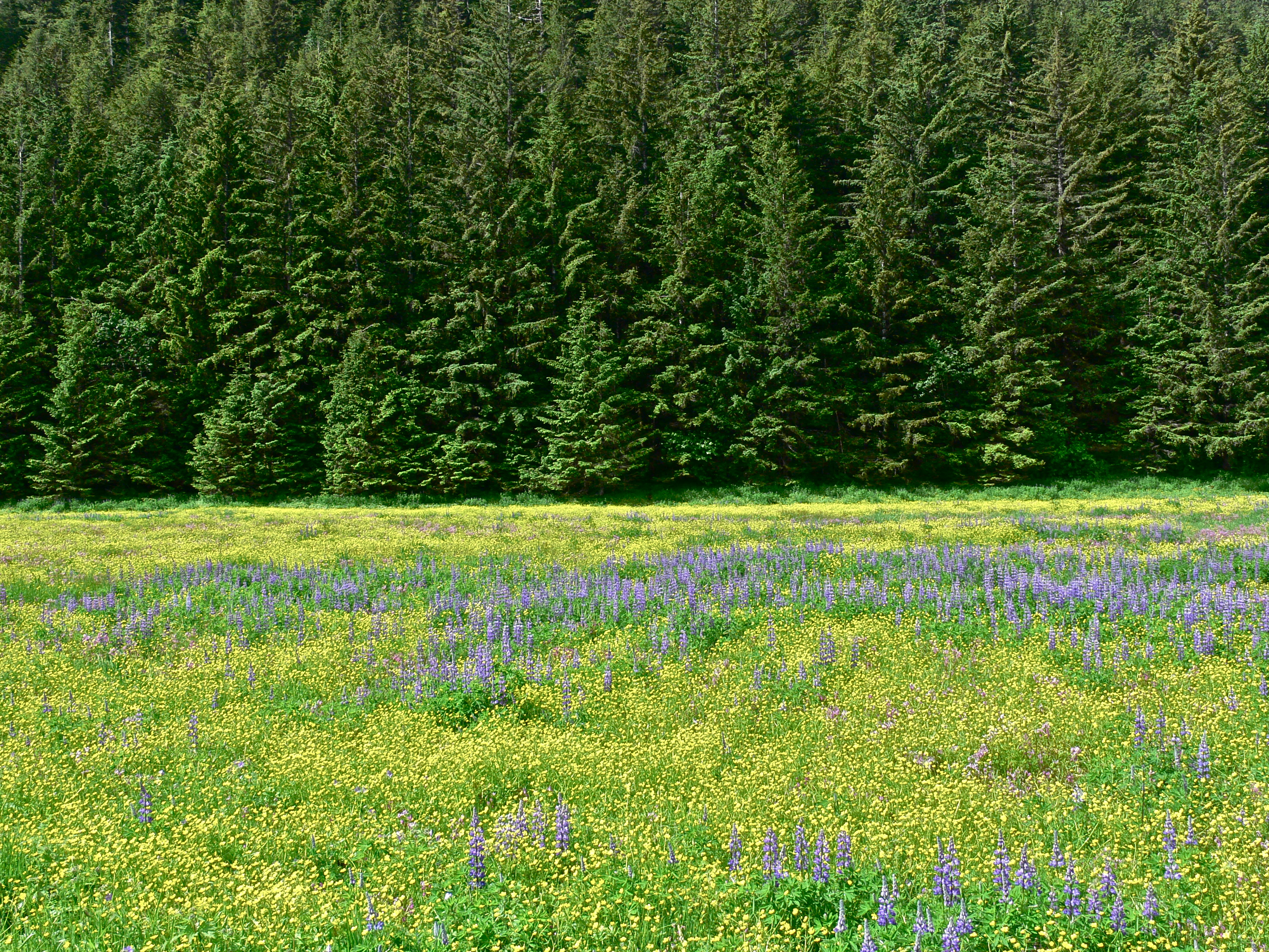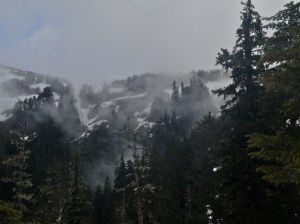 After the pond I return to my cataloging of the songs made by the mountain water courses. It’s a good day for it with heavy constant rainfall charging the rivulets and streams. I struggle to come up with new terms to replace those that have now become cliches. A small stream draining this field of magenta shooting stars makes a laughing sound moving along side the trail. Others gurgle or slosh or even roar when they pass through culverts under the trail. All the watercourses eventually join Fish Creek.