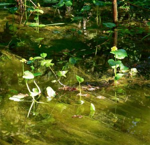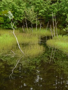 Armstrong promised that if we make a cautious approach we could see the larva hanging just below the water surface with only the tip of their breathing tube exposed to the air. He didn’t mention rain and I never considered how it might discourage mosquito larva. We don’t see any larva. There is a large water strider trying to make his way across the water surface to safe harbor in some pond side grass.