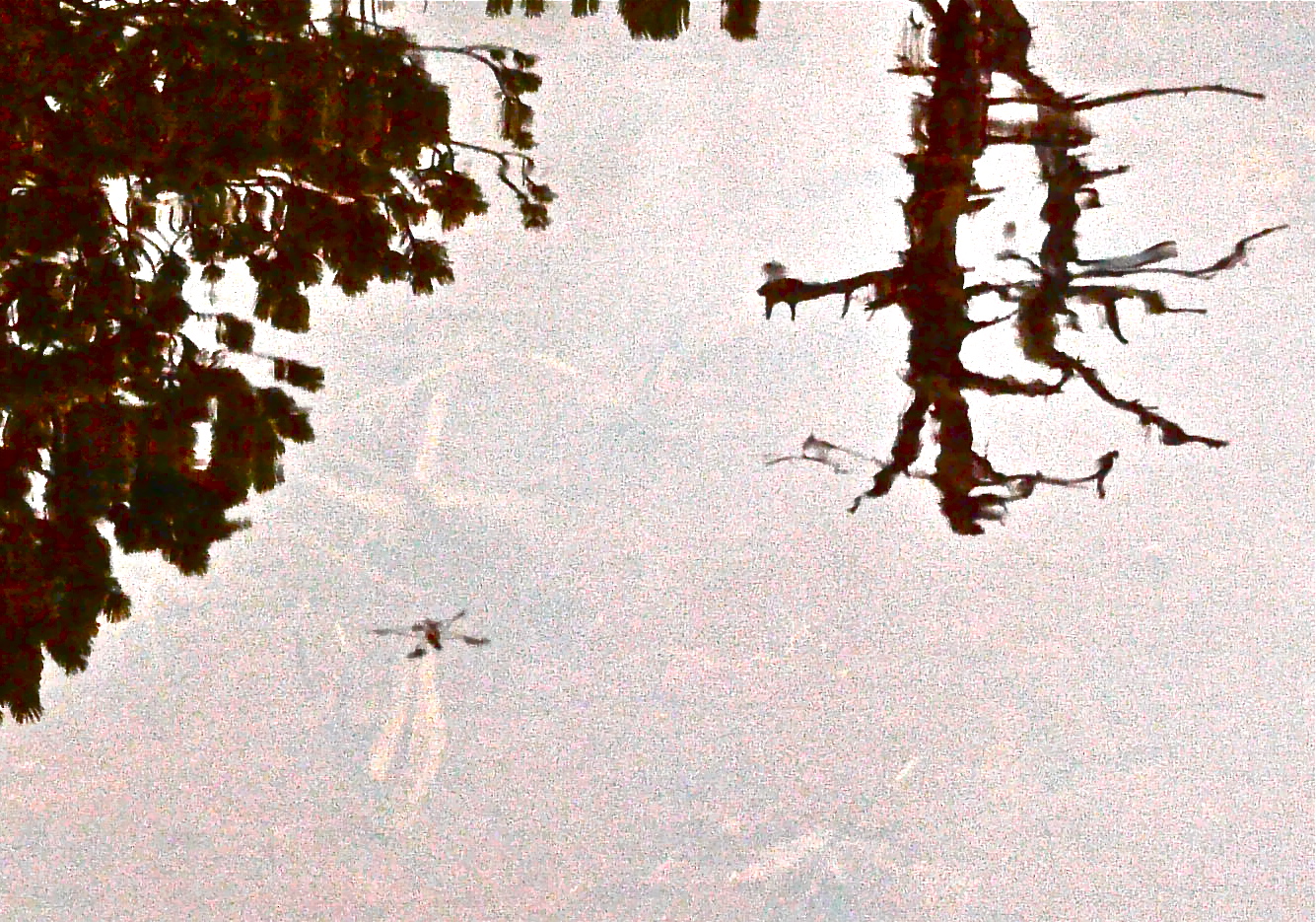 The strider fights the wind and the concentric waves created by each rain drop hitting the pond. Sometimes these collide with each other to create confusion on the water surface. If the strider hit one of these pockets would the surface tension beneath his feet collapse to sink him to the bottom of pond? Now we have drama that distracts us from the rain until the strider disappears in an undercut running along one side of the pond.