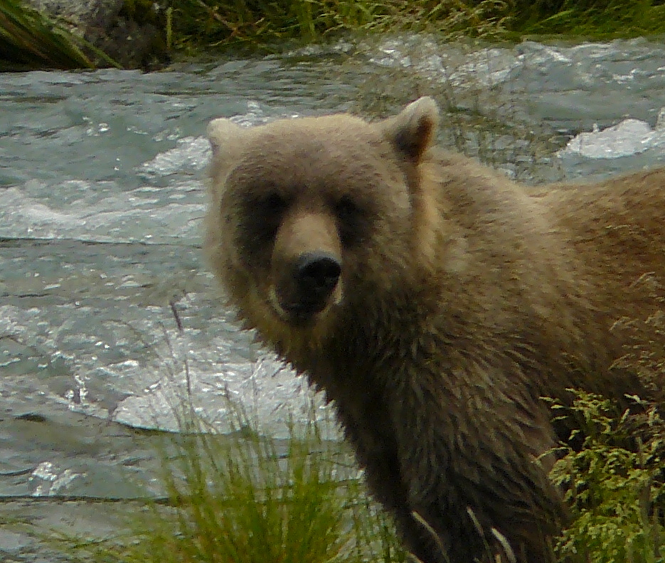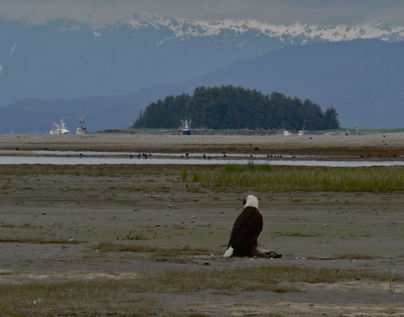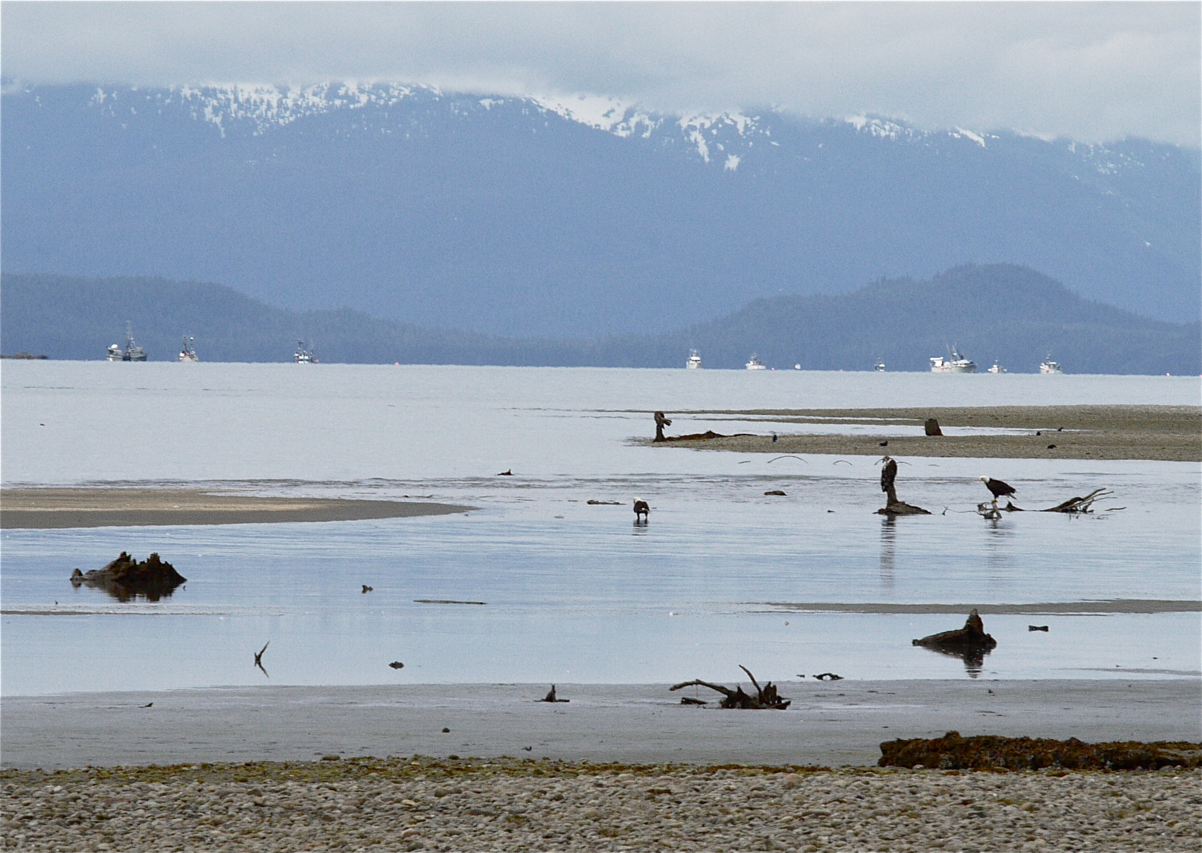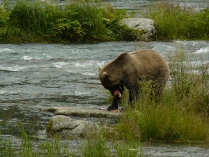 Having made a good start with a few hours of work, my mentor puts away brush and paint and we return to Haines. Latter with only a couple of hours before I have to board a ferry back to Juneau, we drive along the shorter Chilkoot River and spot a fishing Brown Bear. It strolls through chest deep water, passing men fishing for Sockeye Salmon until it finds the head and backbone of a recently filleted salmon.