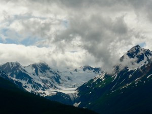 I’m at Mile 35, Haines Highway. The mileage marker tells how far we are from Haines Alaska, Five more miles would take us to the Canadian Border. Slowly low clouds lift from the peaks across the Chilkat River to offer us something to paint.