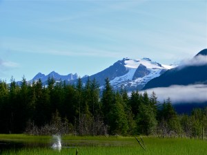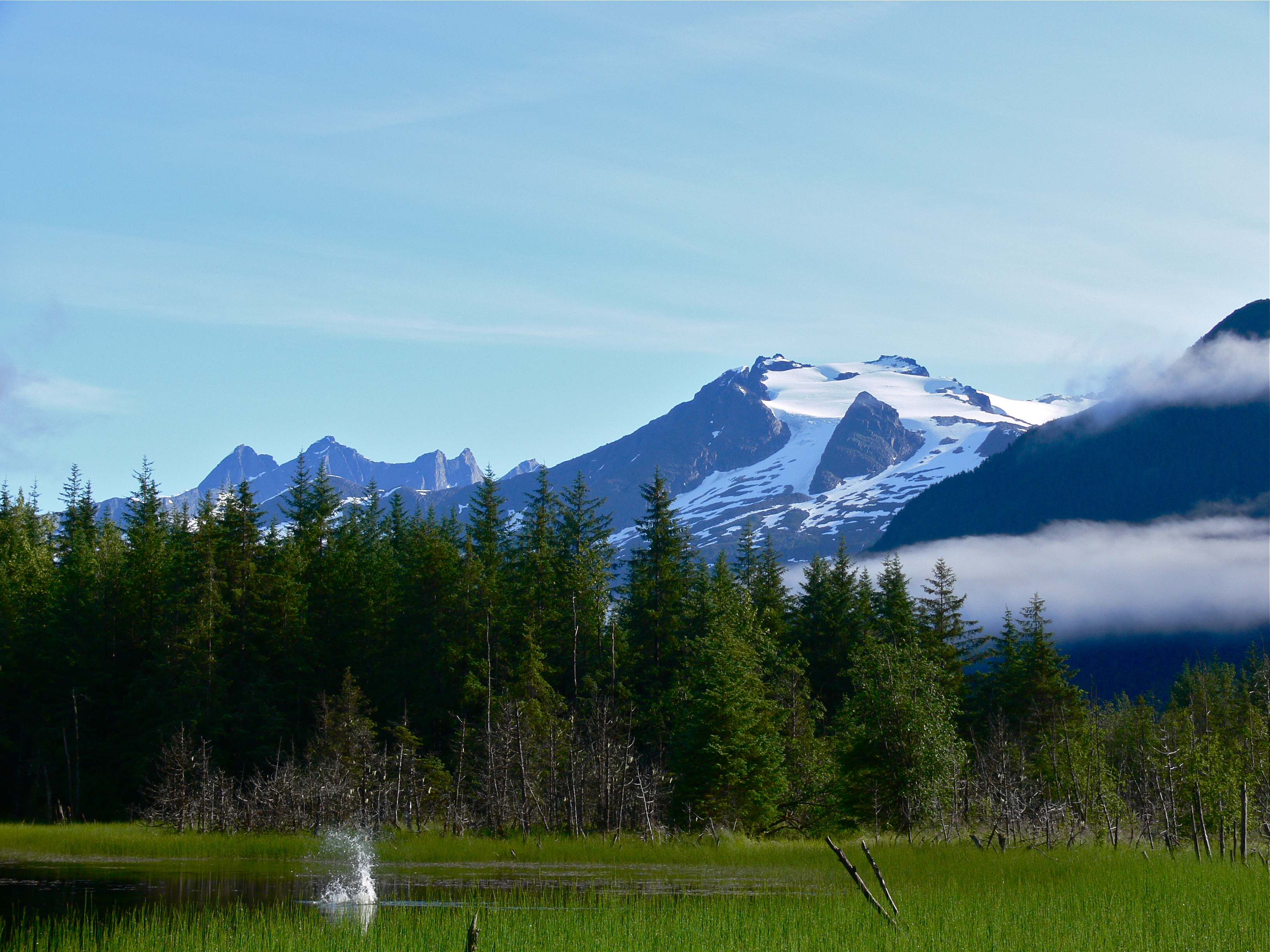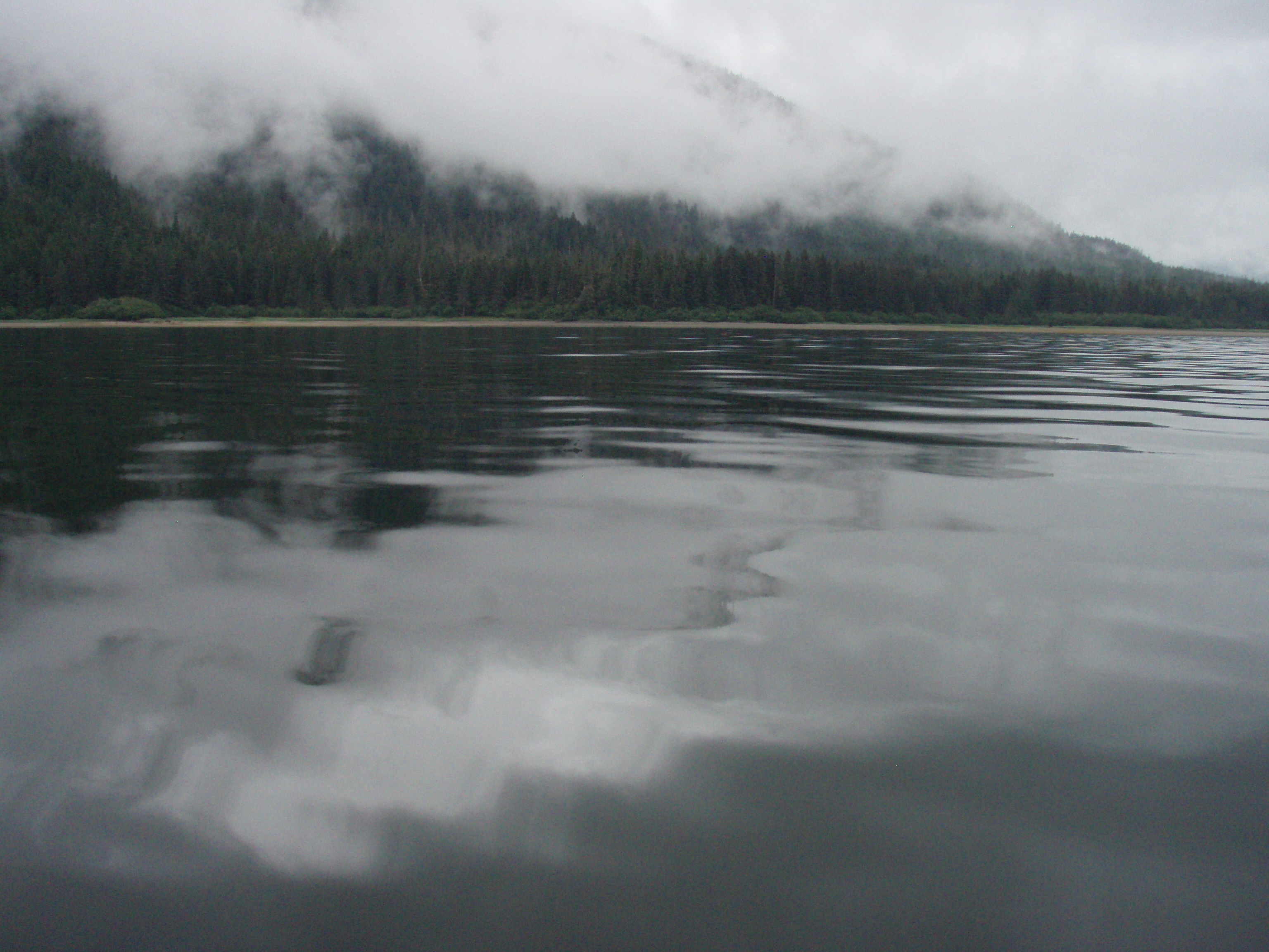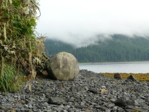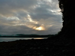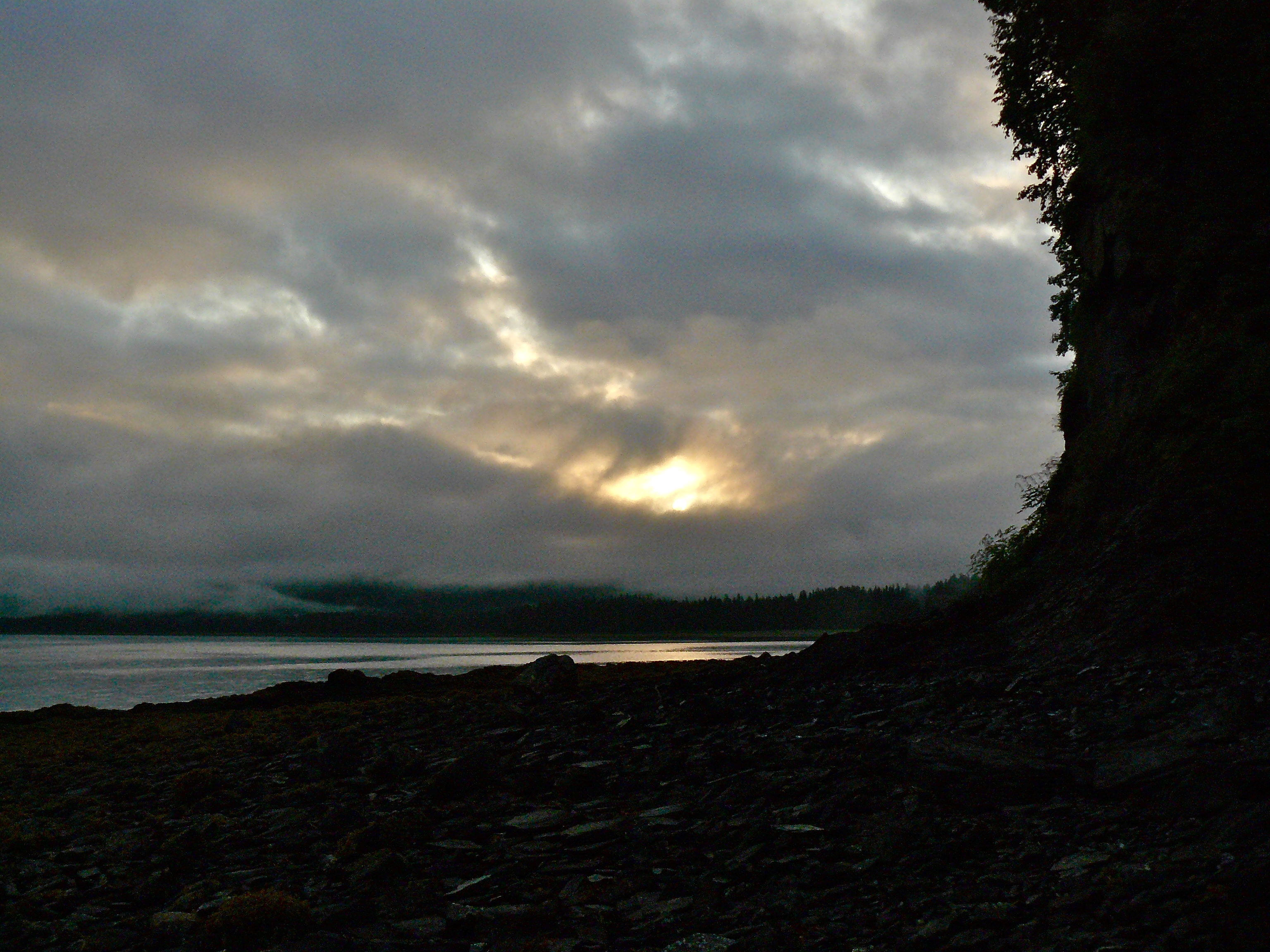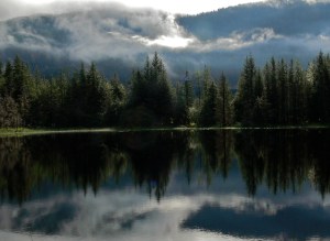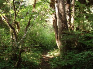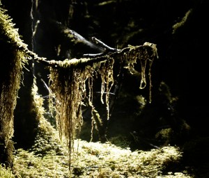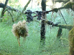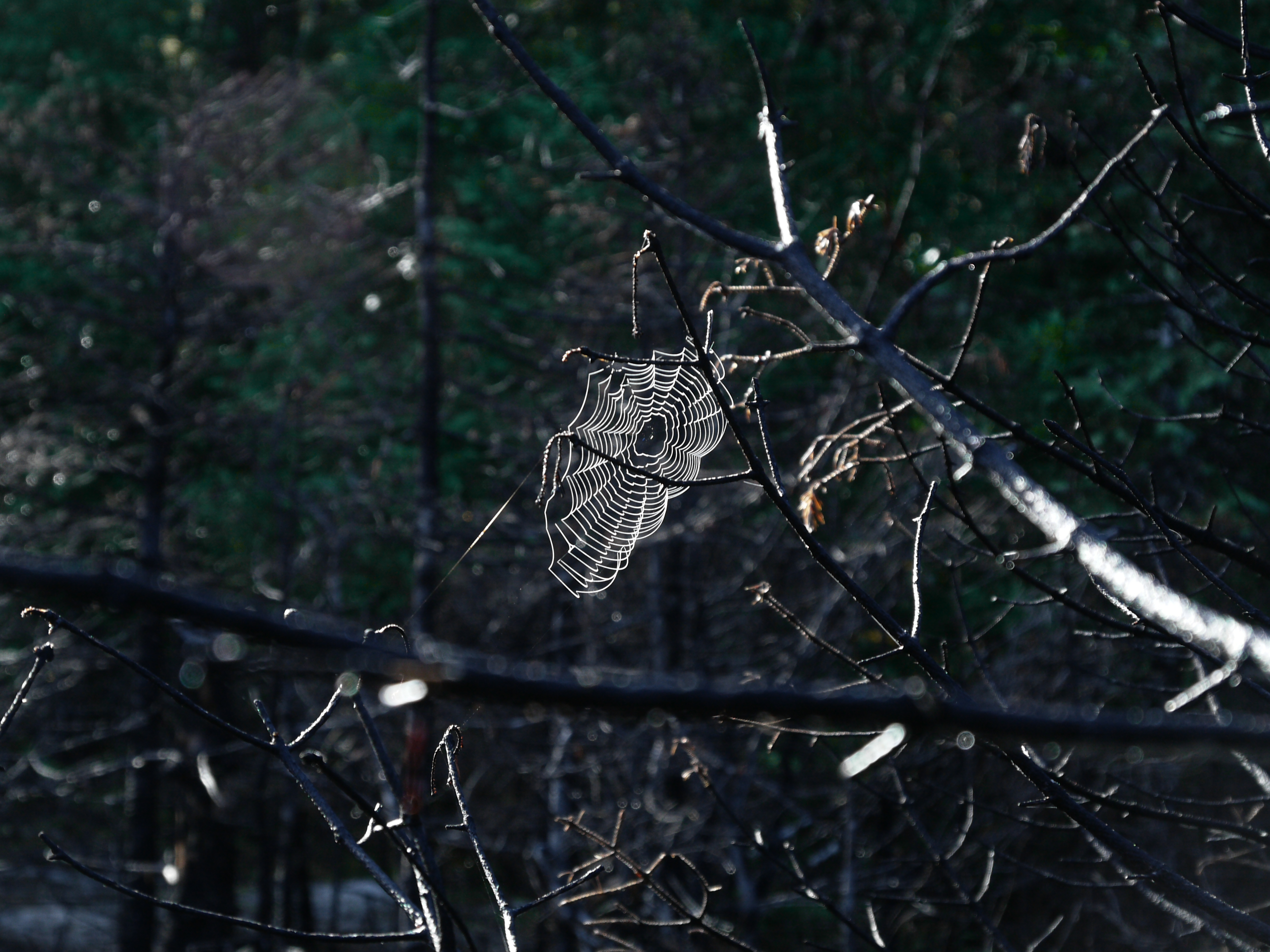 It’s a slow, peace bringing task to follow the sun through these thick woods. We pass an indentation in the moss still steaming from the heat of the deer that just left it. This brings stories from my friend of other hikes and shared kayak trips. An hour and more passes without notice until we regain the man made trail. It takes us to a burned area where a spider web of sinister beauty, backlit by the climbing sun, is the sole decoration in a fire blackened alder tree. Nearby two huge Russula mushrooms, encouraged by the warming sun, push skyward. One wears a mossy cap.