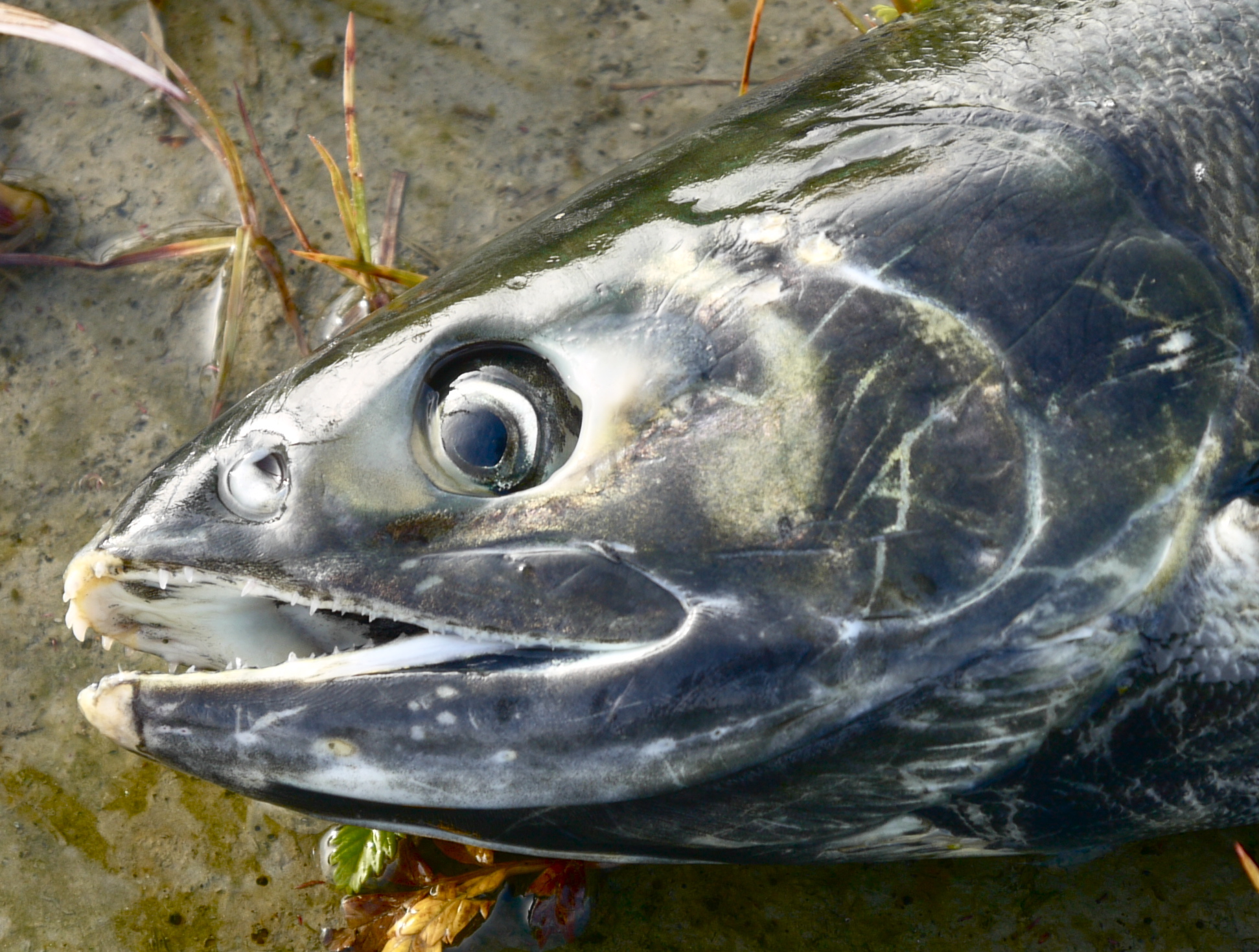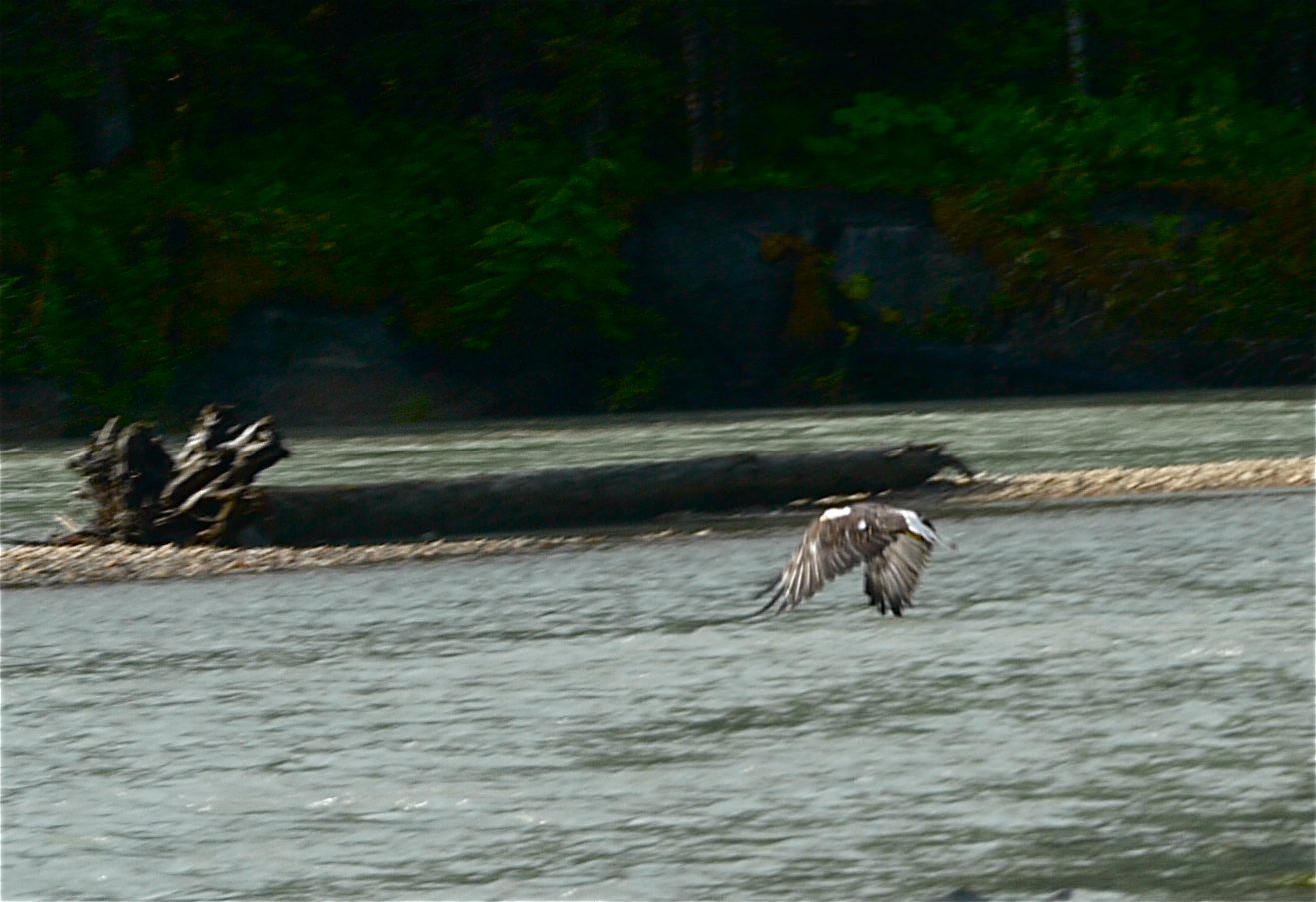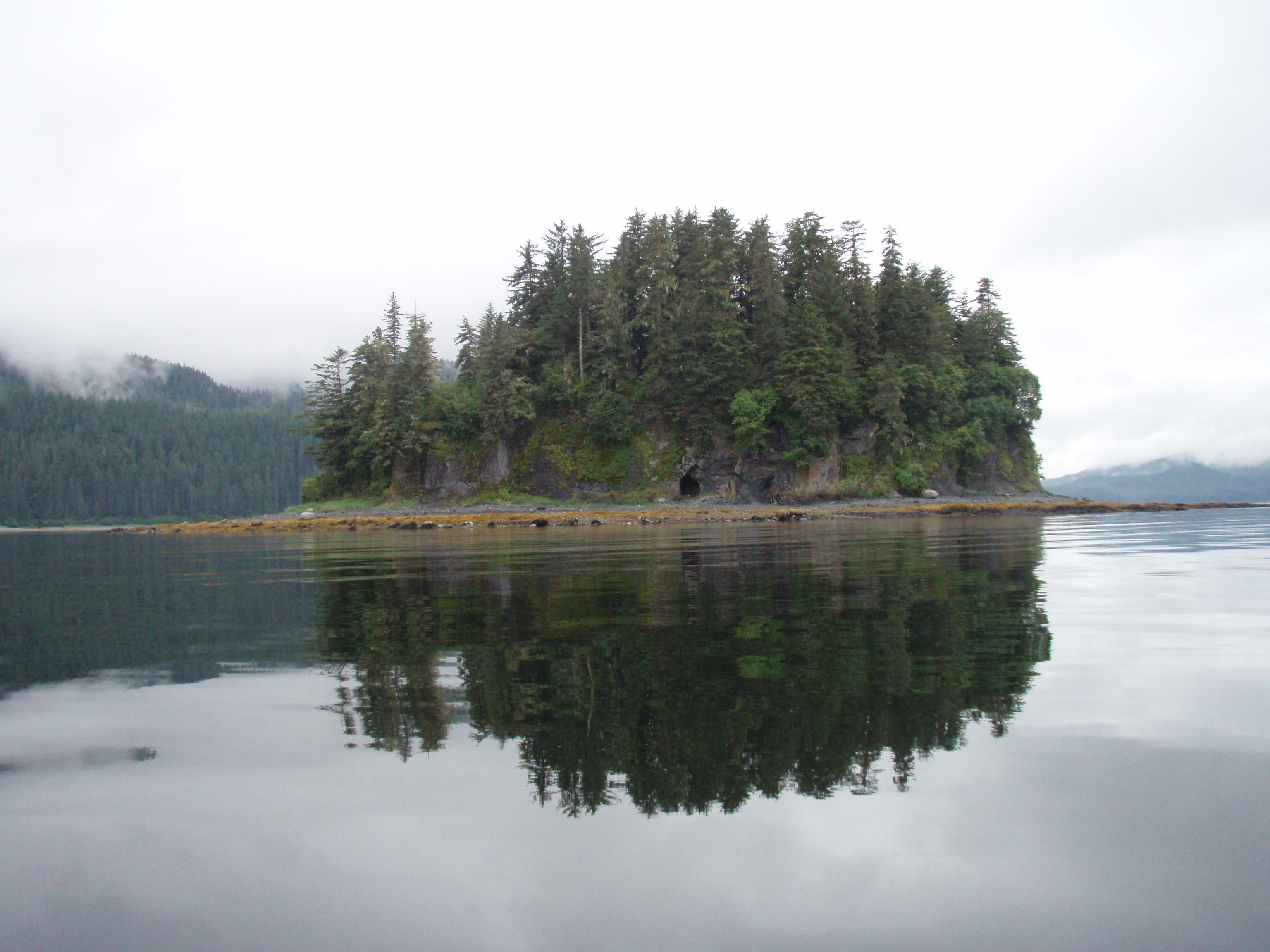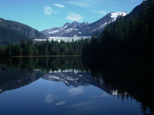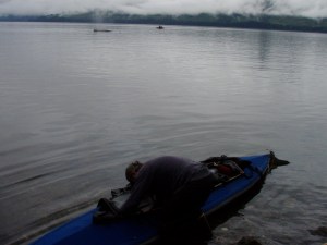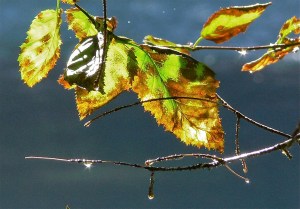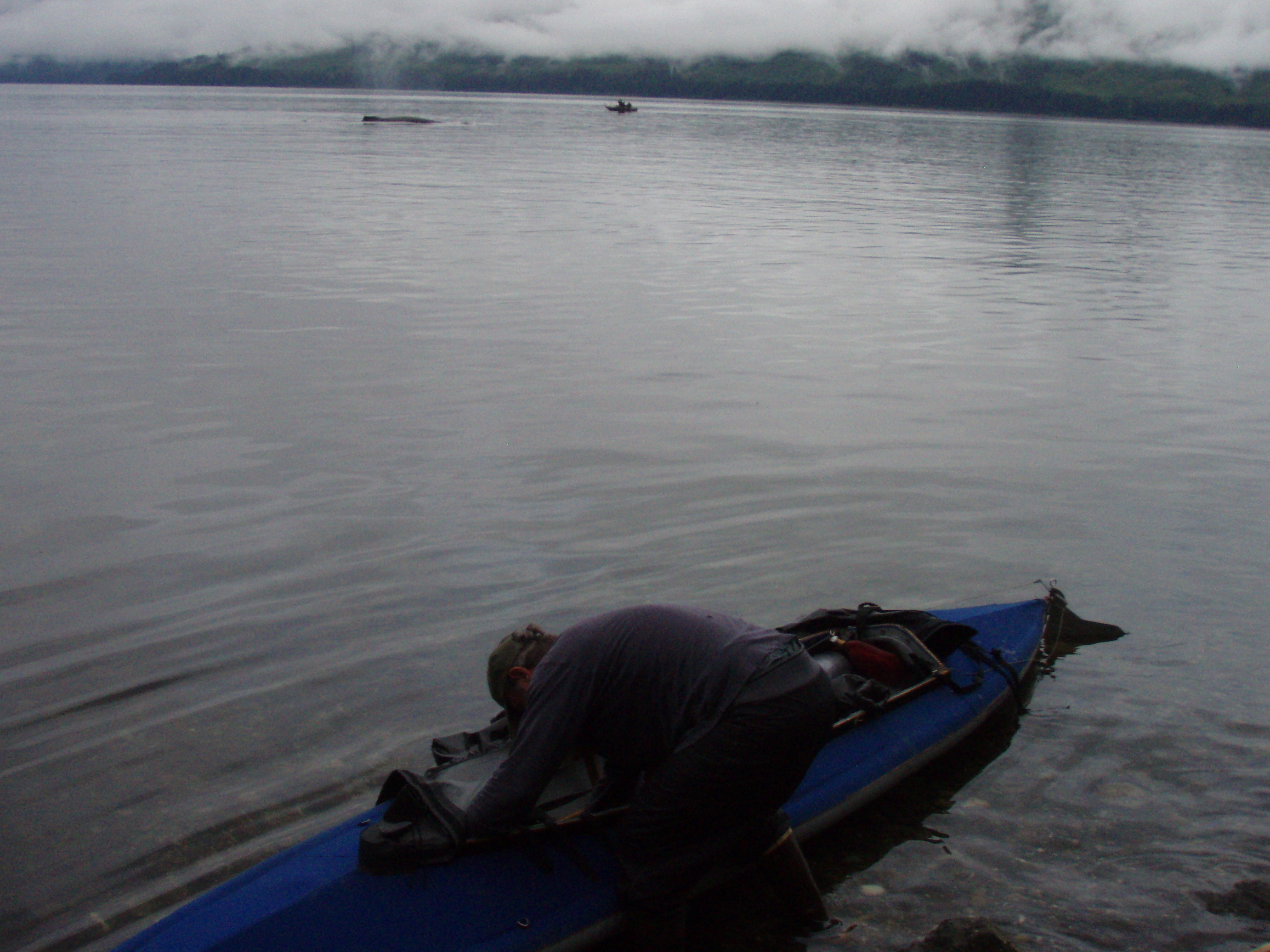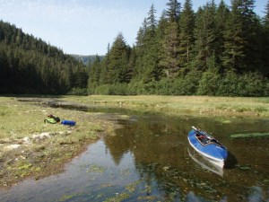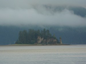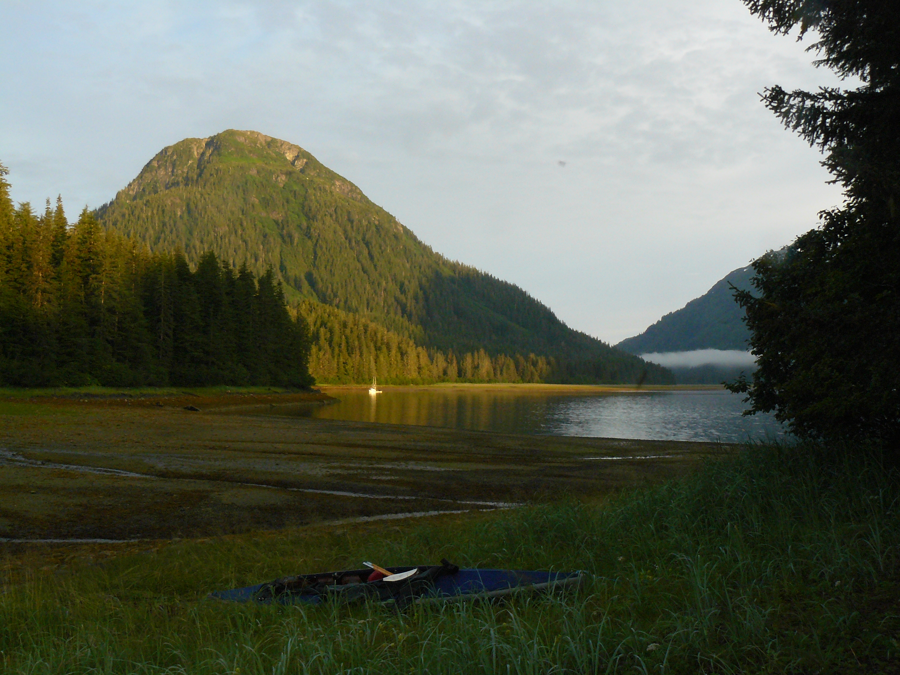 It’s a slow, peace bringing task to follow the sun through these thick woods. We pass an indentation in the moss still steaming from the heat of the deer that just left it. This brings stories from my friend of other hikes and shared kayak trips. An hour and more passes without notice until we regain the man made trail. It takes us to a burned area where a spider web of sinister beauty, backlit by the climbing sun, is the sole decoration in a fire blackened alder tree. Nearby two huge Russula mushrooms, encouraged by the warming sun, push skyward. One wears a mossy cap.