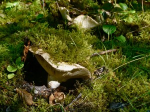 We hadn’t started on a mushroom hunt but rather a morning walk under the newly appeared sun. Water backed up from a growing beaver dam flooded our chosen trail to force us into the Troll Woods where he discovers a Porcini mushroom (Boletus edulis) standing above the mossy ground. Nearby we find tipped over Porcini look a likes that have gills that mark them as a different genus. Another hunter passed this way before us to grab the choicest mushrooms.