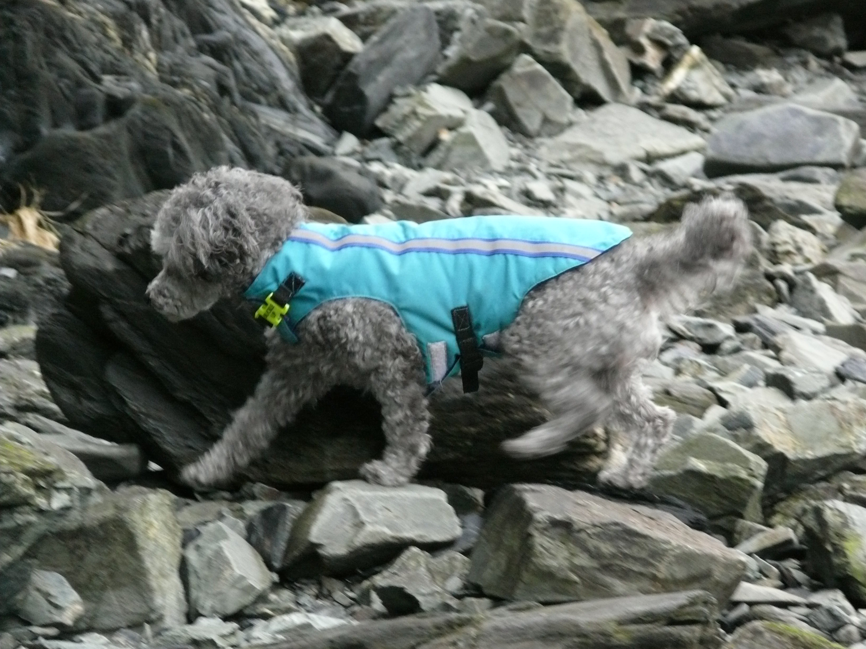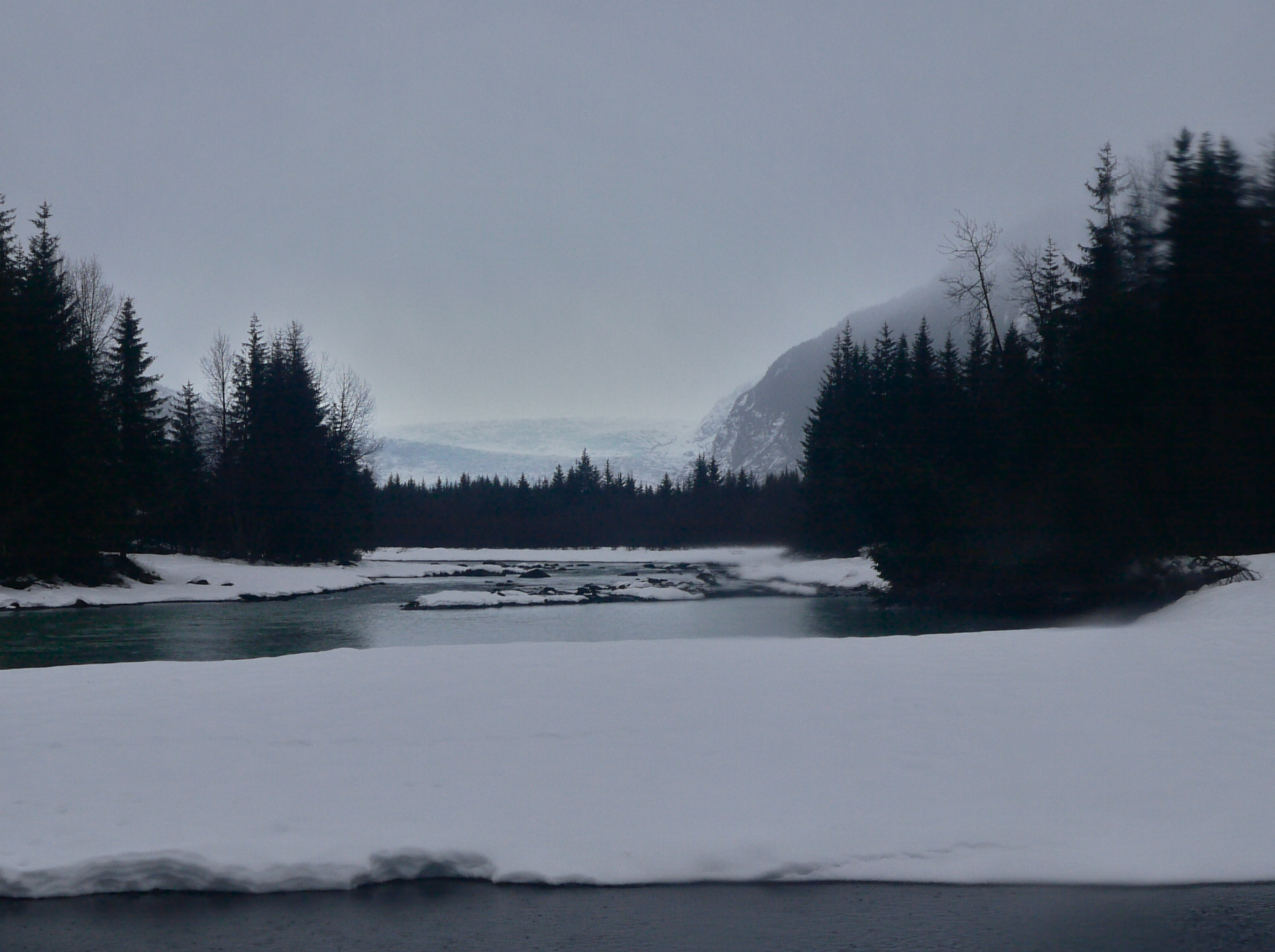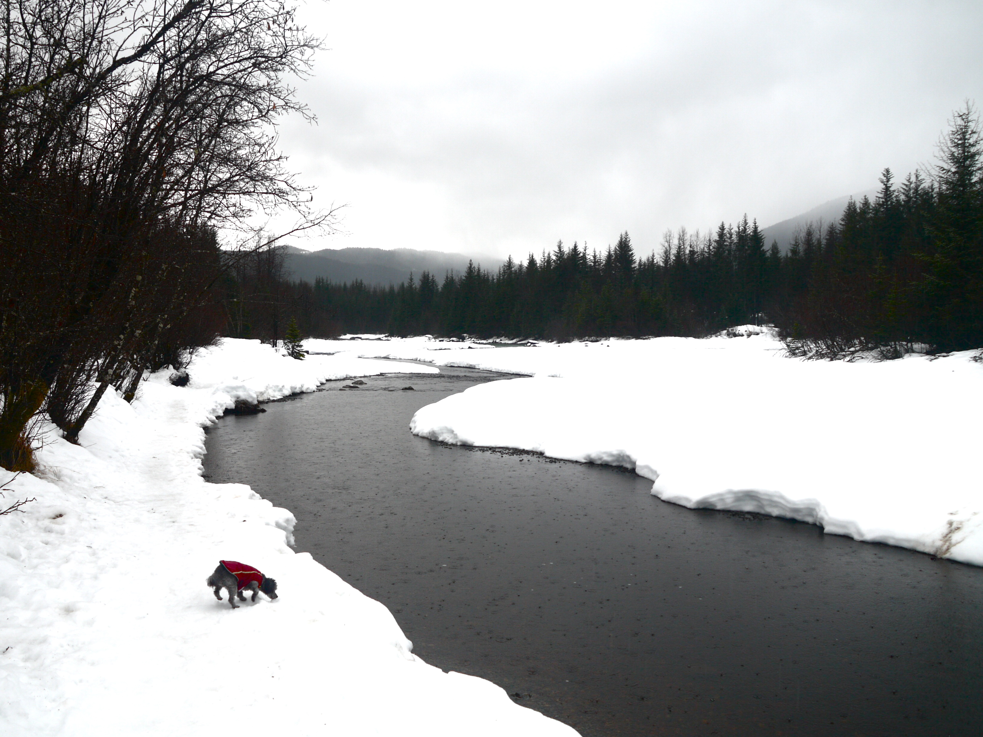Since Aki is nonjudgmental, we don’t test the lake ice but move to the river with plans to follow it to the glacier fronted lake. Others have worn a deep path in the snow cover trail. It’s walls block Aki’s view of the moraine. Rather than dash about as usual she follows in my skis, which find a good balance between slide and grip on the firm surface snow. We make good time to the river but I have to take off my skis to cross where recent washouts denuded the trail.