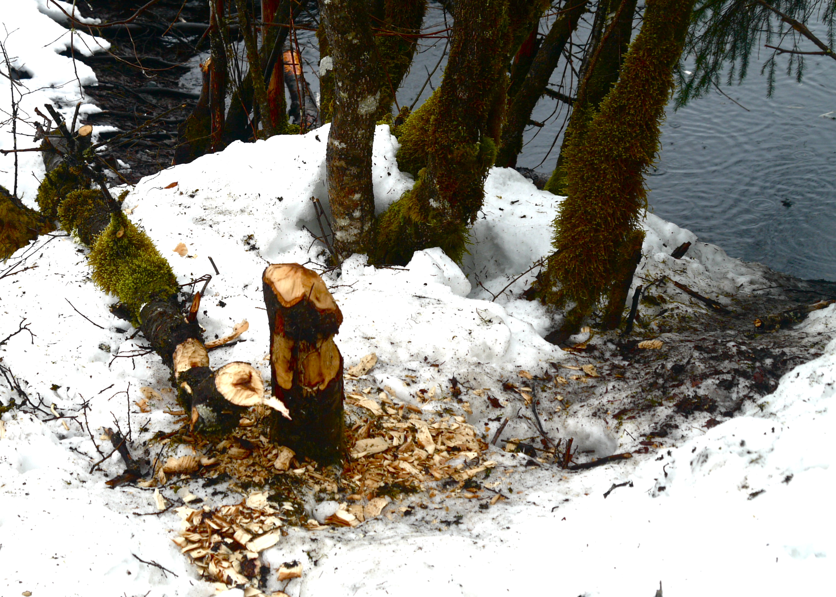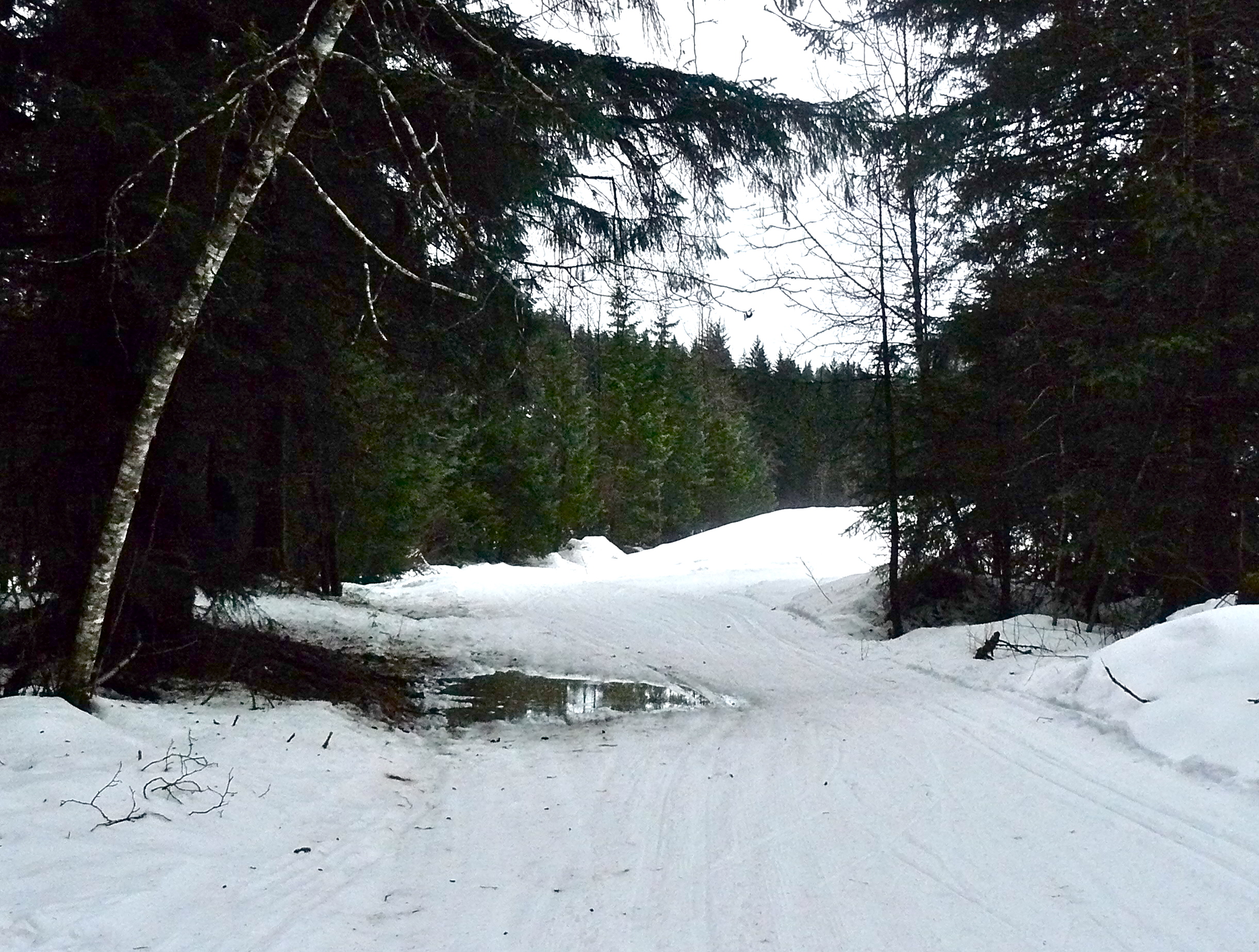 The moraine during a late winter thaw like this offers some danger but also some award. A firm crust covers the snow pack to offer easy access to places normally blocked by beaver ponds. The thinning ice covering the ponds injects the danger. Several times today we chose between safe but cumbersome passage through softwood thickets and sliding freely over ice that may yield over very cold water.