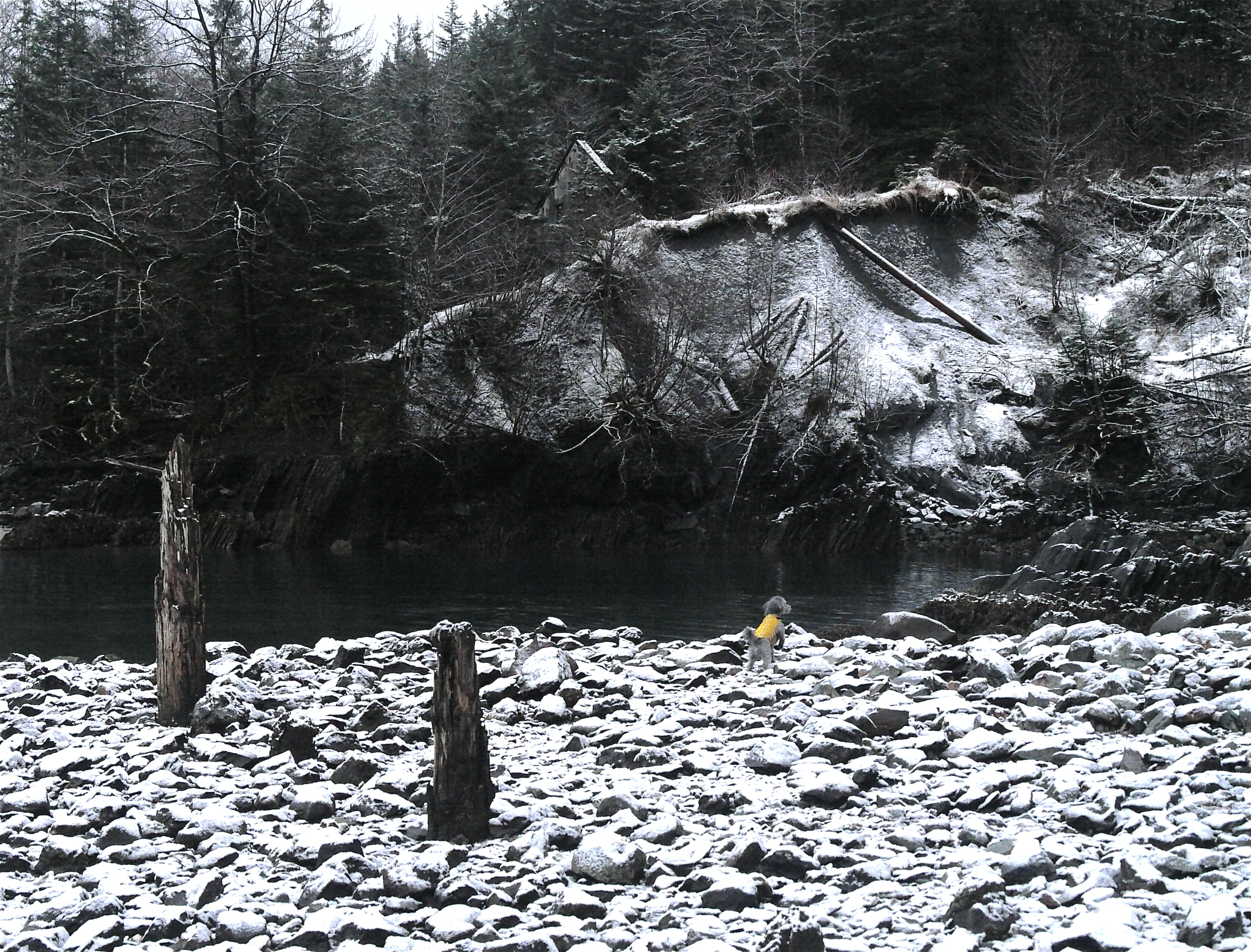 It’s above freezing and the pond ice has that milky translucence of still solid covering. I follow the little dog onto the ice and gain easy passage, no fear, no cracking, expecting no swim at the end. Then I remember that spring ice gave no warning when I fell through it in the past. Like that time on the Aniak Slough when I dropped through an invisible trap door into the mild current until only my right hand, gripping a canoe paddle remained above water. There, stretched out to full length, I didn’t feel fear or panic, just a detached appreciation for the lovely light penetrating through thinning ice and the wisdom of the elder that made me always carry a canoe paddle on spring crossings of the slough. The canoe paddle, extending from my little circle of open water to firm ice made it possible to escape the water and reach the wood stove warmth of our cabin. Today we need no warm place to dry out. The ice holds.