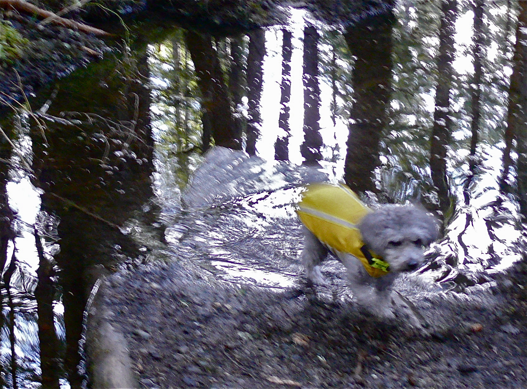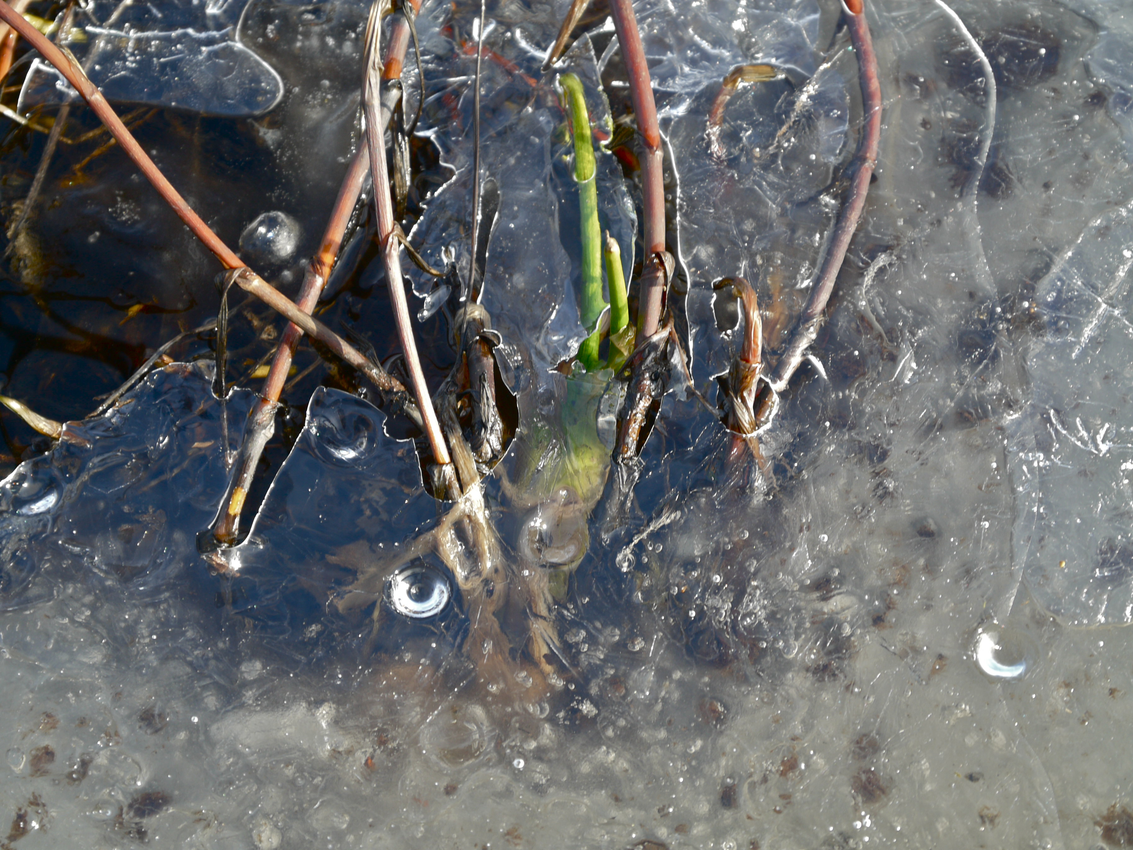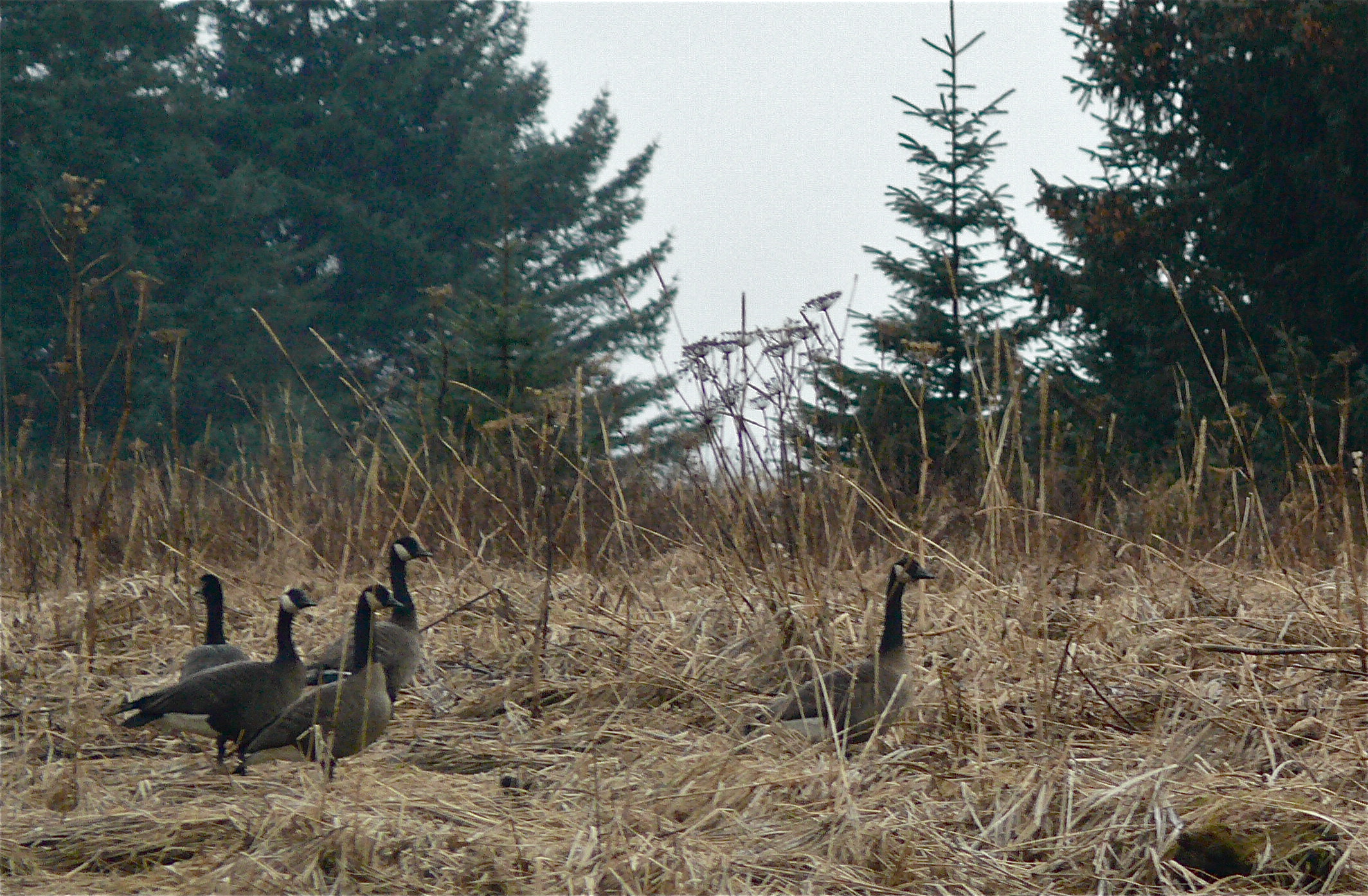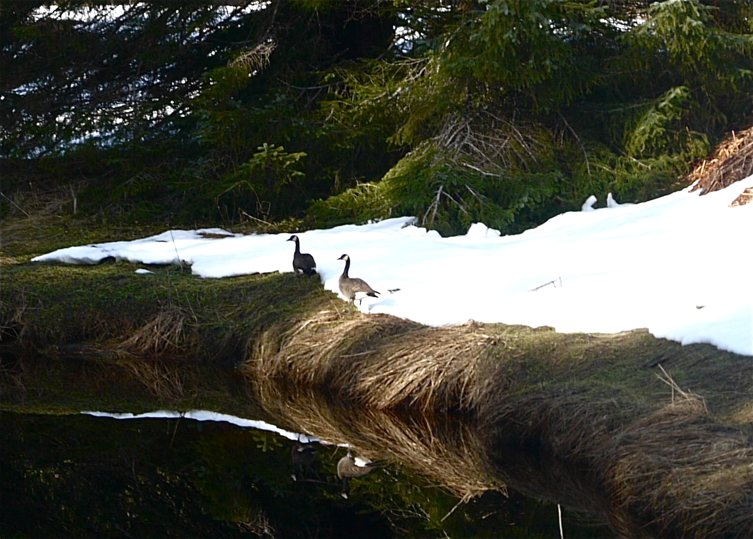 We hoped to purchase some solitude and views of Canada Geese by taking this ice covered trail during a rain storm. As expected rain water covers the ice in a glistening clear blanket that would have made the trail unusable but for the winter’s worth of dropped hemlock needles allowing my boots purchase.