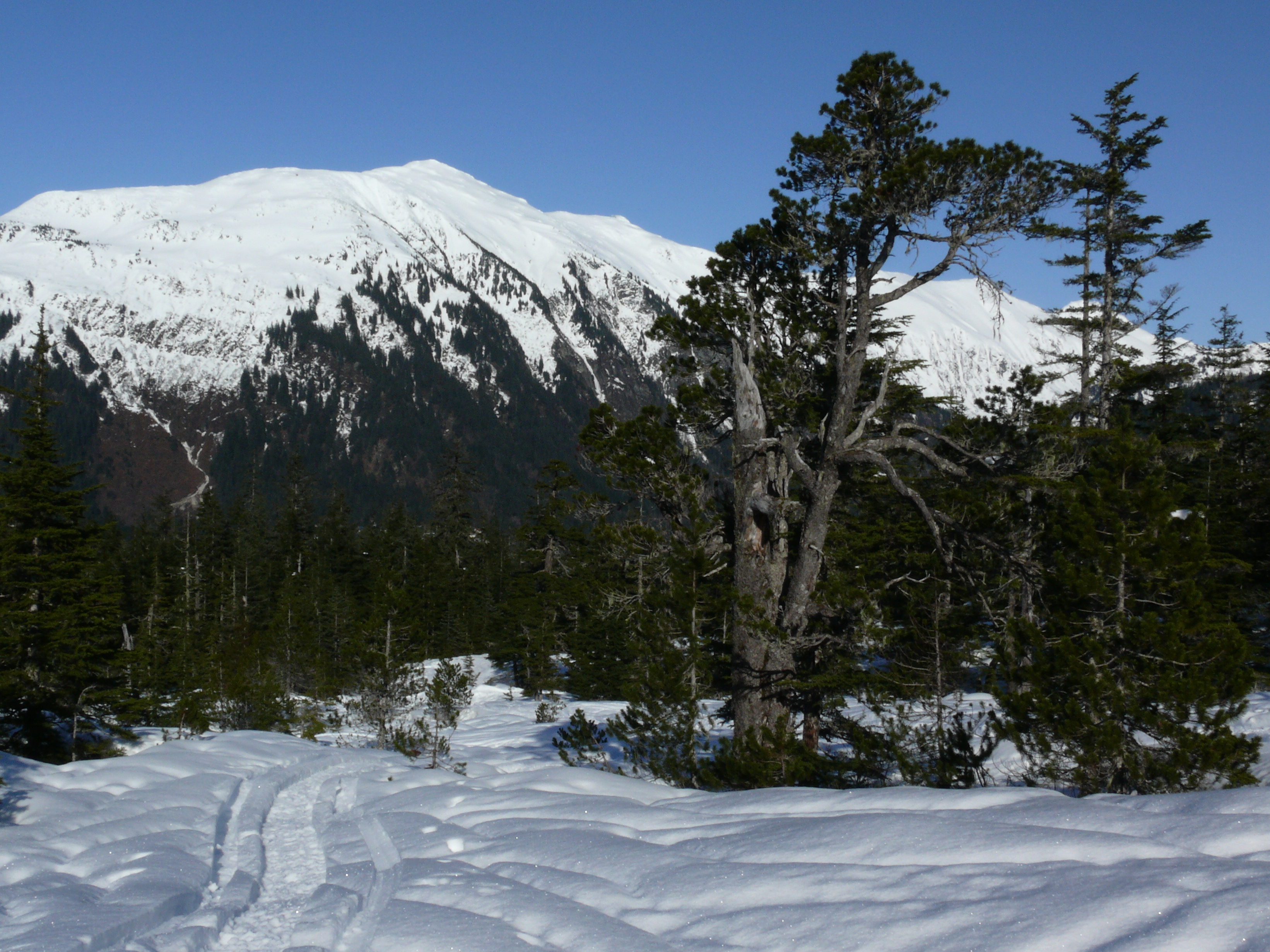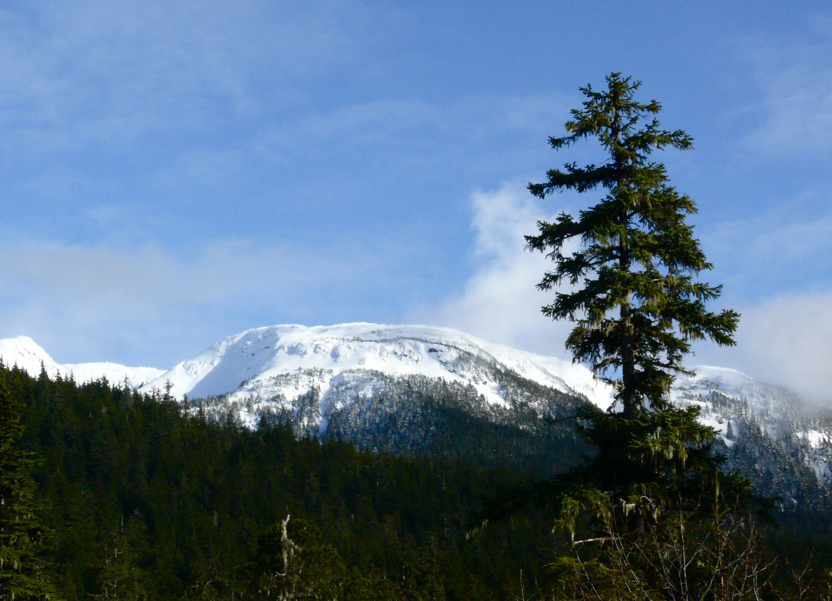 Moving across the meadow we reach a gently sloping beach of sand bordering the perfectly still waters of Lynn Canal now reflecting a murder of crows flying toward the river. A smaller gang of the black birds have assumed station at the top of a beach side spruce to wait for the abundance of low tide.