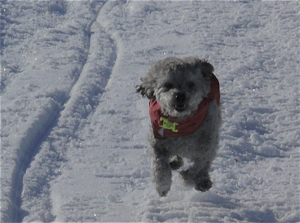 Reaching an open meadow we find a clump of the calming geese feeding alongside the trail ahead. They are all business at first but then one of their unit stops feeding to watch our approach. Aki, no fool she, is not interested in messing with these big wild birds. Even though we try skirting them at a distance, the geese eventually take flight and move on to the next tidal meadow. Now we hear geese warning calls coming from across the river, giving advanced warning of the approach of several formations of Canada Geese that fly overhead to join their just departed buddies 300 meters away on the other meadow.
