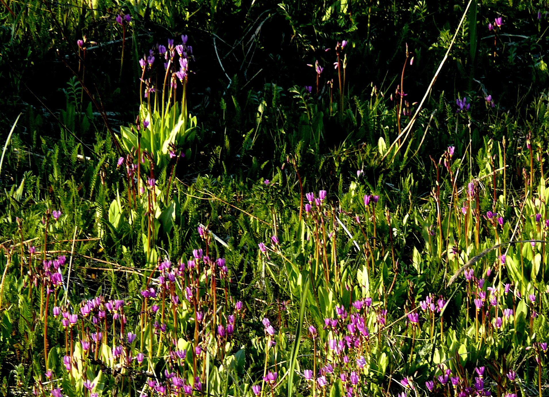 Aki and her dog buddy seem unaffected. Yesterday, or was it the day before, we took them up a forest trail, crossing several small streams with the careful asymmetry of a Japanese garden, until reaching a pocket meadow dotted with stunted pines. For the dogs we could have been on any trail frequented by other dogs that leave behind signature smells. I hoped to find the magenta flowers of a Shooting Star. Even this long stretch of good weather couldn’t force that miracle in May.