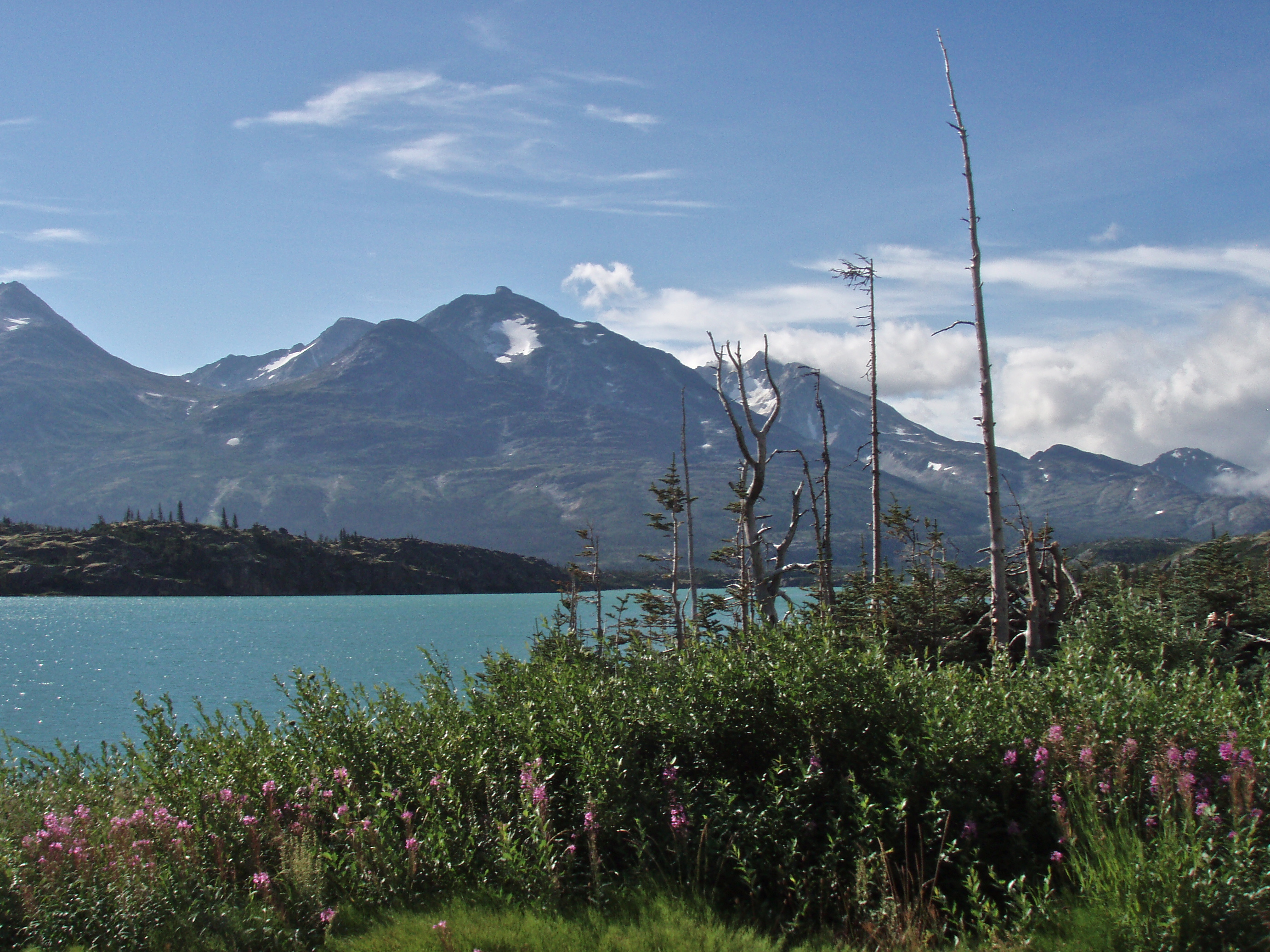 With a waive of the custom agent’s hand we are released onto the Klondike Highway to pilot the heavily laden bikes into Carcross, YT. Pedro, my 30 old Trek 520 soon settles down. We milk a tail wind for much needed help while climbing endless steep bumps that make hard work out of the descent from White Pass into Carcross. It’s hot for the mountains and sunny. We are always thirsty. The sun and deep blue sky bring out the beauty of the landscape—at first a broad flat valley of granite and shallow lakes boxed in by steep peaks, then walls of trembling poplar leaves until we reach the long blue waters of Tutshi Lake. For the rest of the day its all light brown scree slopes plunging into lake waters.